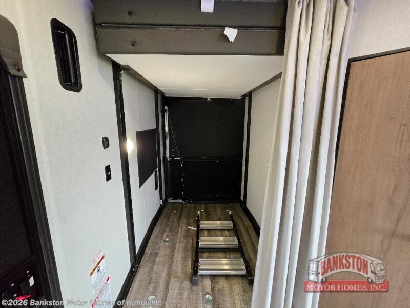 Every part of this toy hauler is maximized for utility and comfort! The Happijac bed lift system bunk beds can be set up within minutes of arriving at your destination. Behind the entertainment center with a fireplace is a large pantry for your snacks and across from it is a sofa and booth dinette slide. You can switch out the sofa for an optional theater seating if that fits your needs better. Freshen up in the rear corner bathroom then head to the front private bedroom to change your clothes that are store in the wardrobes on either side of the 67" x 74" Wolf Pack king bed. You will be the talk of the campground with the "party patio" that has outside TV hookups. Plus, there is an outside kitchen for sunrise breakfasts!