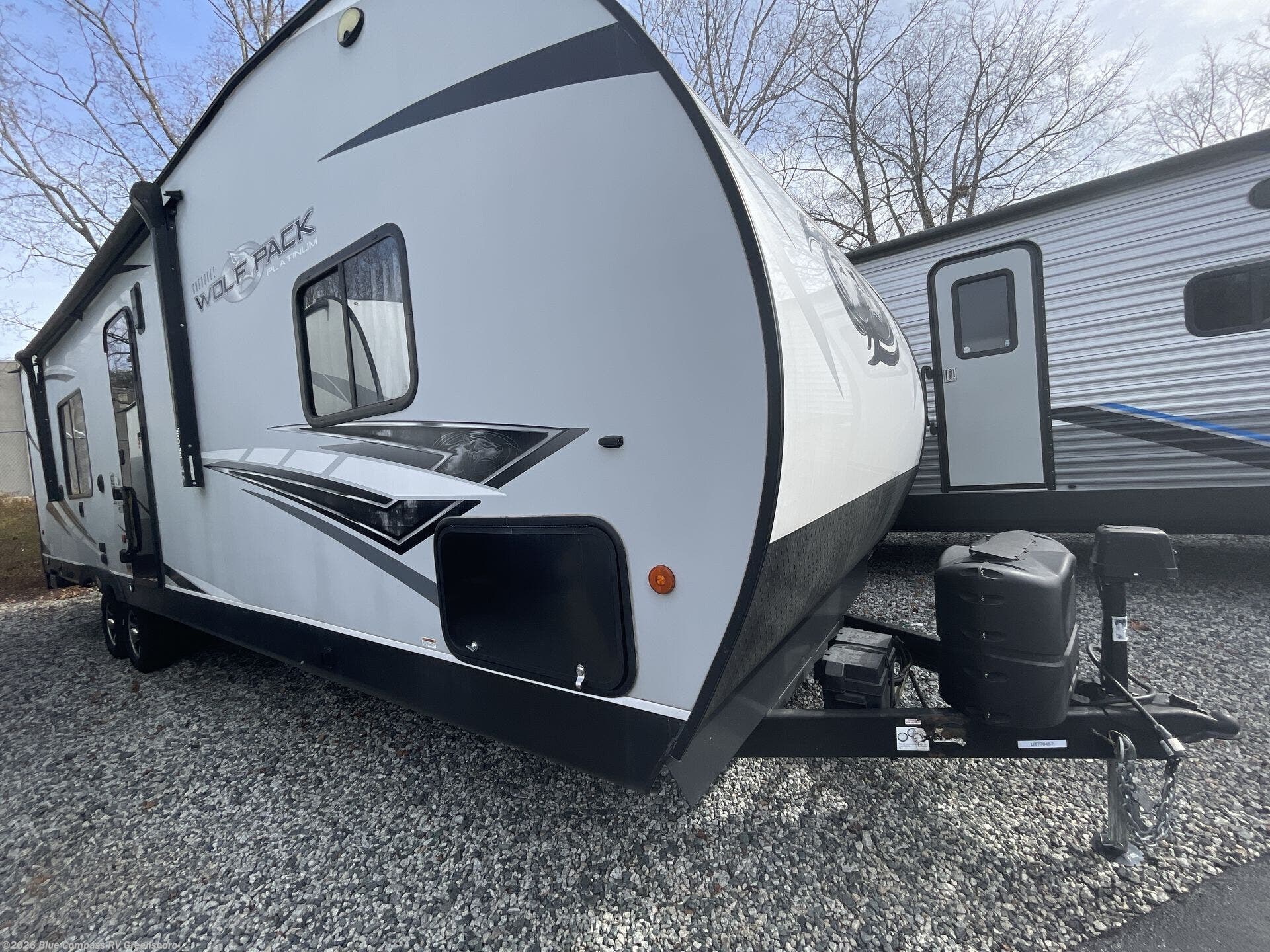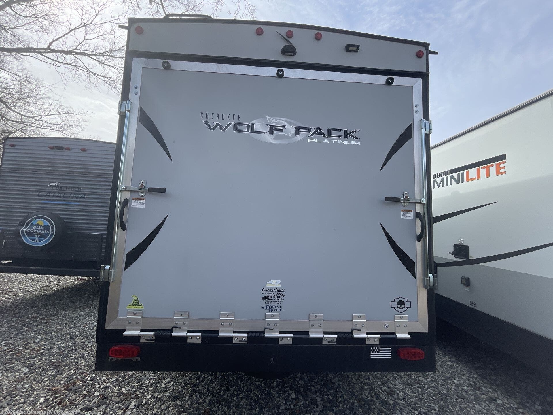 Each one of these Forest River Cherokee Wolf Pack Gold toy hauler travel trailers are built with quality construction while staying budget friendly! The 102" widebody design allows for more features to be packed in and more space to freely move about the inside. The forced air heated underbelly and enclosed holding tanks protect your unit's vitals from all weather conditions. With a rear canvas screen/tent wall, you can bring in some fresh air without bringing in the bugs. Safely enter and exit with a large exterior folding grab handle, easily load up at night with an external high output LED loading light, and rinse the mud off your feet before entering inside using the outside shower with hot and cold water. Come find your favorite one today!