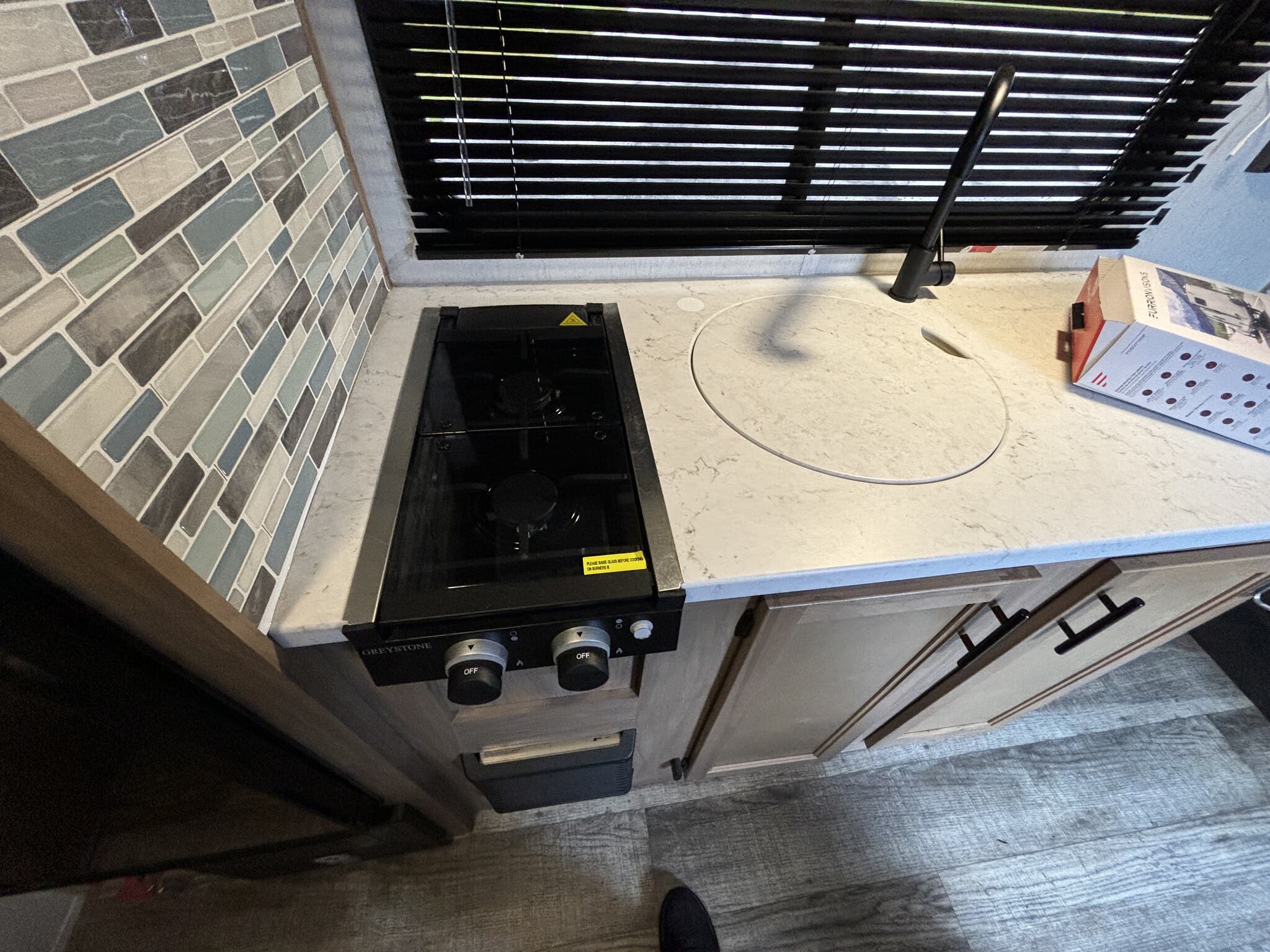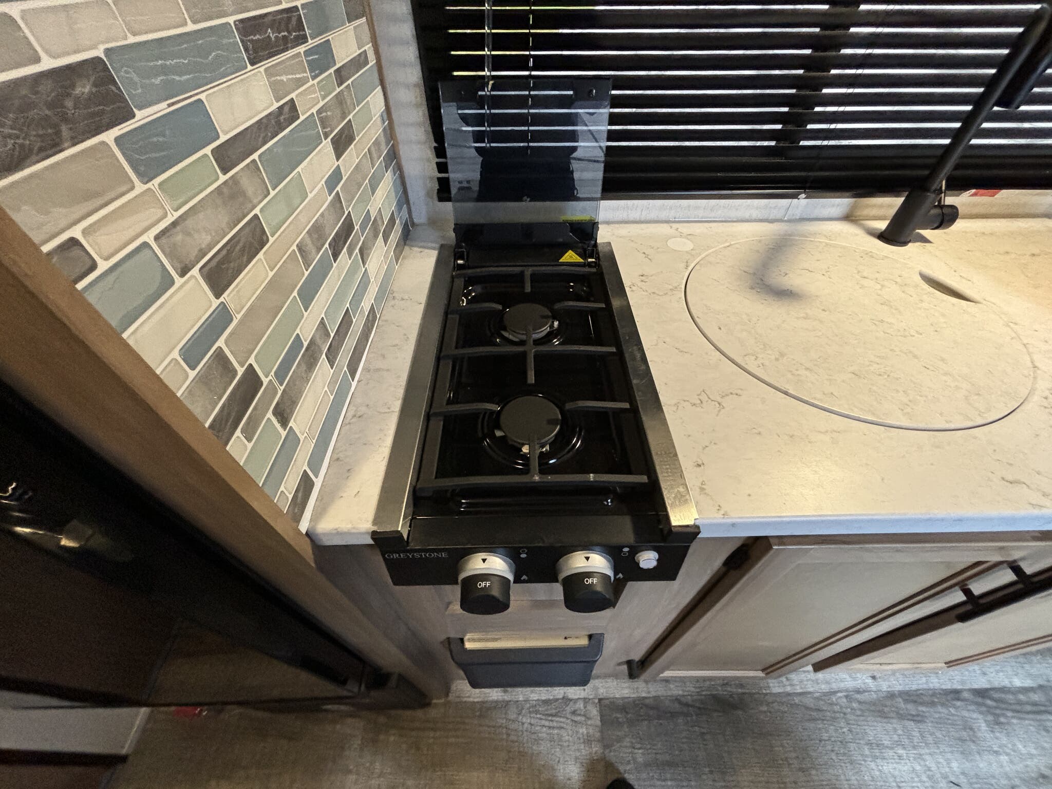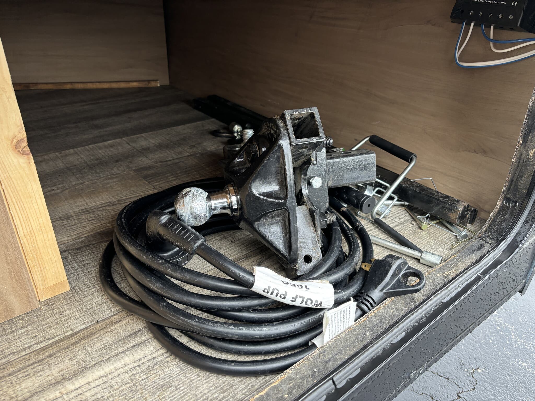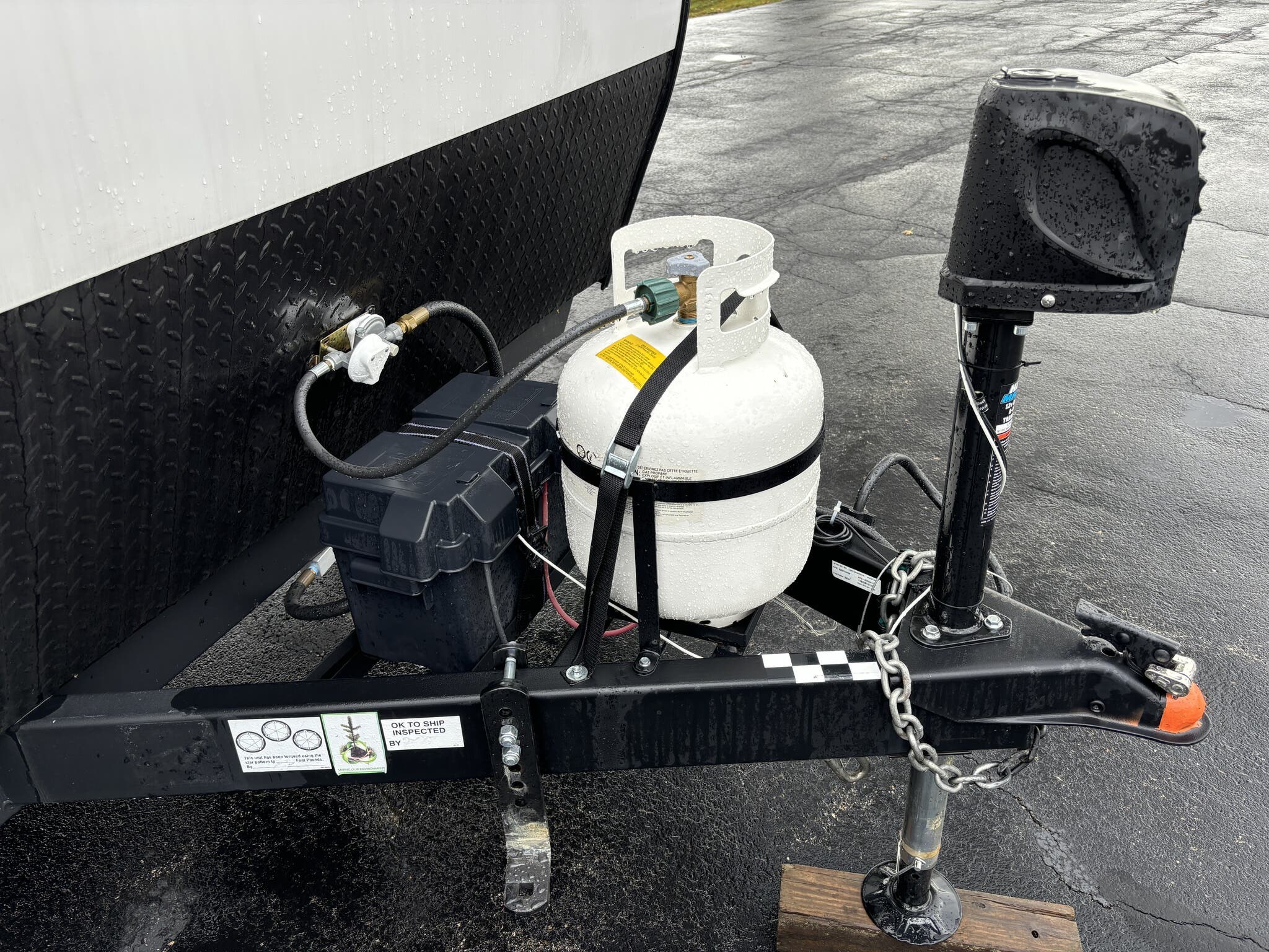 Trailer is equipped with power awning , stab. jacks , micro oven , 2 burner gas stove top , water heater , gas furnace , AM/FM stereo radio with out side speakers , monitor panel , out side refridgerator , rear camera , battery pack , spare tire , aluminum wheels , power tongue jack , solar panel on roof , out side gas grille hook up , and complete hitch