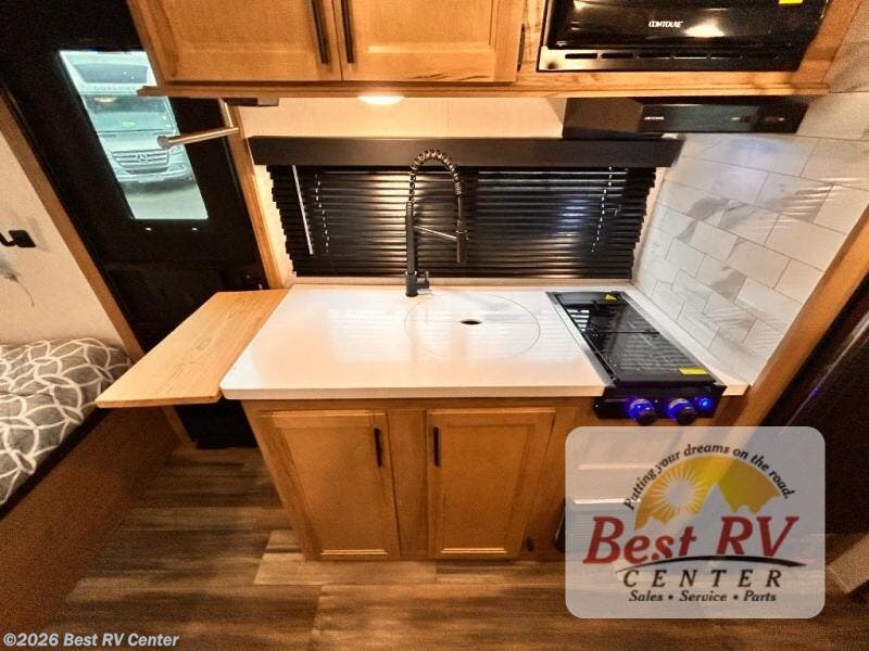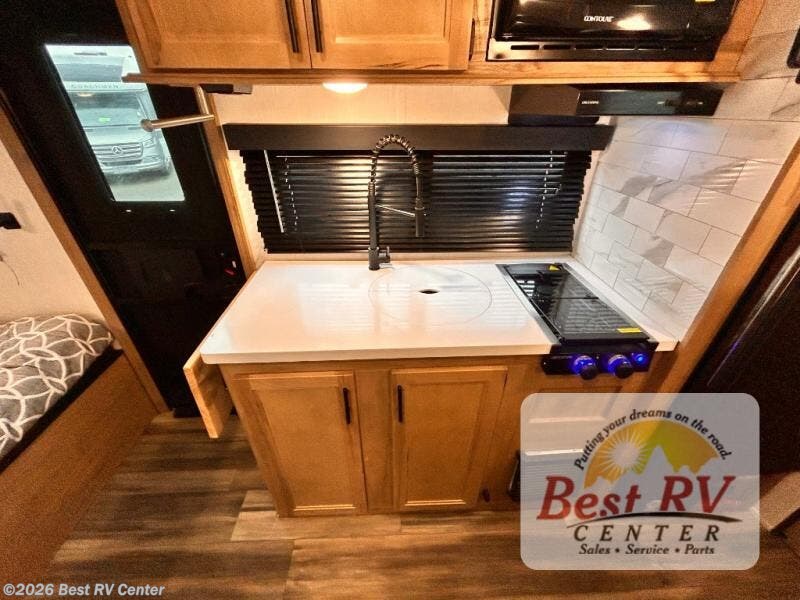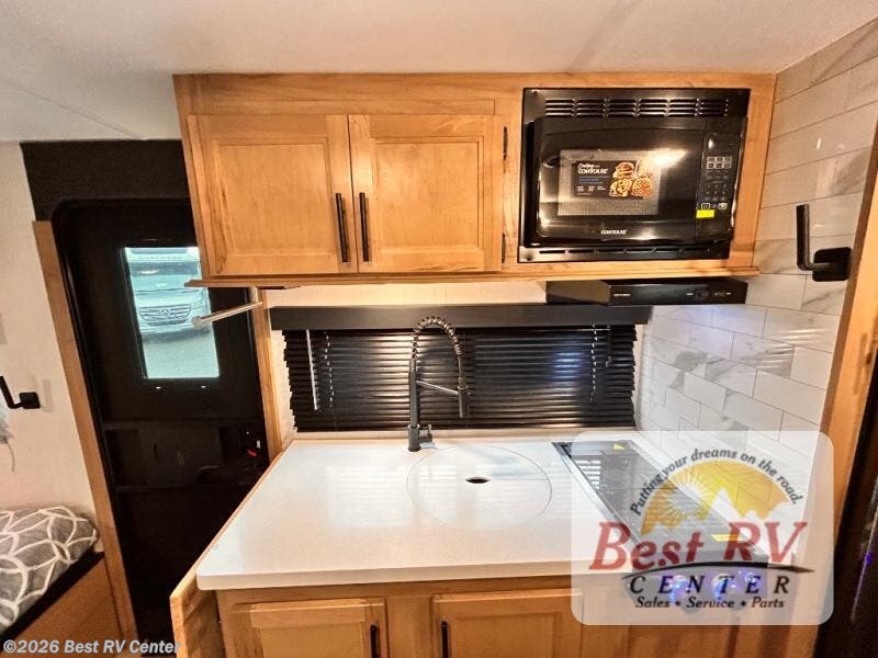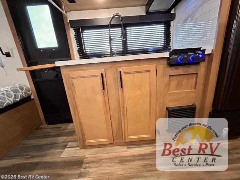 Enjoy a home away from home with this travel trailer! There is a front queen bed with a pillowtop mattress to lay your head on at night and the kiddos can sleep on the set of bunk beds in the rear with a TV mount location for extra entertainment on those rainy days. They will also appreciate having the rear corner bathroom so close to them at night. The chef can either prepare their meals indoors with the high output cooktop or at the outside mini kitchen, and the large stainless steel kitchen sink inside will make cleaning up easier. You can enjoy your meals at the booth dinette, play games, and even transform it into an extra sleeping space!