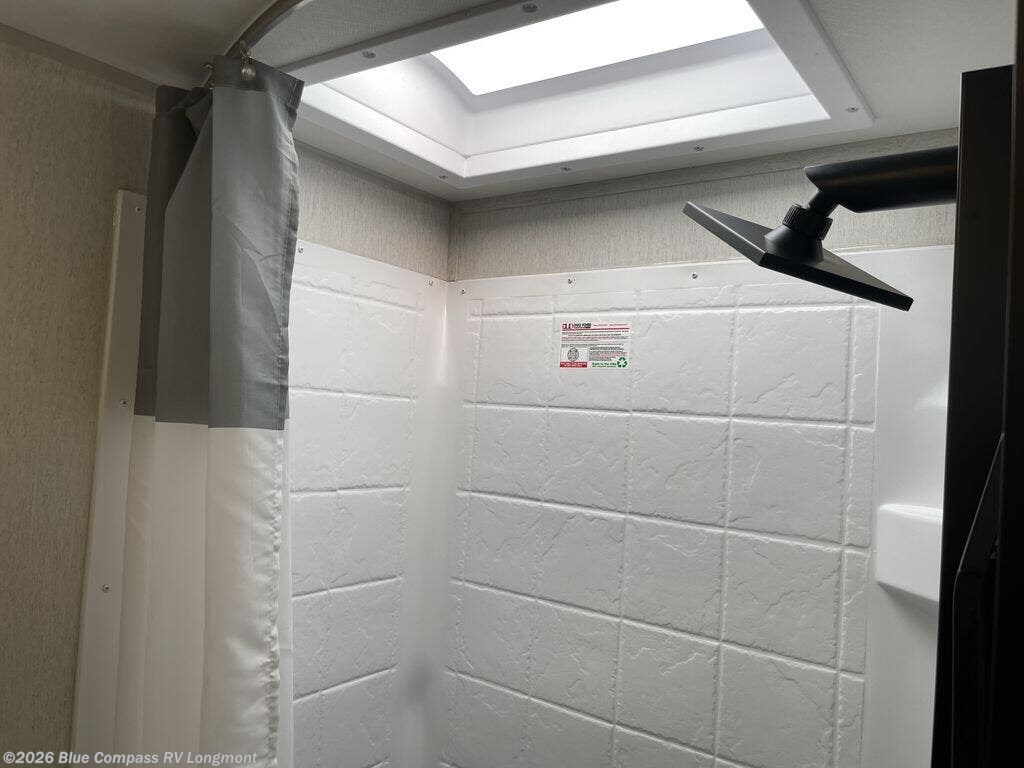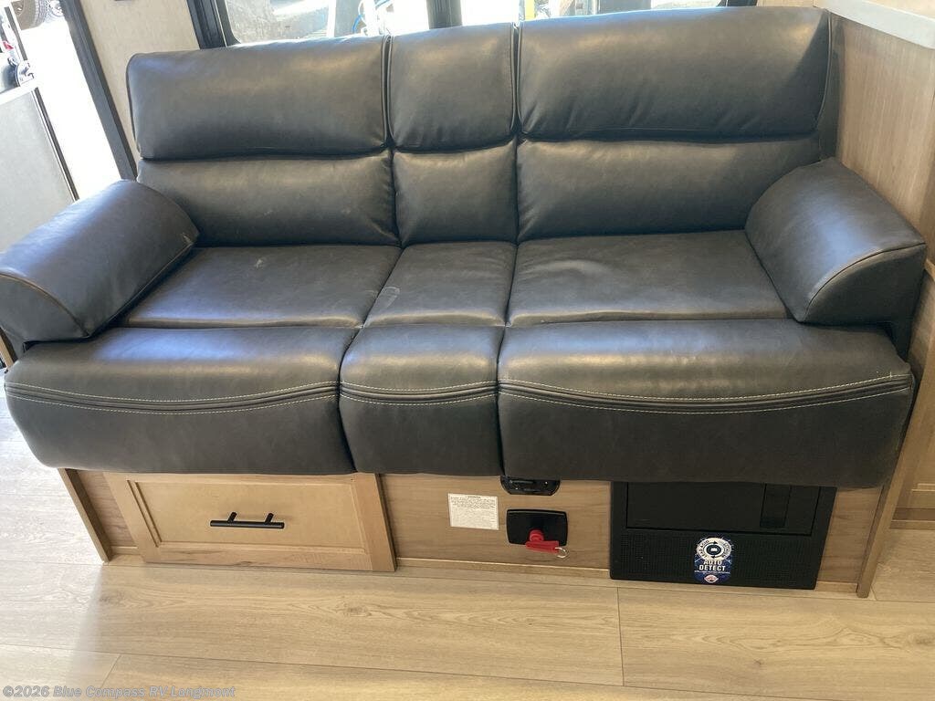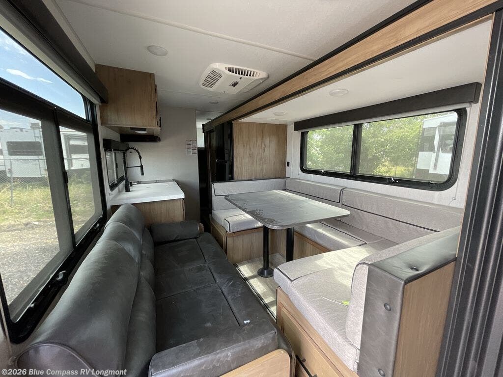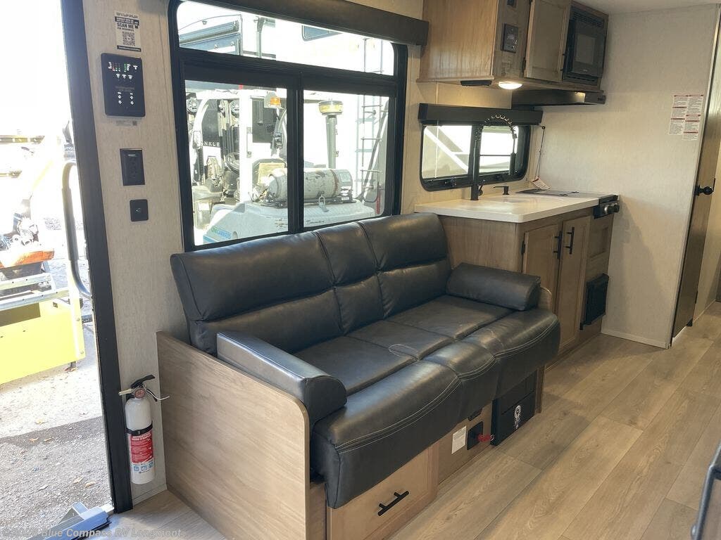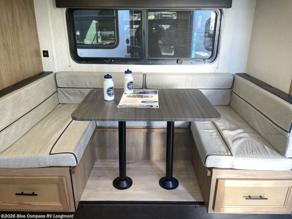 Sleeping for nine or ten is made easy in this Wolf Pup Black Label model with large bunks in the rear of the unit, a queen bed up front in the private bedroom with dual sliding entry doors, as well as when using the furniture once converted. The u-shaped dinette allows you to dine comfortably for meals, play games when indoors hanging out, and even use as a bed for two. There are large storage drawers beneath both side seats to store games, extra pots and pans, or whatever you need. The sofa opposite also flips into a convenient bed when needed. Storage is in abundance in this Wolf Pup model with a large storage door that can be accessed inside by flipping up the bunks or from the outside storage plus door. More outside storage can be found up front, and on the inside you will find a large pantry, overhead cabinets, plus wardrobes in the front bedroom for your clothing. The tub/shower has an overhead skylight to let in natural light, provide a bit more head room, and give you a glimpse of your day when you wake. You will also enjoy great views through the large panoramic windows above the dinette and sofa.