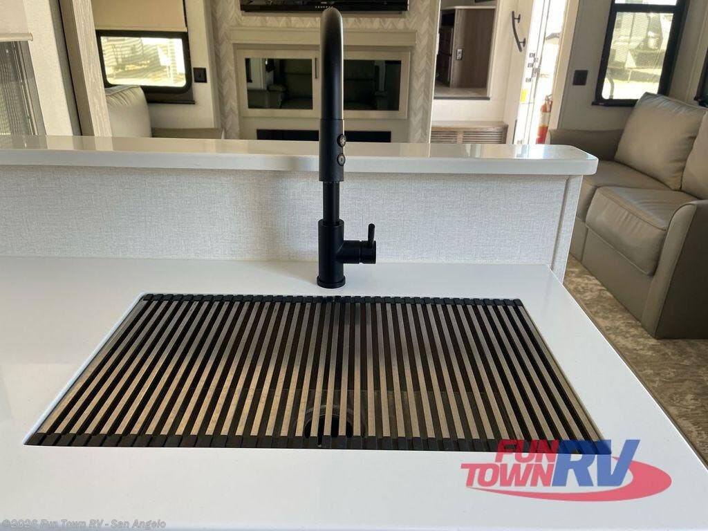You won't believe all that this fifth wheel has to offer! Starting with the rear kitchen which has plenty of countertop space to prepare your delicious meals, a four burner cooktop with an Insignia 24" residential oven to cook them, and a deep-bowl stainless steel sink for easy clean up. The living area has opposing tri-fold sofas and a 60" theater seat with USB charging and storage across from an entertainment center with 50" LED TV. The half bathroom is close to the living area so you can get back to watching your movie faster. You will feel right at home sleeping in the master suite on a slide out king bed across from a dresser and bench where you can sit while you put on your shoes, plus entrance into the front full bathroom. Inside the bathroom, you will find a vanity with dual sinks for two to get ready at once, a large signature spa shower with a teak flip up seat, and a front wardrobe that has an area prepped to add an optional washer and dryer!