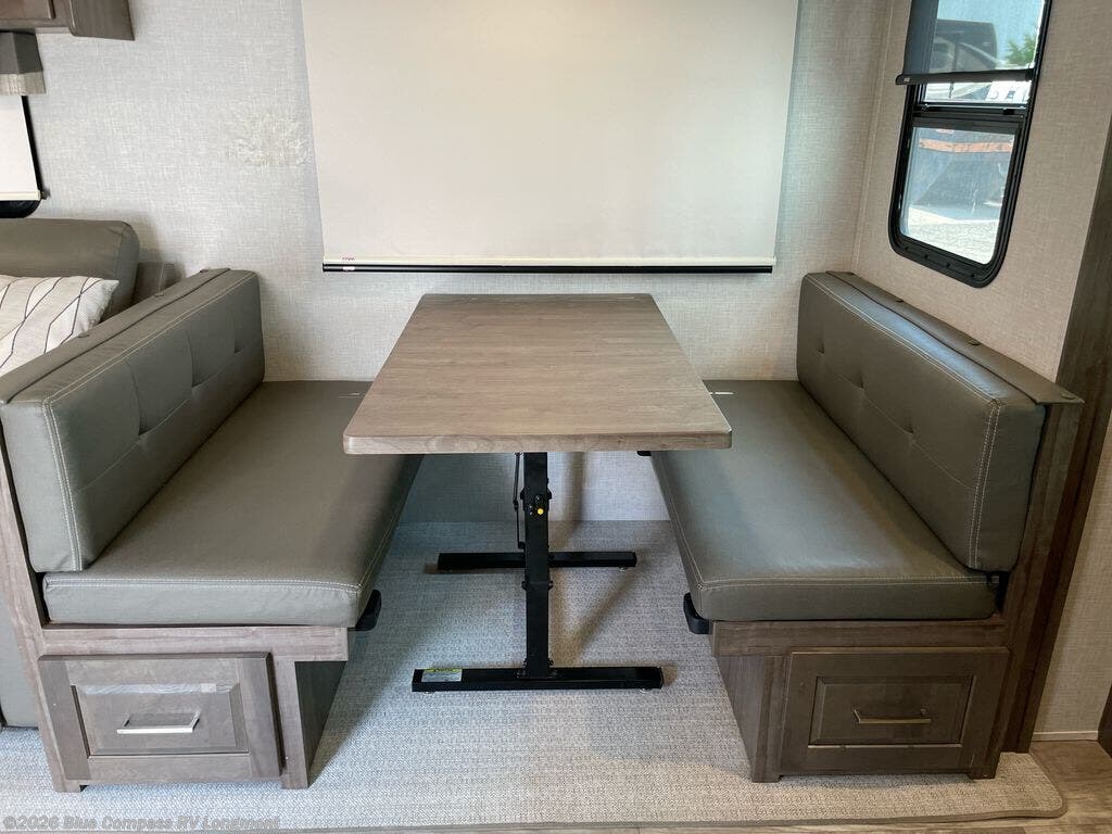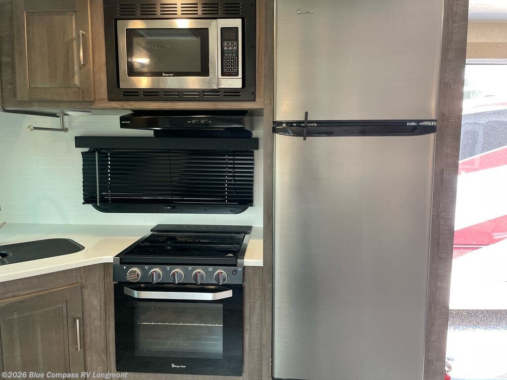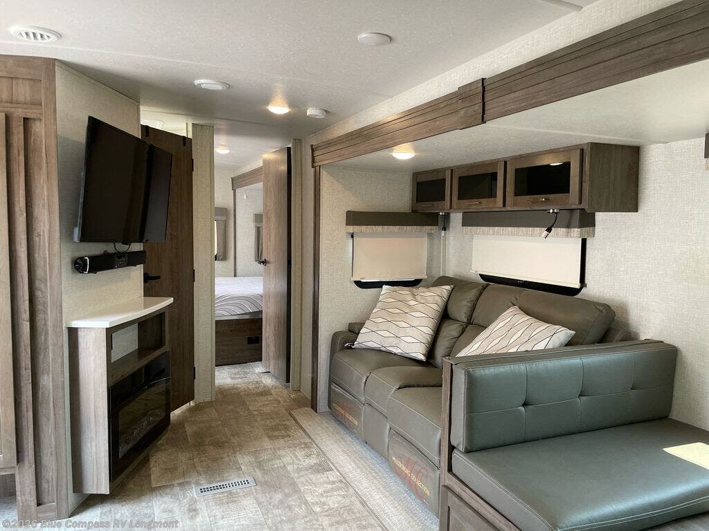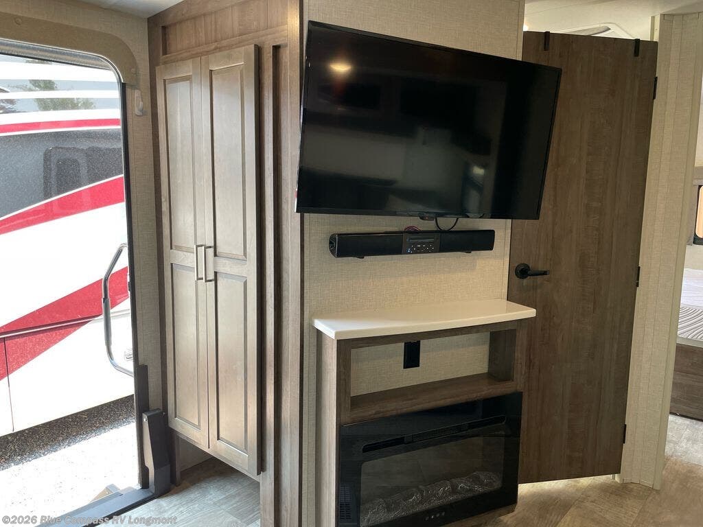 This is the perfect couples trailer with a spacious living and kitchen area and a rear bedroom which includes the second exterior entry/exit door! The bedroom also provides a slide out queen bed, a wardrobe and an optional TV, plus windows for great views and access to the double entry bathroom. The front kitchen gives the cook counter space and cabinetry for dishes and such, plus all the appliances needed to make warm meals and store leftovers. You can dine at the booth dinette, relax on the 67" theater seating and watch the LED TV while enjoying the fireplace.