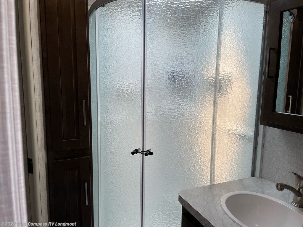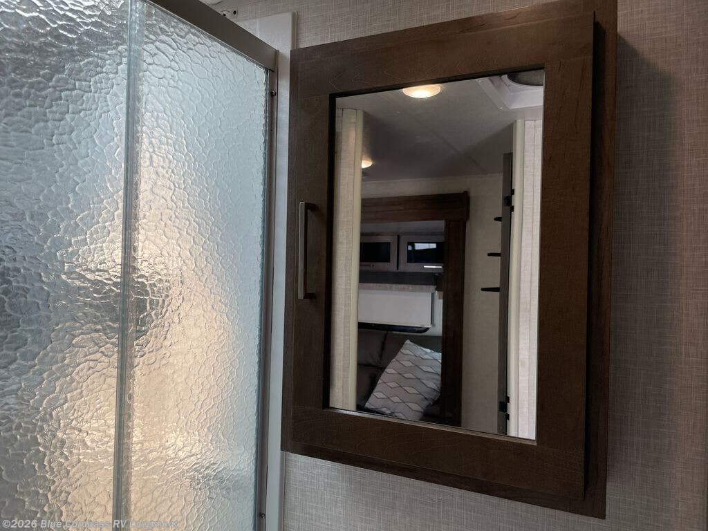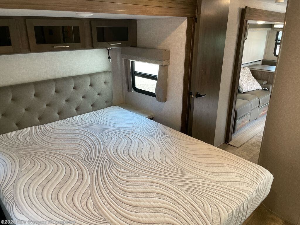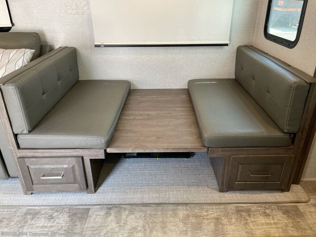 This is the perfect couples trailer with a spacious living and kitchen area and a rear bedroom which includes the second exterior entry/exit door! The bedroom also provides a slide out queen bed, a wardrobe and an optional TV, plus windows for great views and access to the double entry bathroom. The front kitchen gives the cook counter space and cabinetry for dishes and such, plus all the appliances needed to make warm meals and store leftovers. You can dine at the booth dinette, relax on the 67" theater seating and watch the LED TV while enjoying the fireplace.