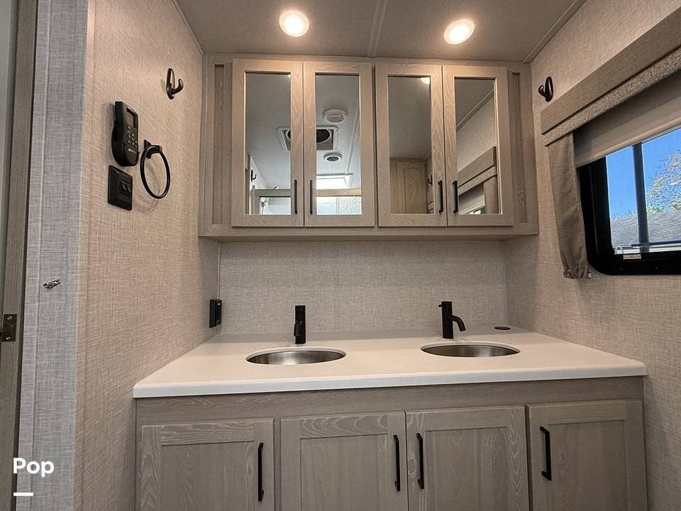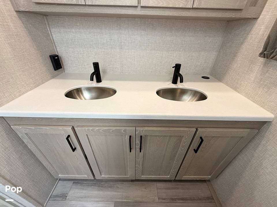 In the private bedroom, a king-size bed set in a slide-out enhances space and comfort, complemented by reading lights, power outlets, and ample under-bed storage. The luxurious rear bathroom features a walk-in shower with a seat, a dual-sink vanity, and a porcelain toilet, offering a true home-away-from-home experience.