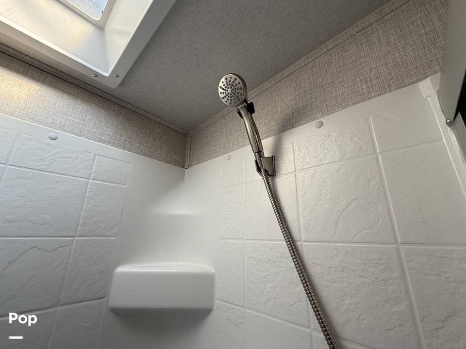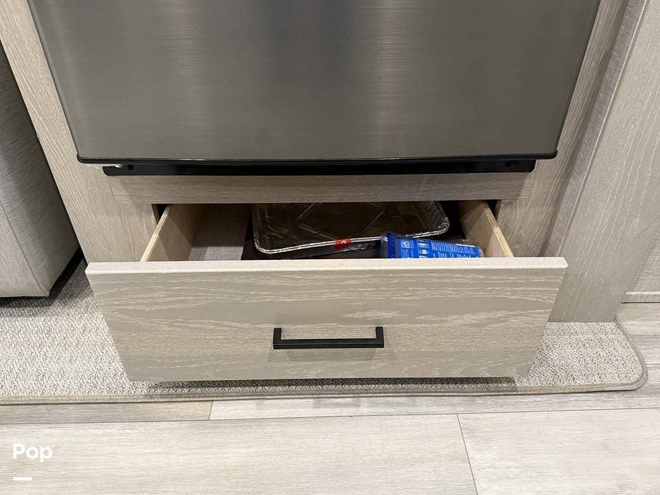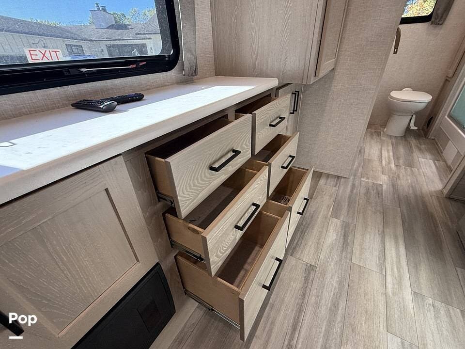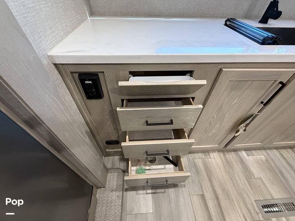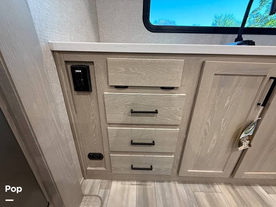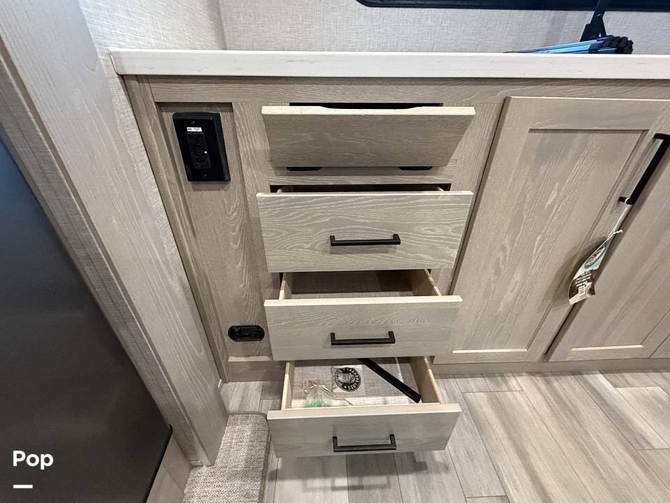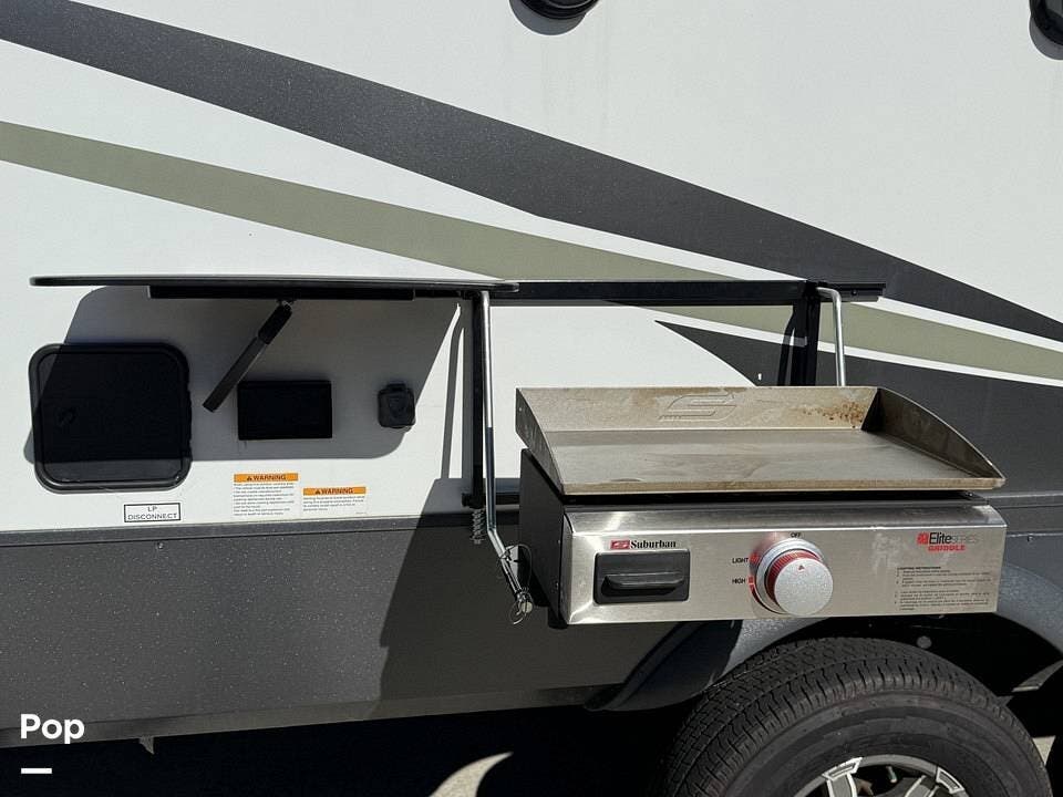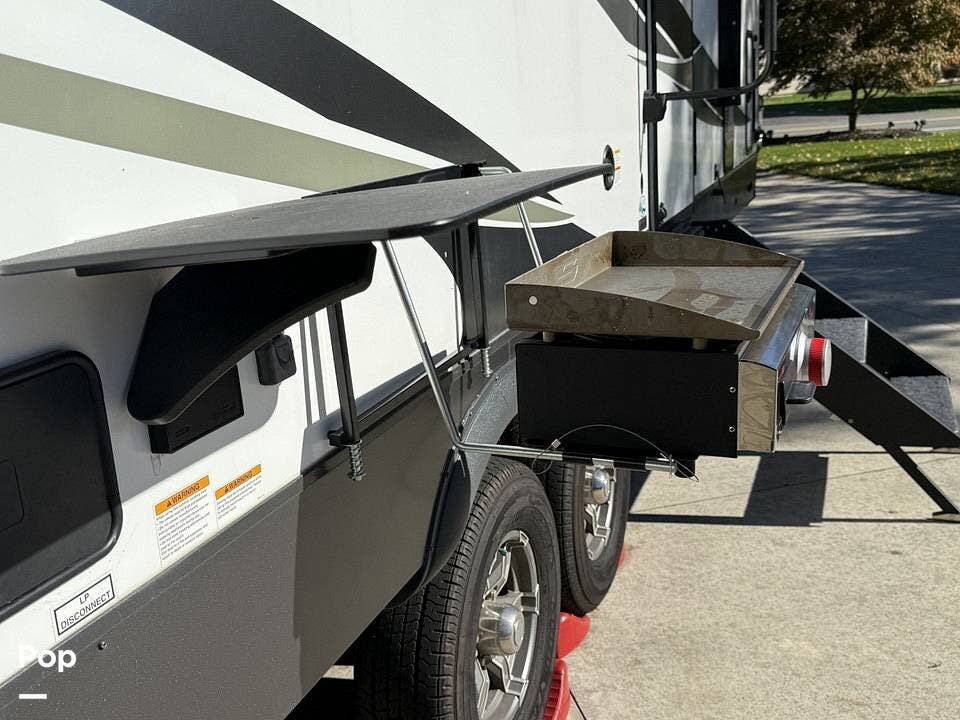 Outside, you'll find an inviting setup for outdoor living, including a mini-fridge, LP griddle with a work table, and a hot/cold shower. A power awning with LED lighting, frameless windows, and slam-latch baggage doors enhances convenience and upscale appeal.