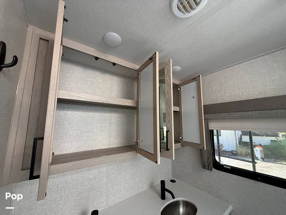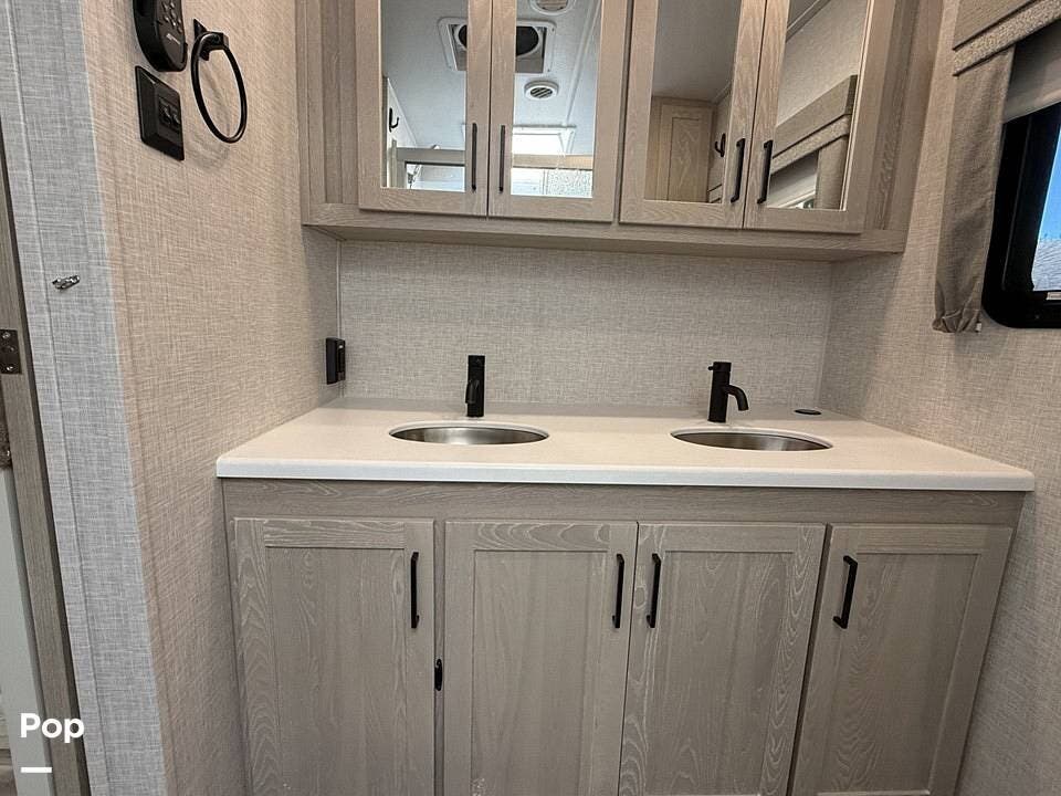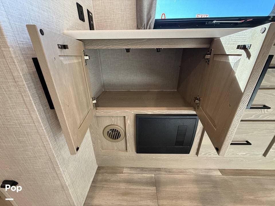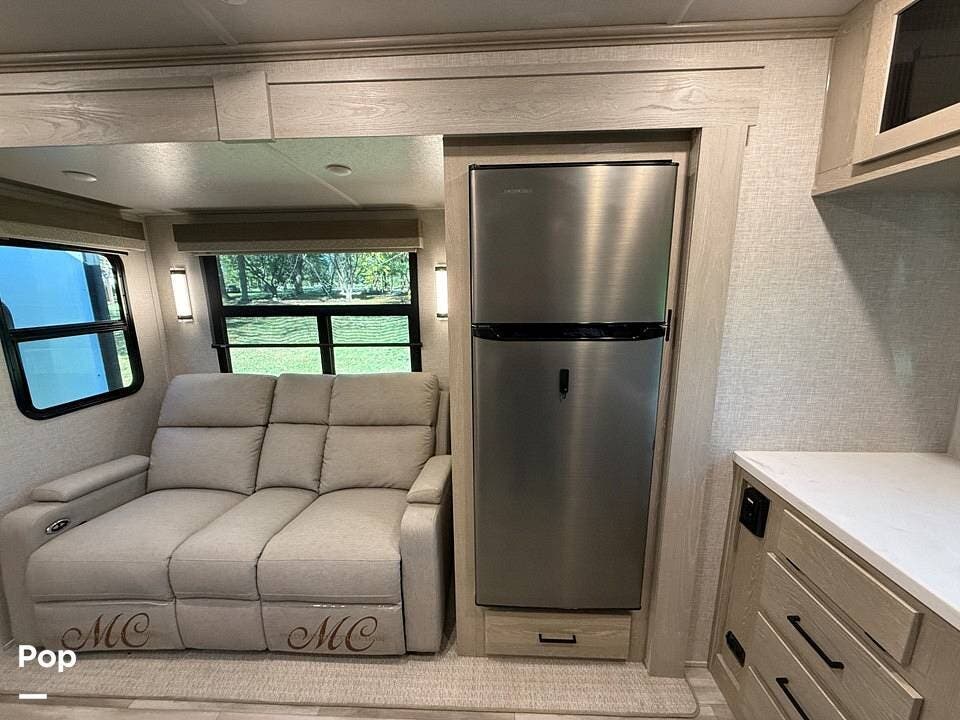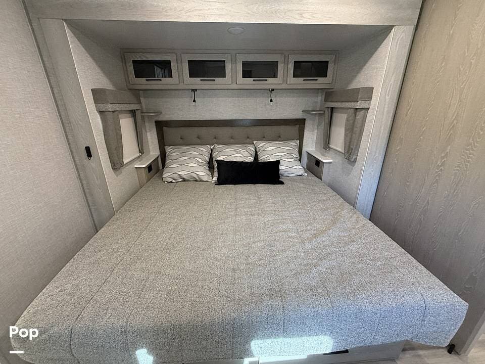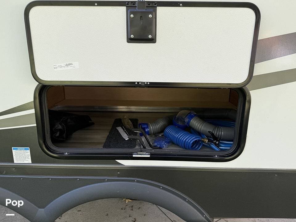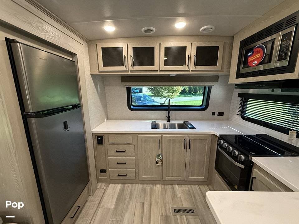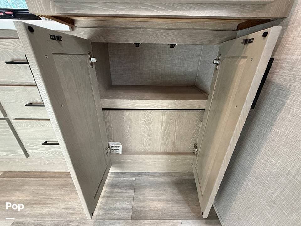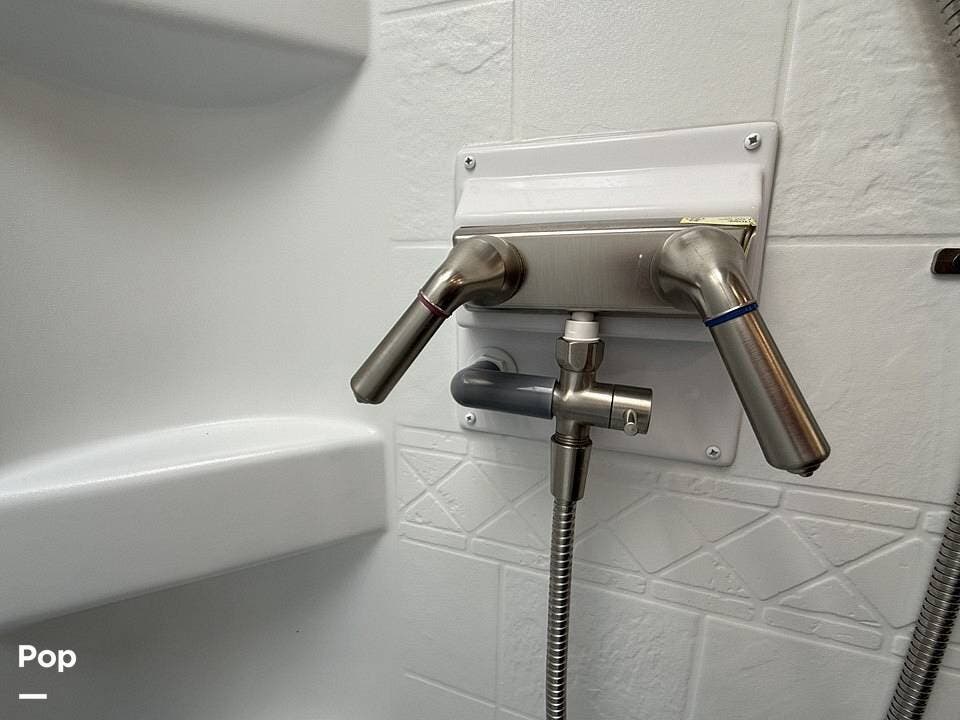 Outside, you'll find an inviting setup for outdoor living, including a mini-fridge, LP griddle with a work table, and a hot/cold shower. A power awning with LED lighting, frameless windows, and slam-latch baggage doors enhances convenience and upscale appeal.