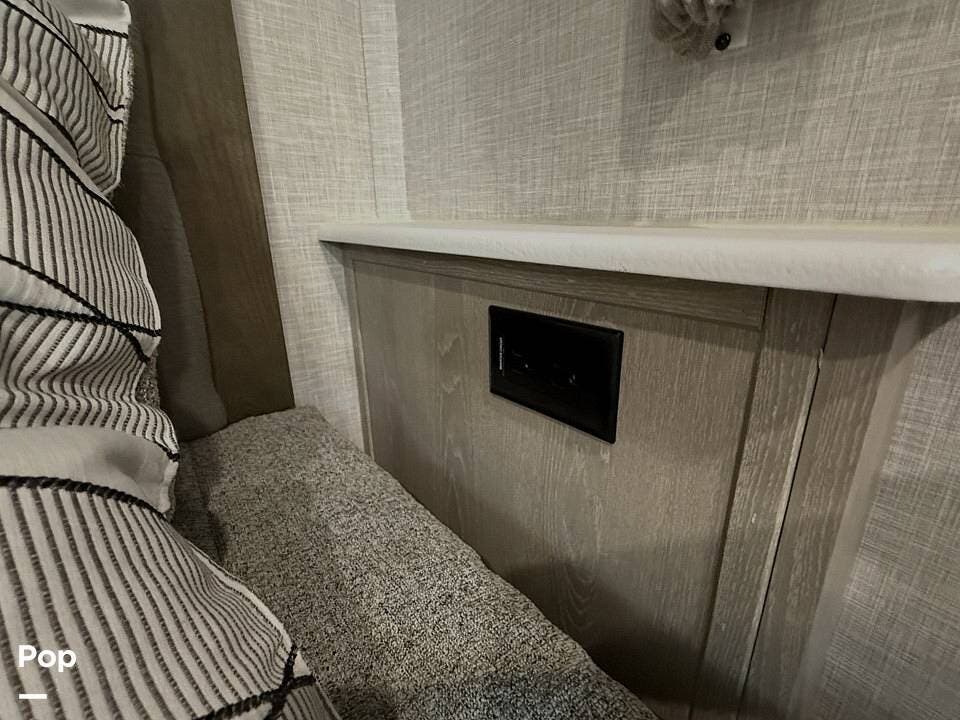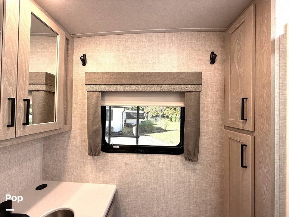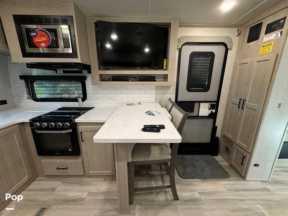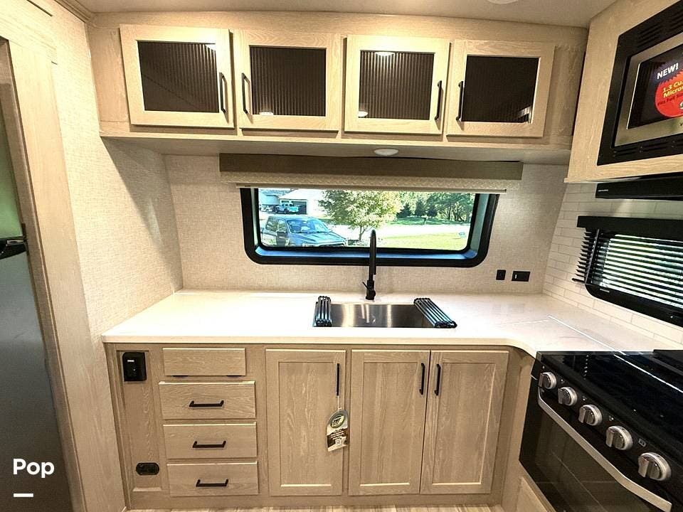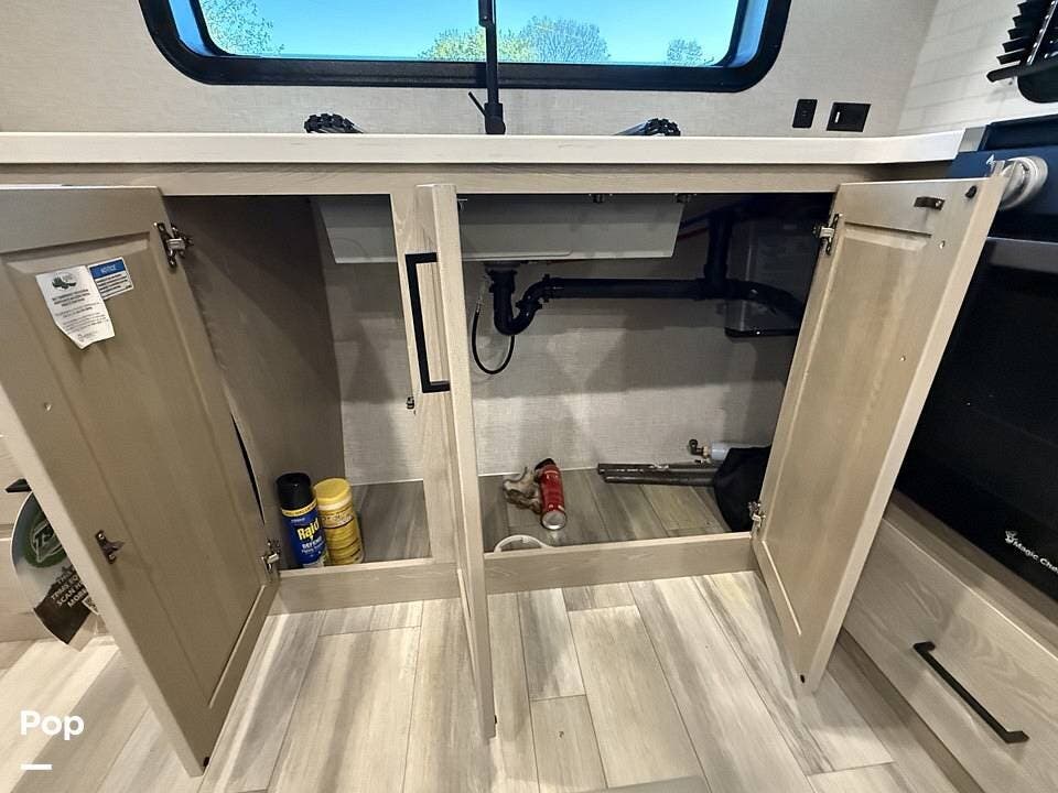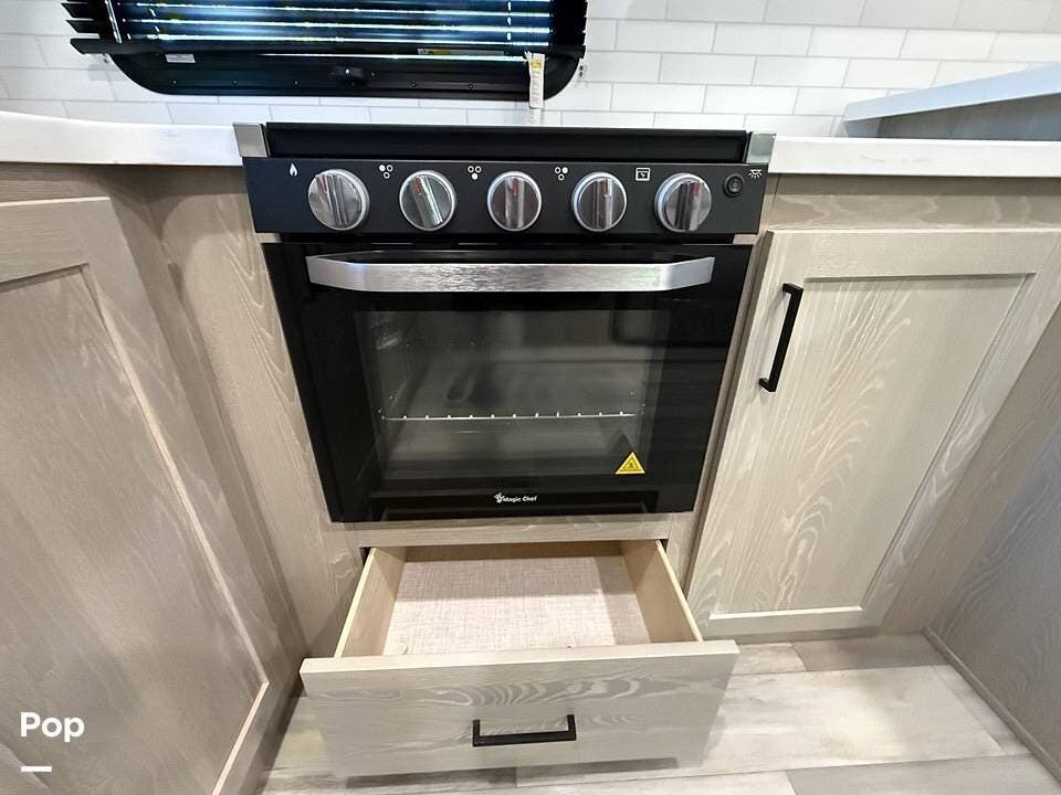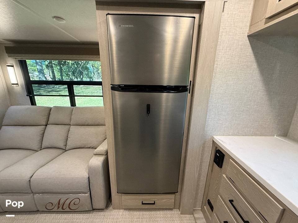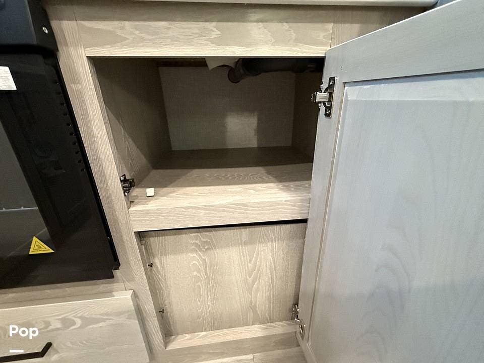 Outside, you'll find an inviting setup for outdoor living, including a mini-fridge, LP griddle with a work table, and a hot/cold shower. A power awning with LED lighting, frameless windows, and slam-latch baggage doors enhances convenience and upscale appeal.