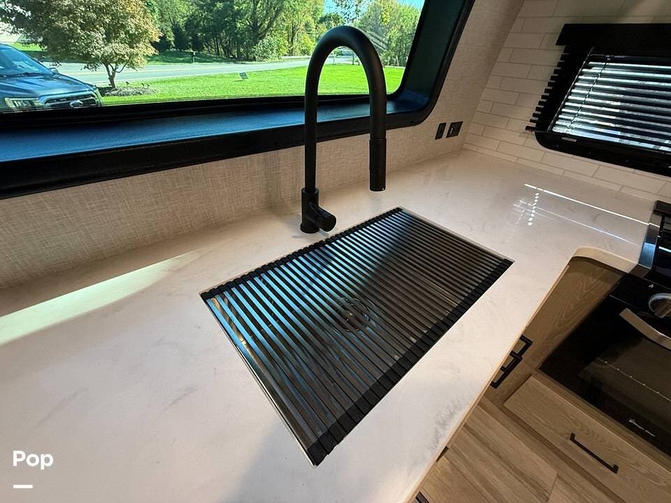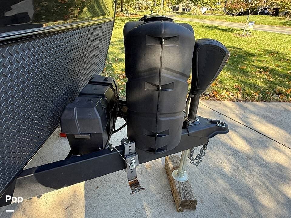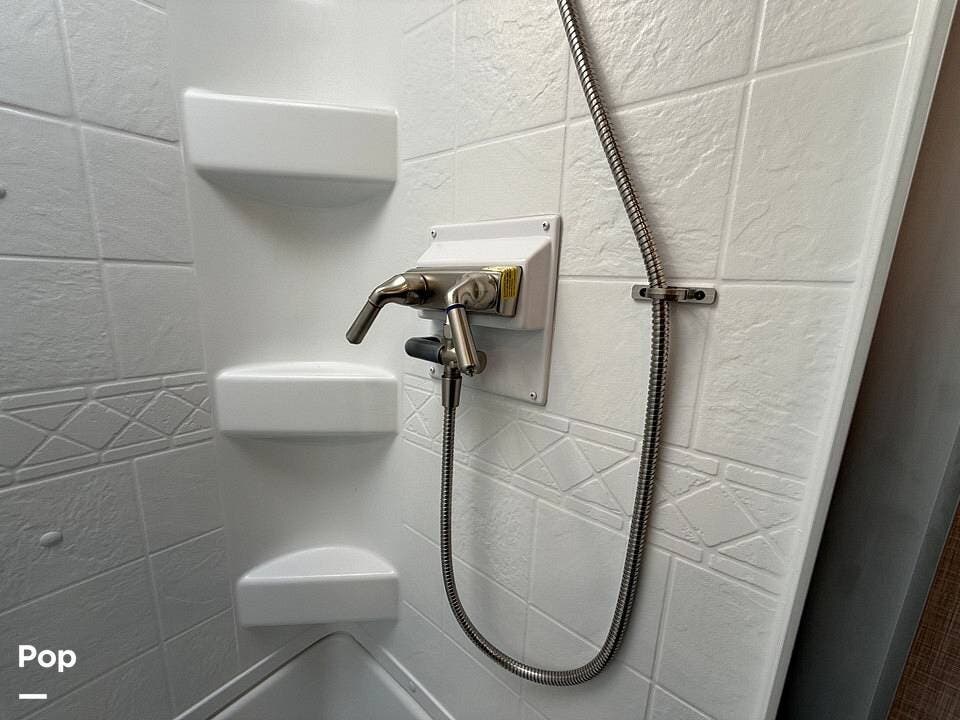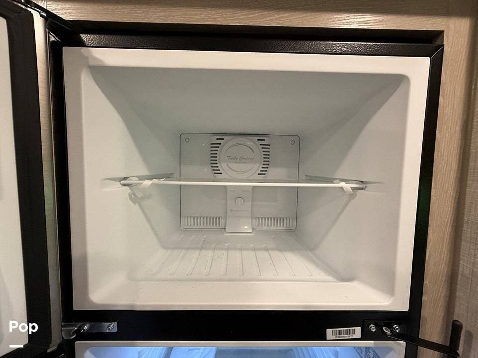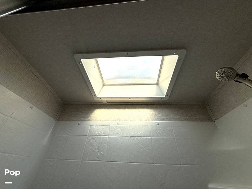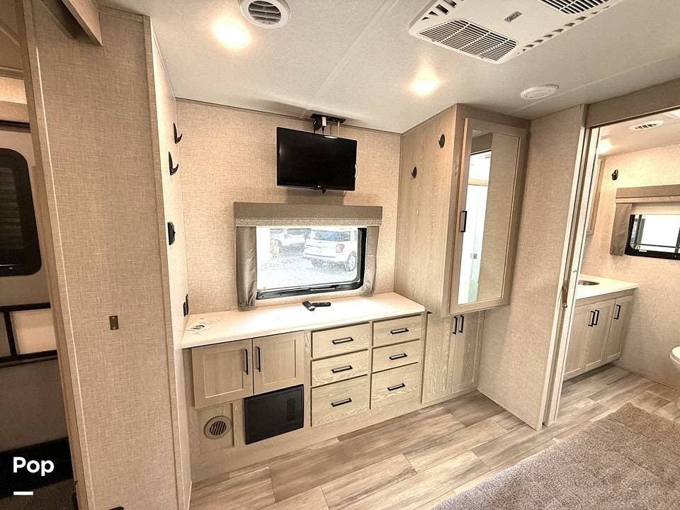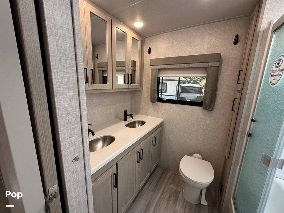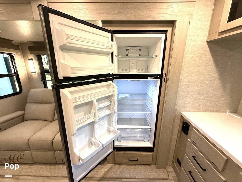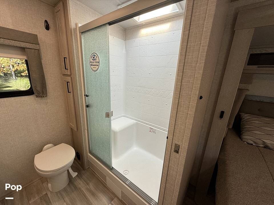 Outside, you'll find an inviting setup for outdoor living, including a mini-fridge, LP griddle with a work table, and a hot/cold shower. A power awning with LED lighting, frameless windows, and slam-latch baggage doors enhances convenience and upscale appeal.