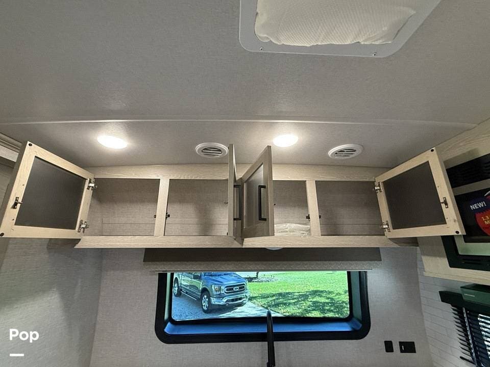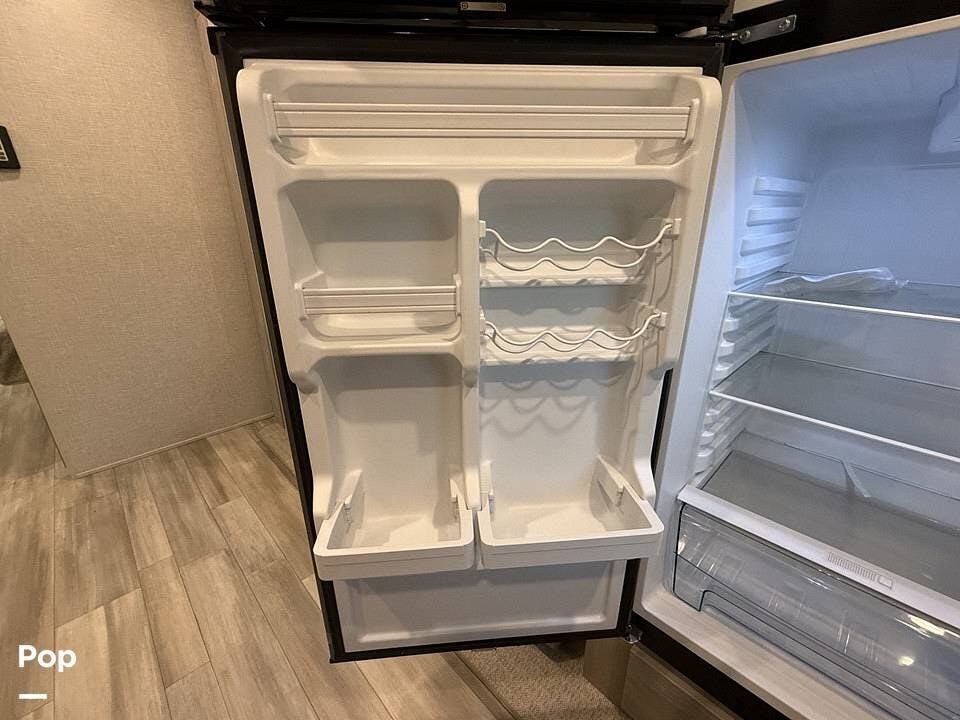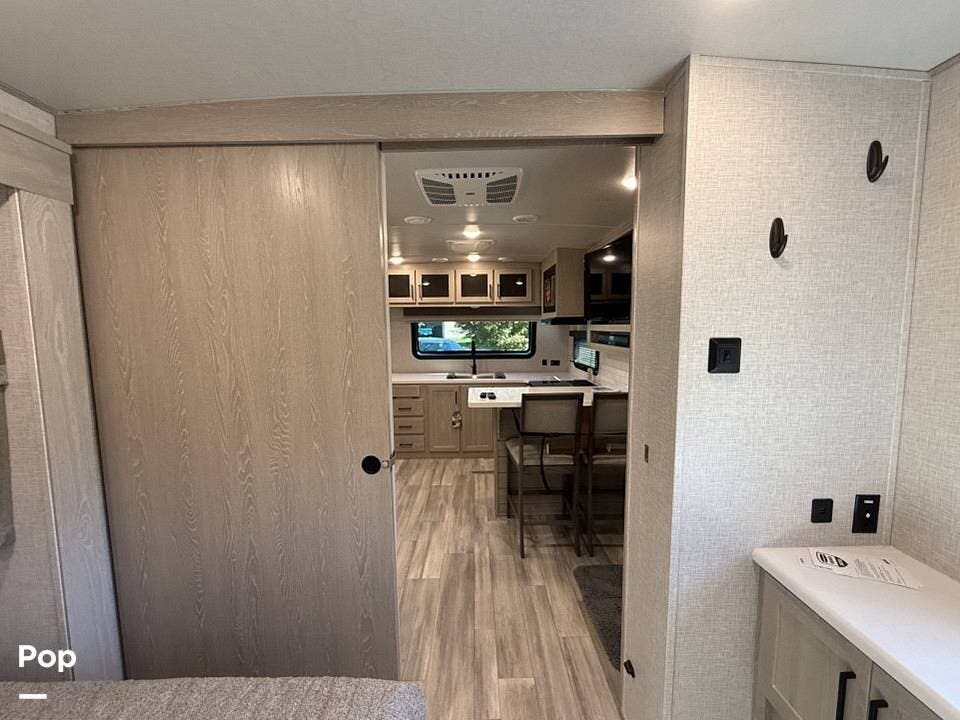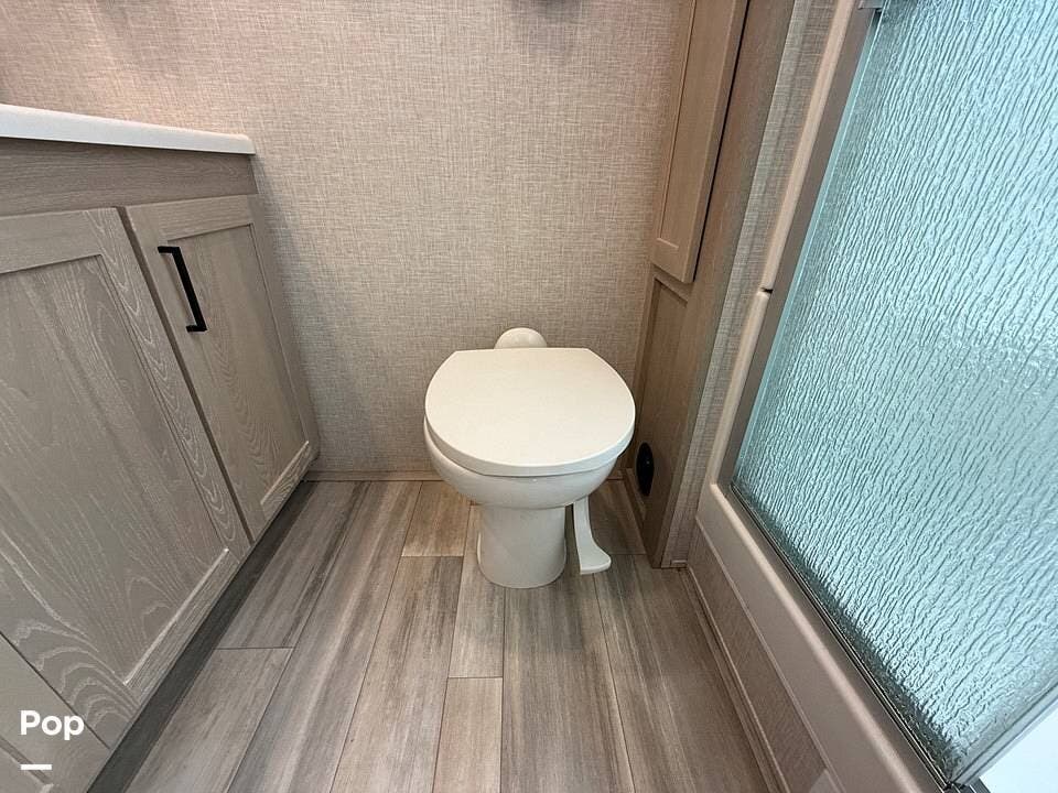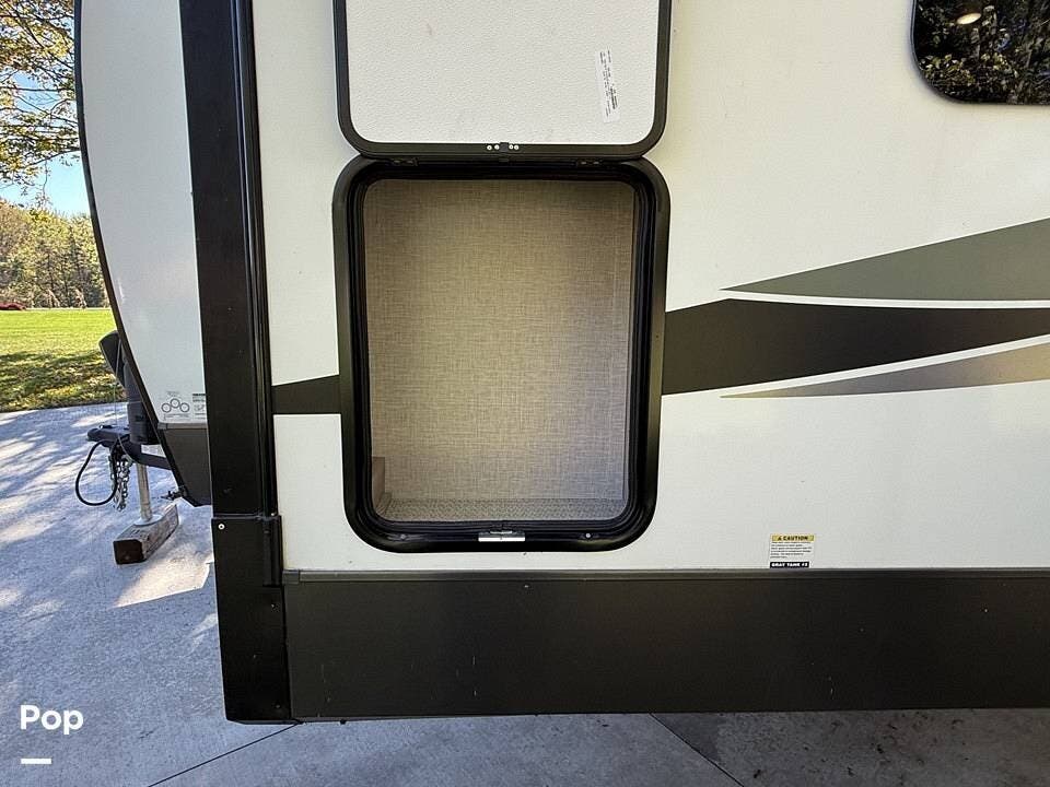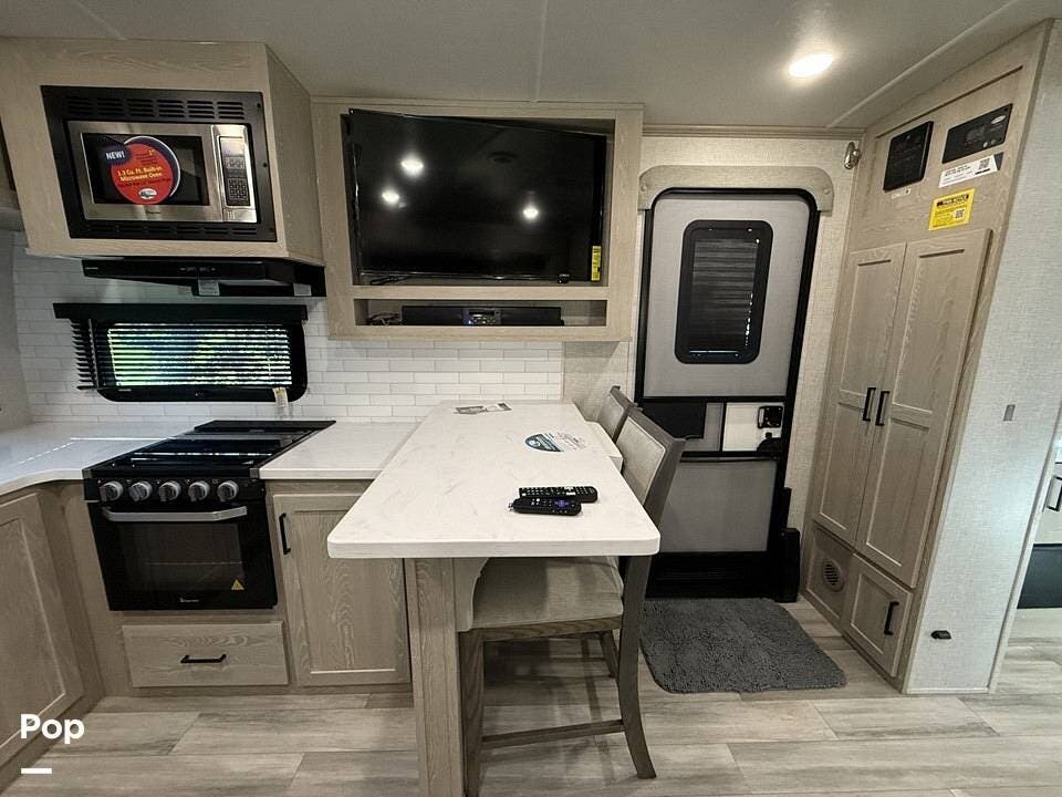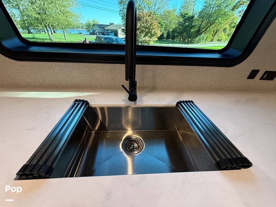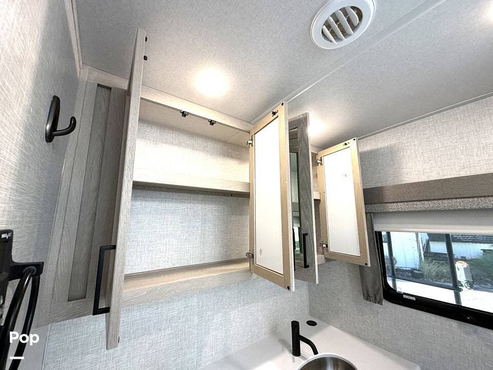 Outside, you'll find an inviting setup for outdoor living, including a mini-fridge, LP griddle with a work table, and a hot/cold shower. A power awning with LED lighting, frameless windows, and slam-latch baggage doors enhances convenience and upscale appeal.