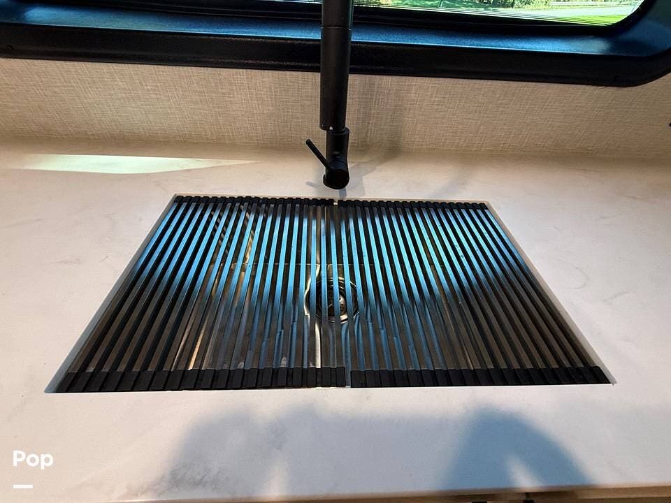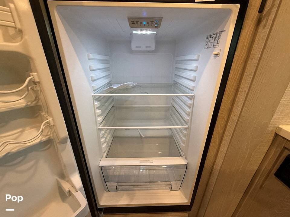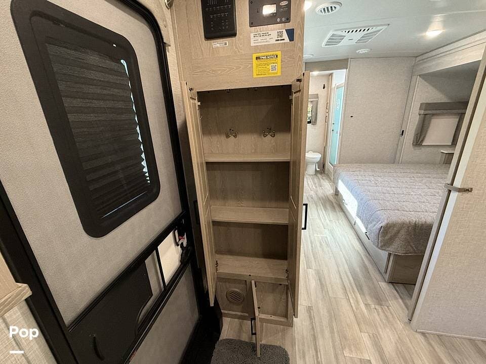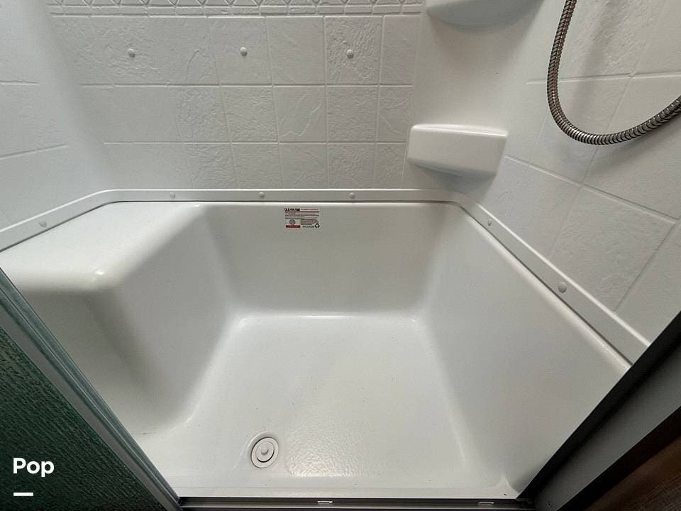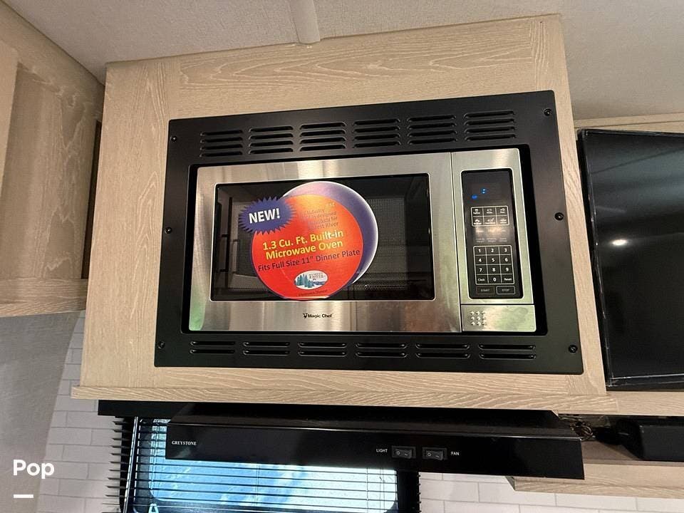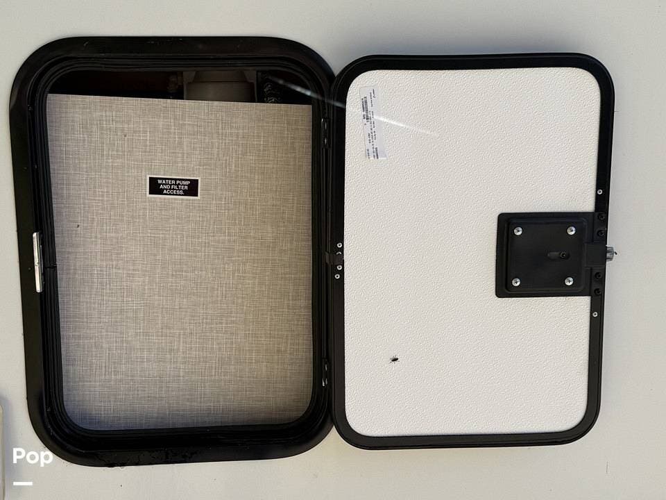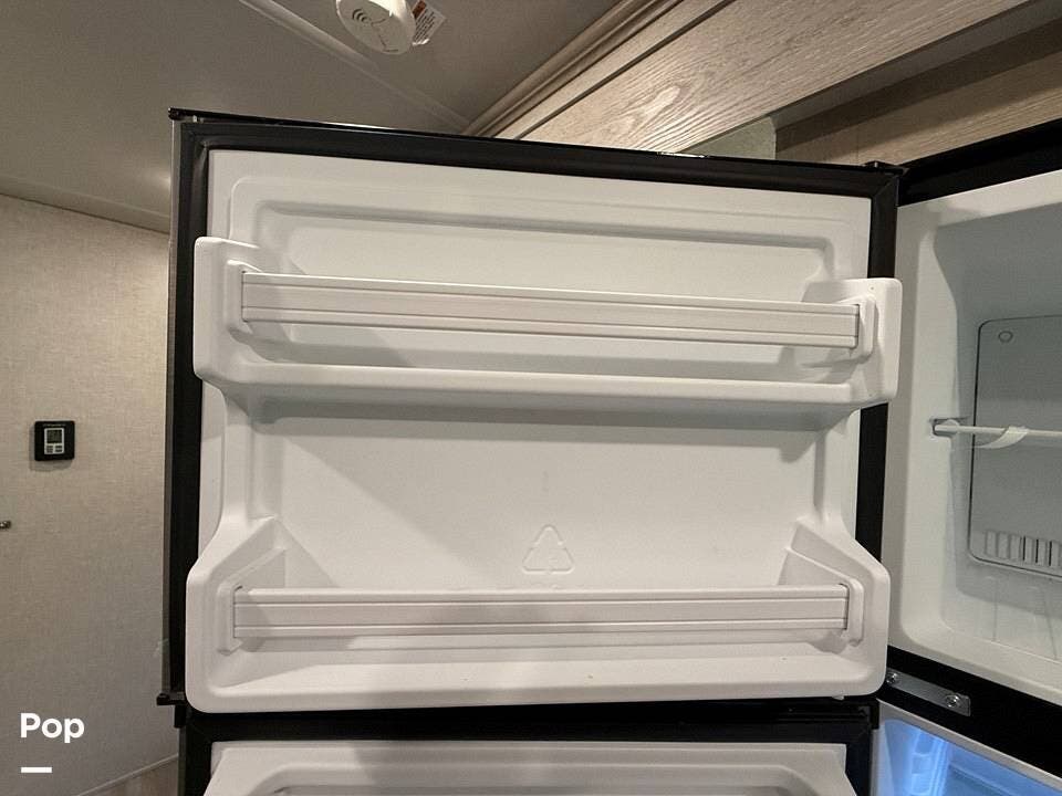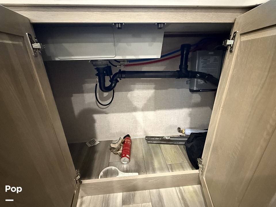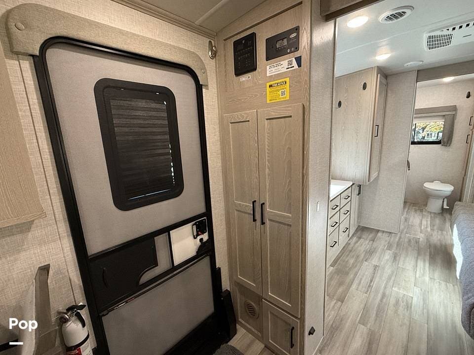 Outside, you'll find an inviting setup for outdoor living, including a mini-fridge, LP griddle with a work table, and a hot/cold shower. A power awning with LED lighting, frameless windows, and slam-latch baggage doors enhances convenience and upscale appeal.