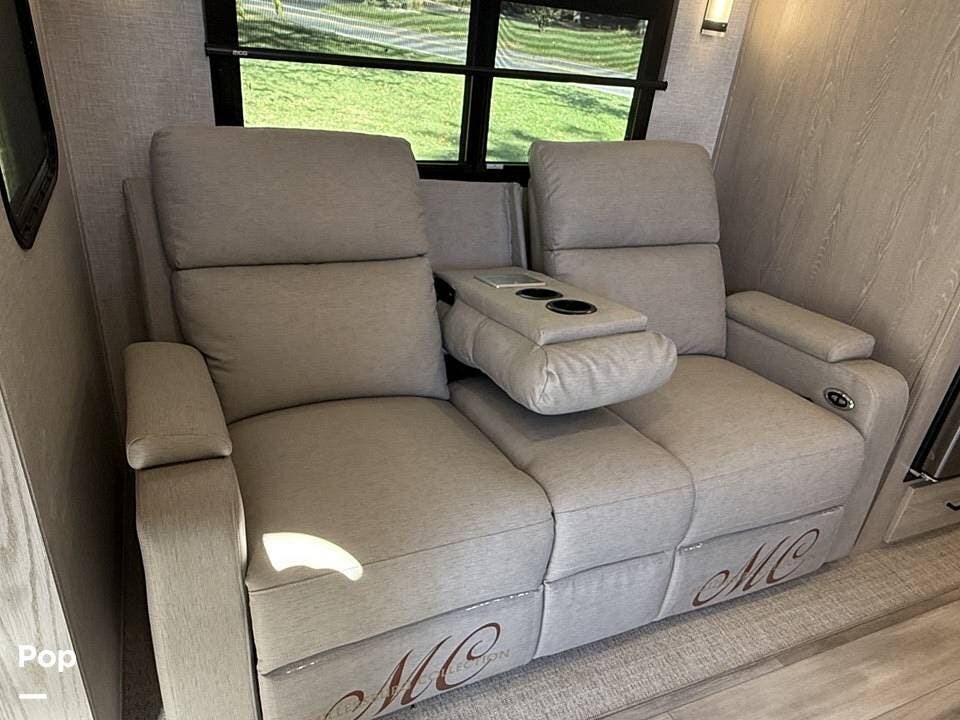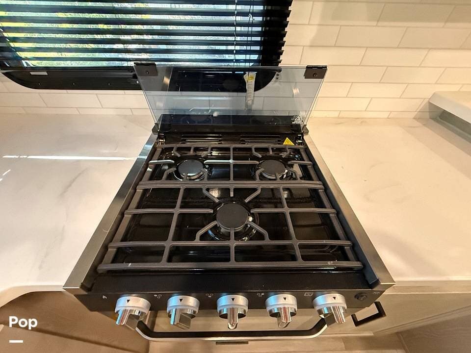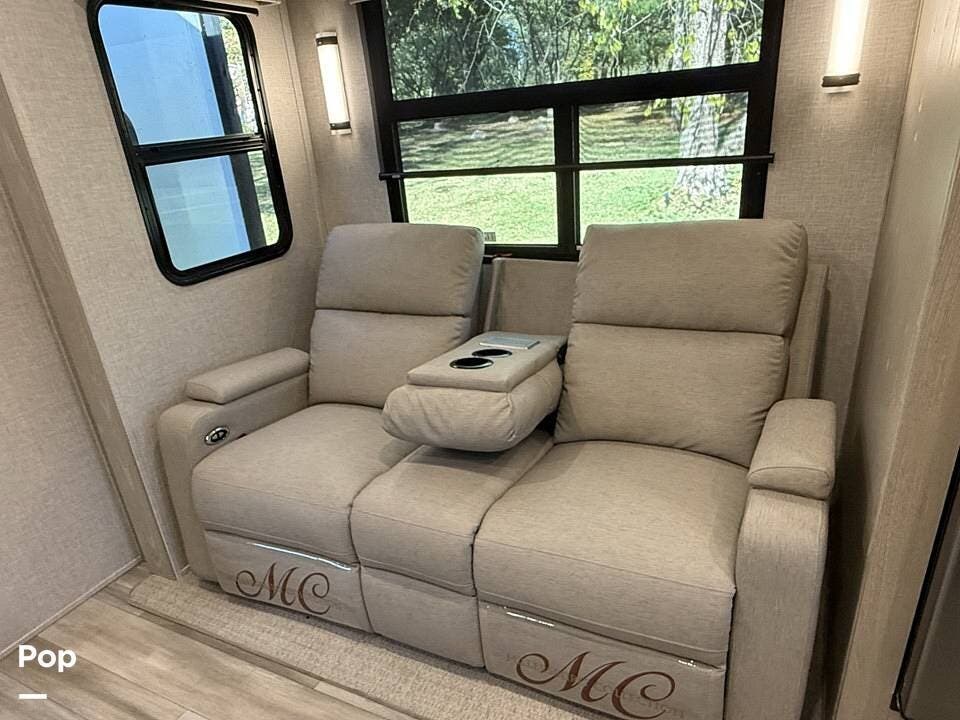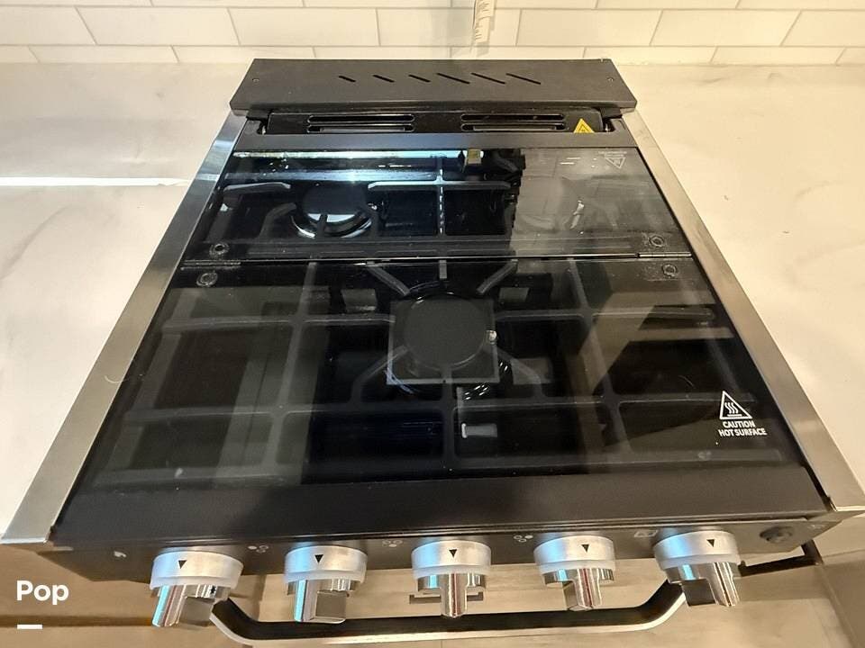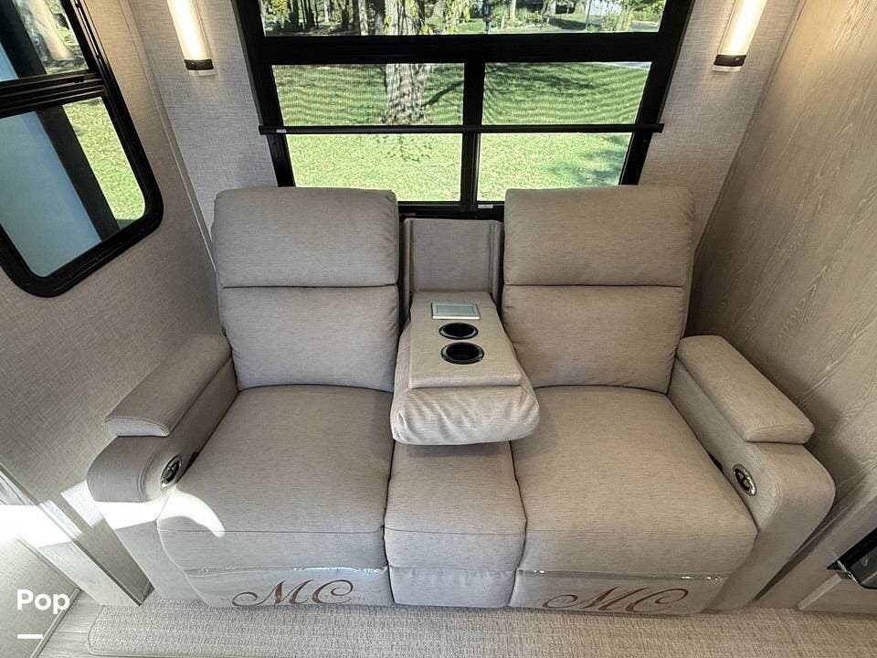 The front kitchen offers residential-style cooking with a gas range and glass cover, solid surface countertops, soft-close cabinetry, a microwave oven, and a 12-volt refrigerator. The living area invites relaxation with plush theater seating featuring lumbar support and USB outlets, a TV, and a soundbar.