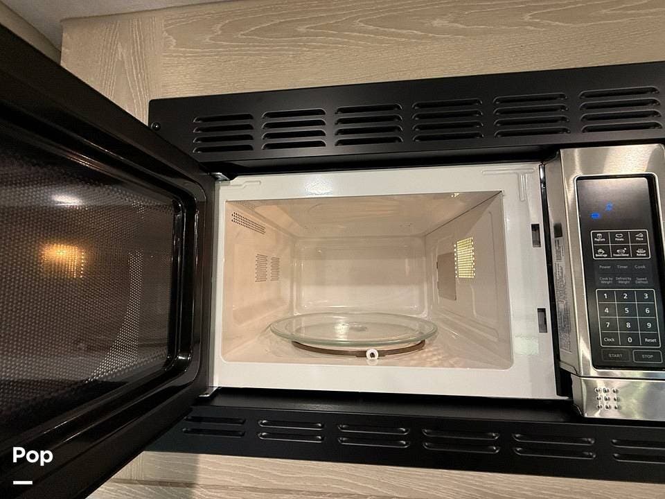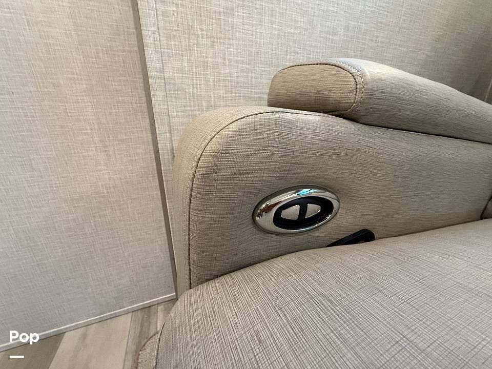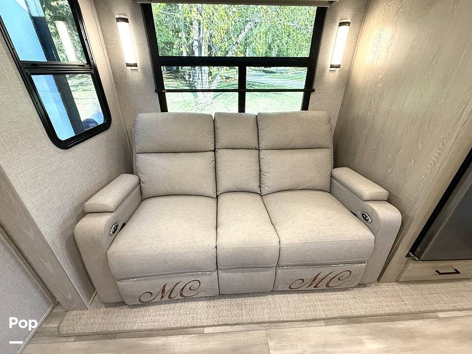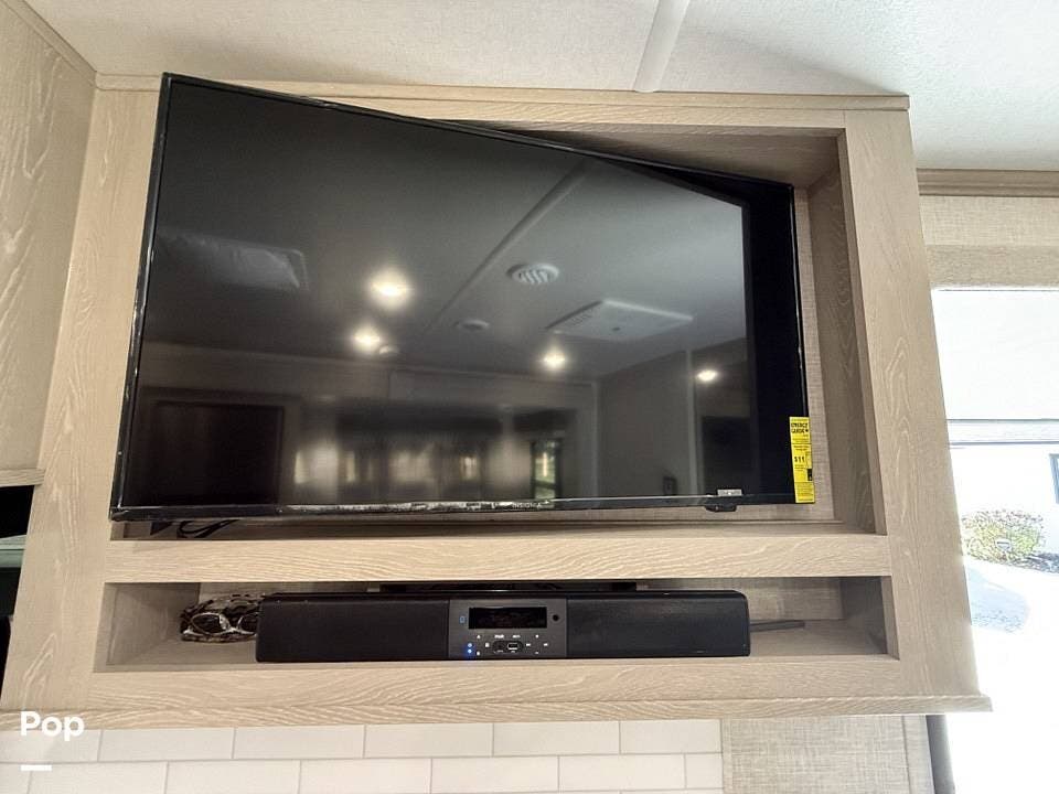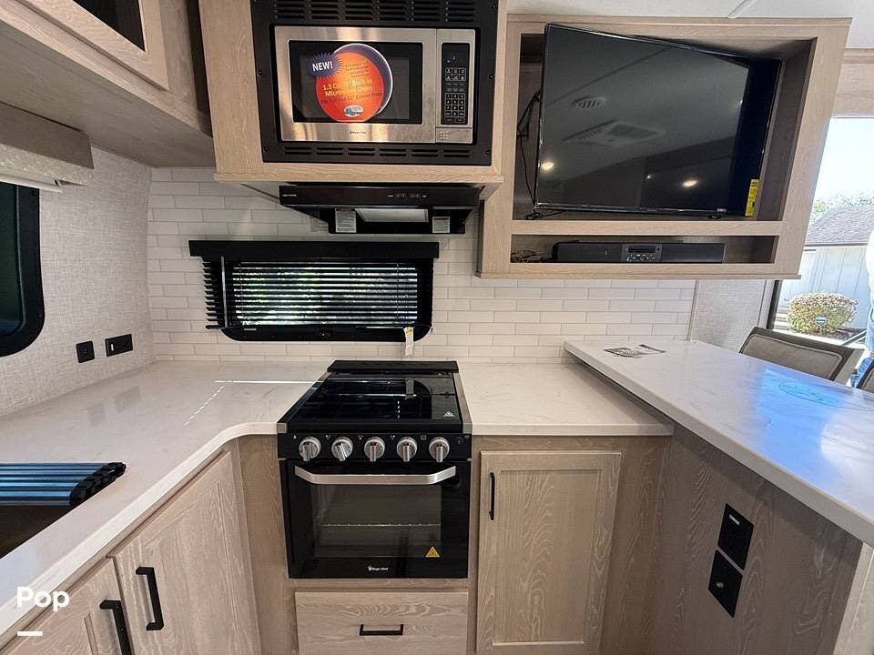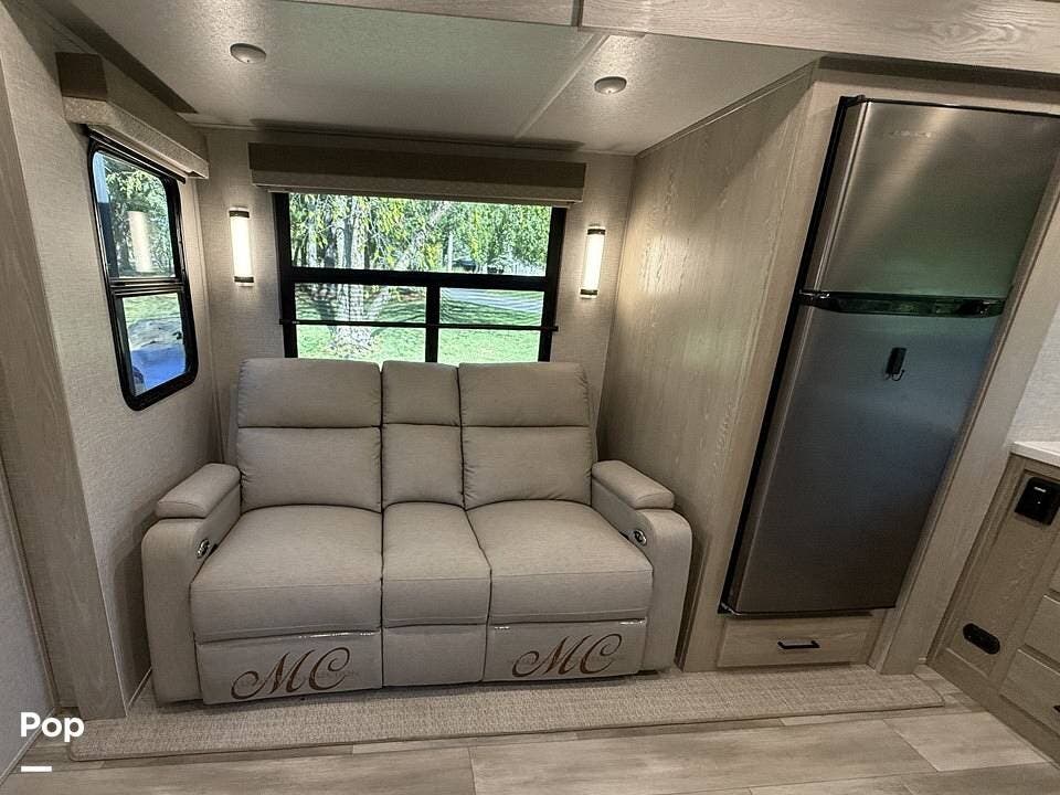 The front kitchen offers residential-style cooking with a gas range and glass cover, solid surface countertops, soft-close cabinetry, a microwave oven, and a 12-volt refrigerator. The living area invites relaxation with plush theater seating featuring lumbar support and USB outlets, a TV, and a soundbar.