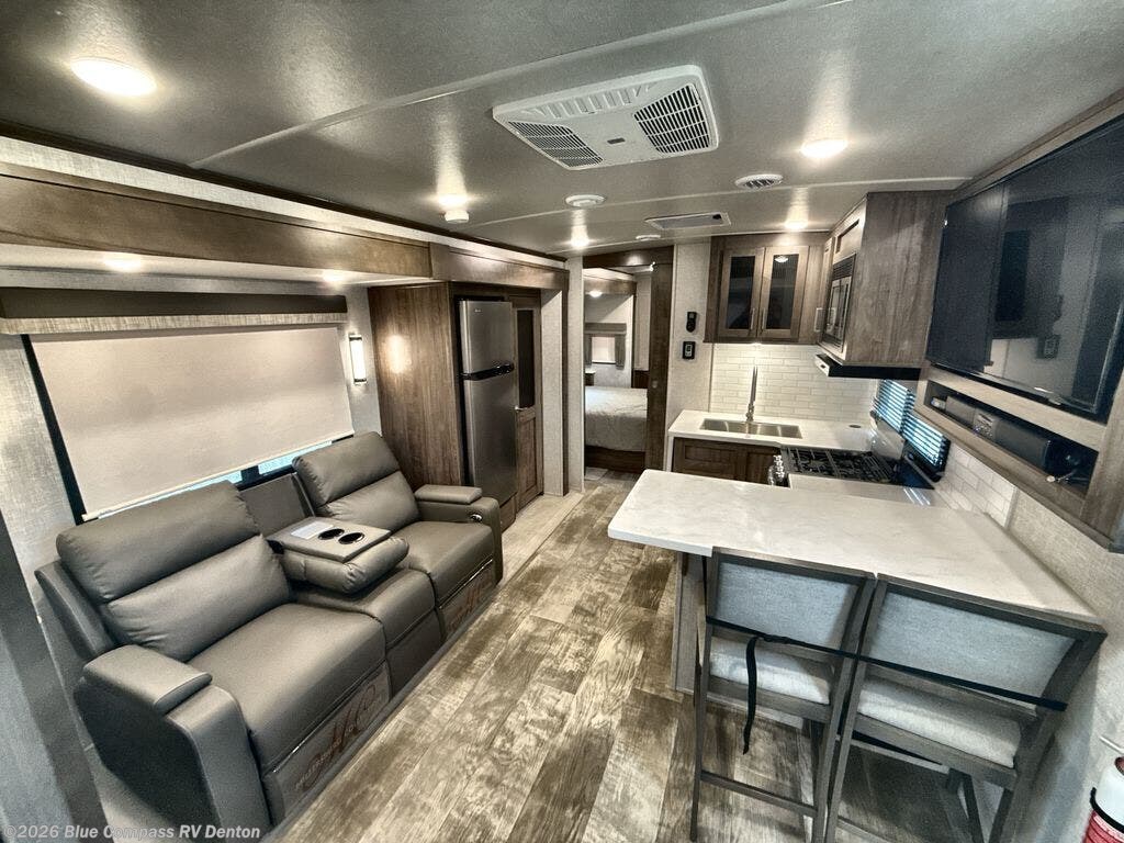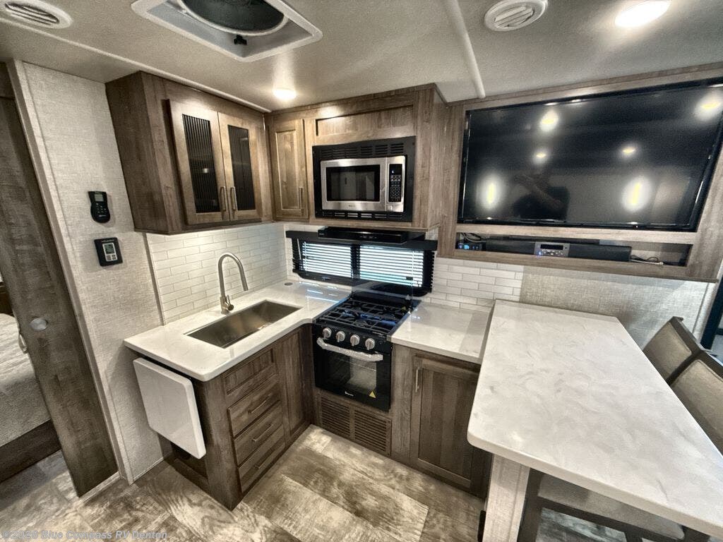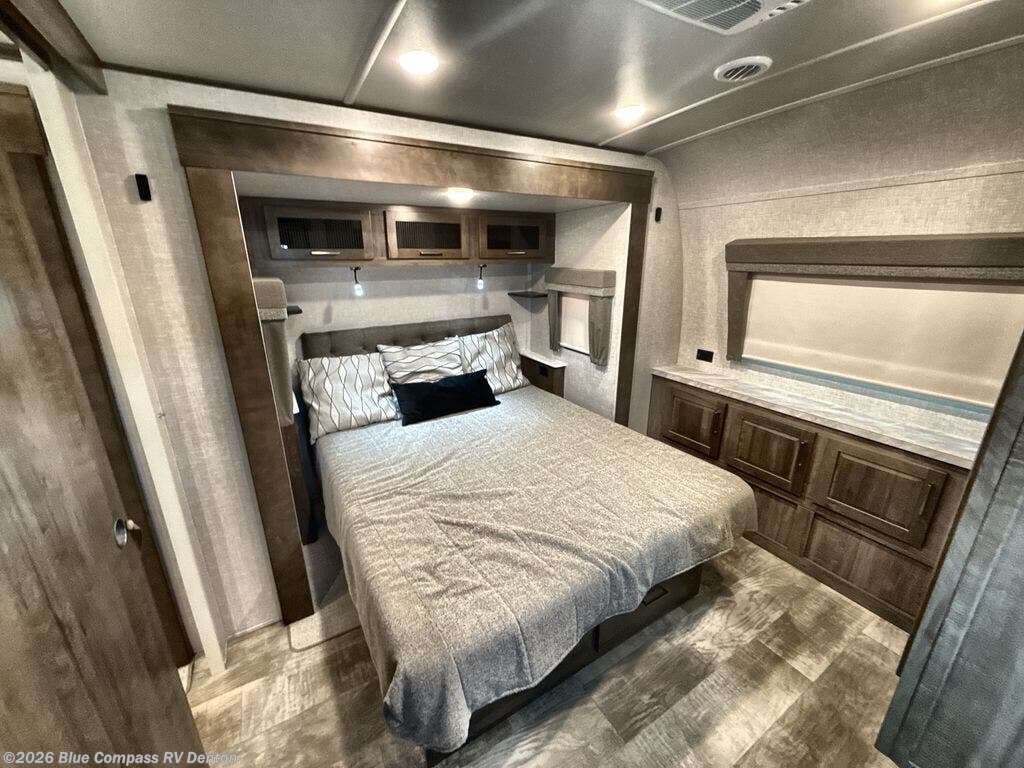 You and your loved one will have a fabulous time getting away with this Flagstaff Classic travel trailer! The two of you will sleep peacefully on your own queen bed slide in the front private bedroom, and this bedroom also showcases the second exterior entry door for quick access while outside. There is great bedroom storage with the under-bed storage, wardrobe, and front storage area, and you can even add an optional TV to the bedroom. The main living area has a breakfast bar with chairs for an easy way to eat meals, and the countertop extension will provide more prep space. You'll also have a great bathroom complete with a Maxxair ventilation fan, linen closet, and skylight.