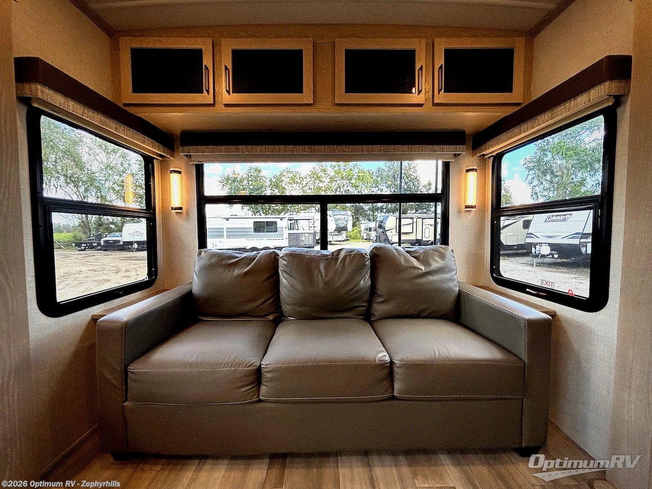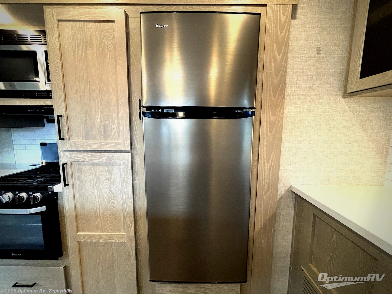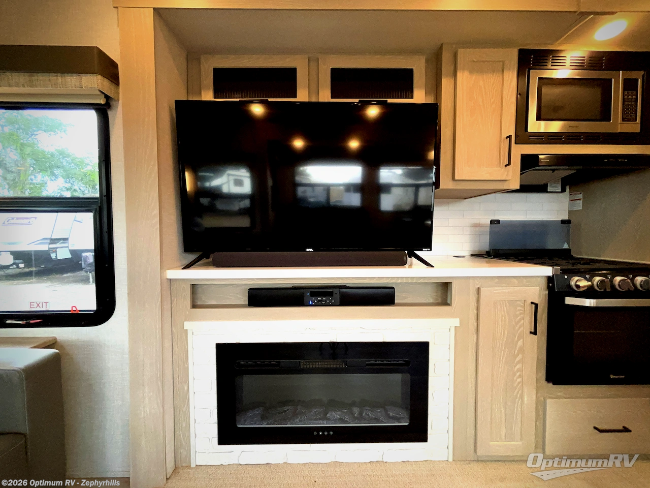 The large windows in the rear and door side slide will bring nature's scenery indoors with this travel trailer! Everyone can relax together in the rear living area with the 76" hide-a-bed sofa and the 60" theater seating across from the entertainment center with a fireplace. Meal prepping will be even easier with the kitchen island, and the 39" booth dinette is a comfortable place to enjoy your meals. The full bathroom has a shower with a seat and a linen closet to keep your towels close. You will feel well rested each morning after sleeping on the king bed slide in the front private bedroom which also has a wardrobe that is prepped to add an optional washer and dryer and an area to add an optional TV!