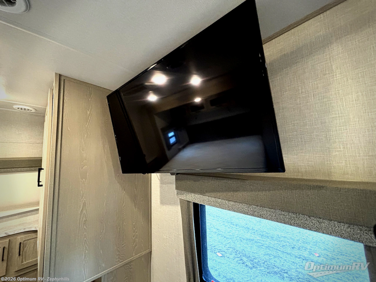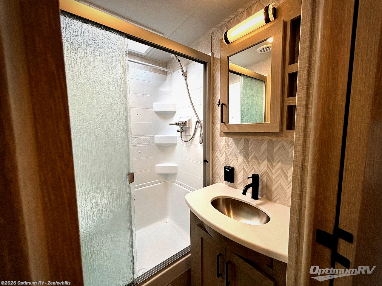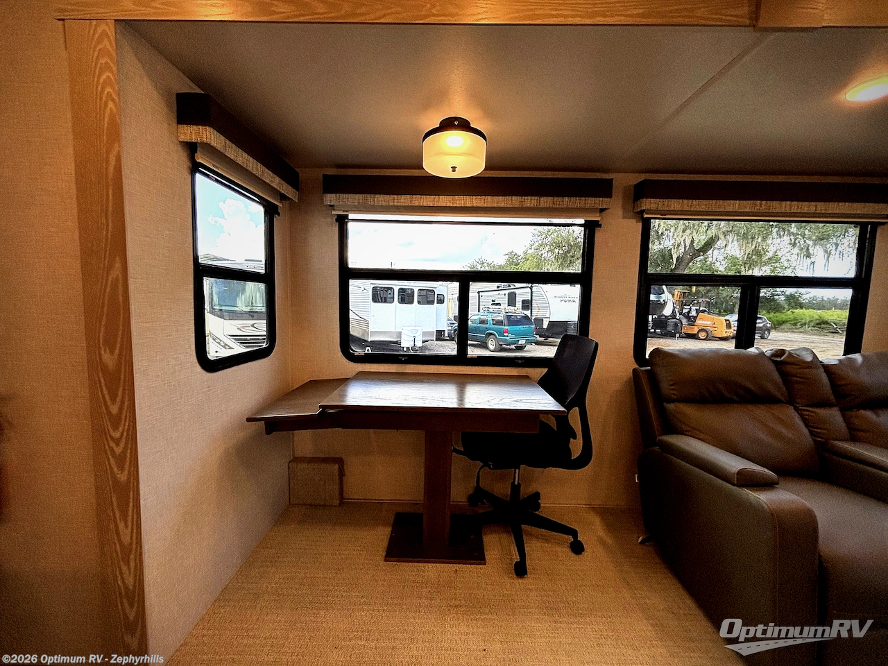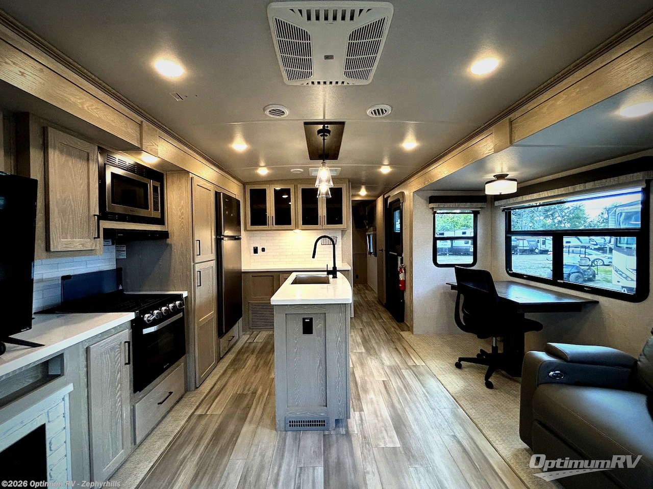 The large windows in the rear and door side slide will bring nature's scenery indoors with this travel trailer! Everyone can relax together in the rear living area with the 76" hide-a-bed sofa and the 60" theater seating across from the entertainment center with a fireplace. Meal prepping will be even easier with the kitchen island, and the 39" booth dinette is a comfortable place to enjoy your meals. The full bathroom has a shower with a seat and a linen closet to keep your towels close. You will feel well rested each morning after sleeping on the king bed slide in the front private bedroom which also has a wardrobe that is prepped to add an optional washer and dryer and an area to add an optional TV!