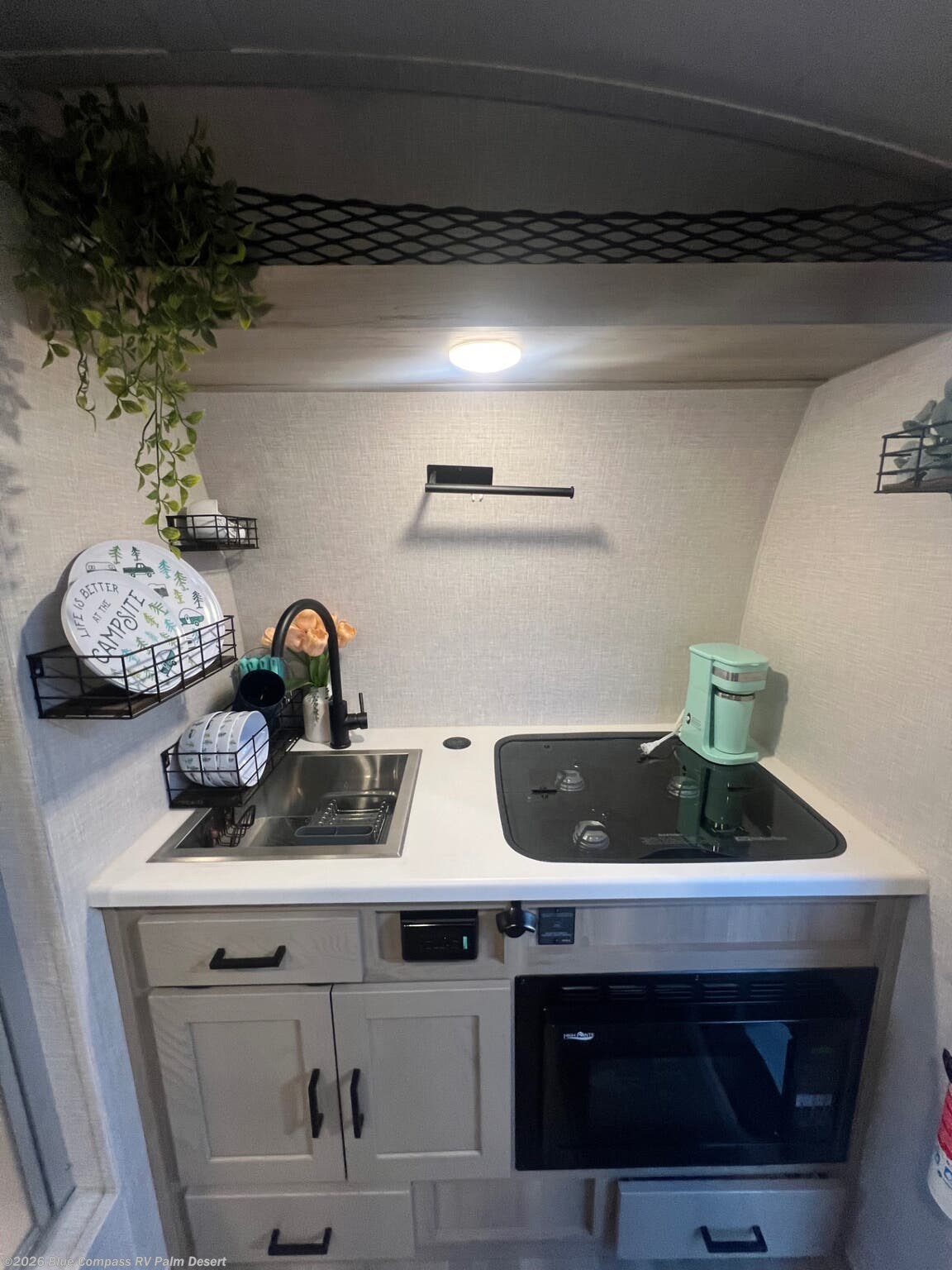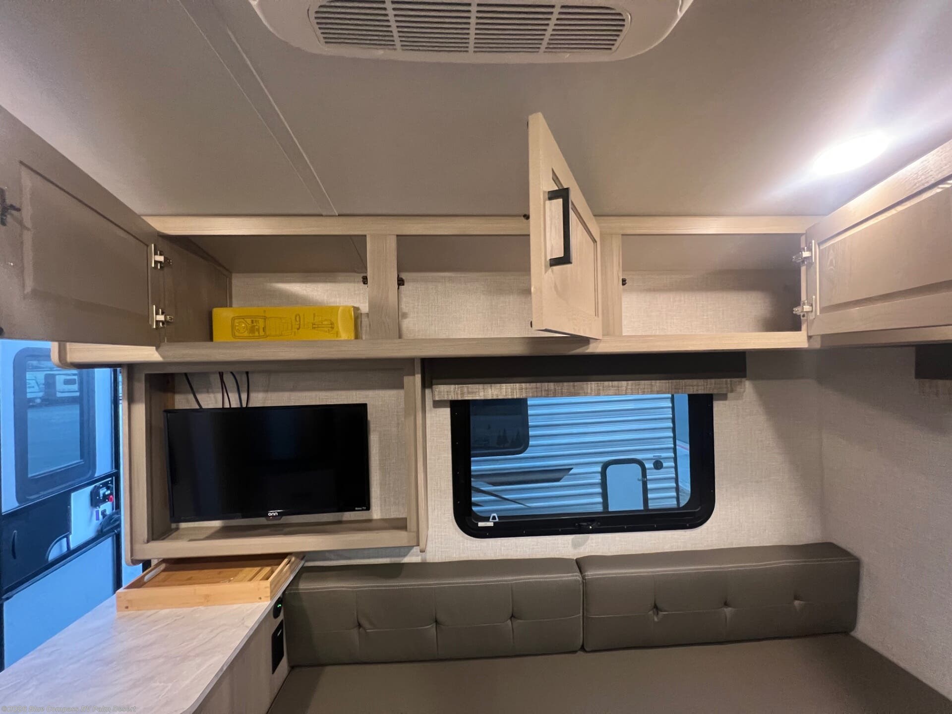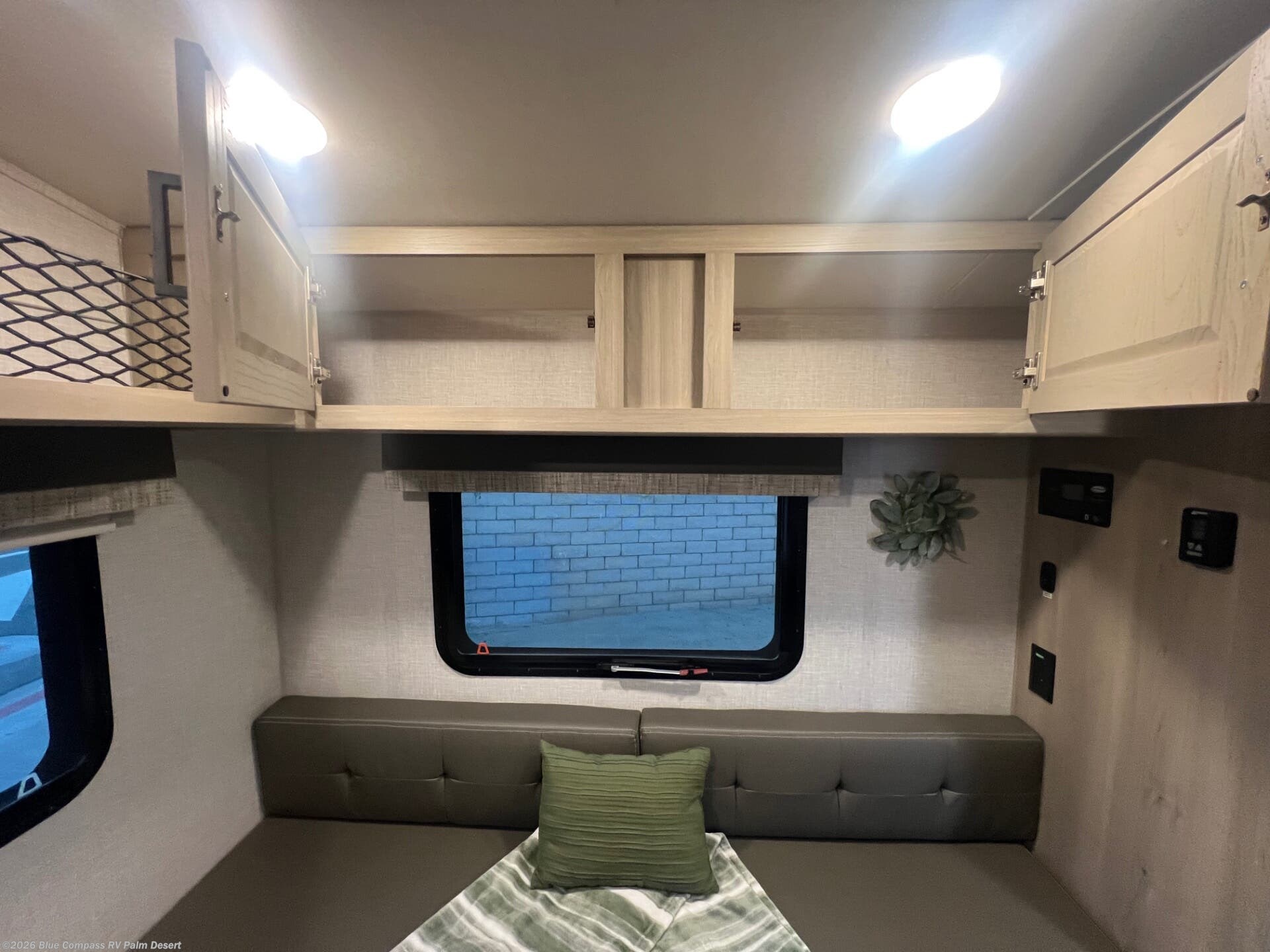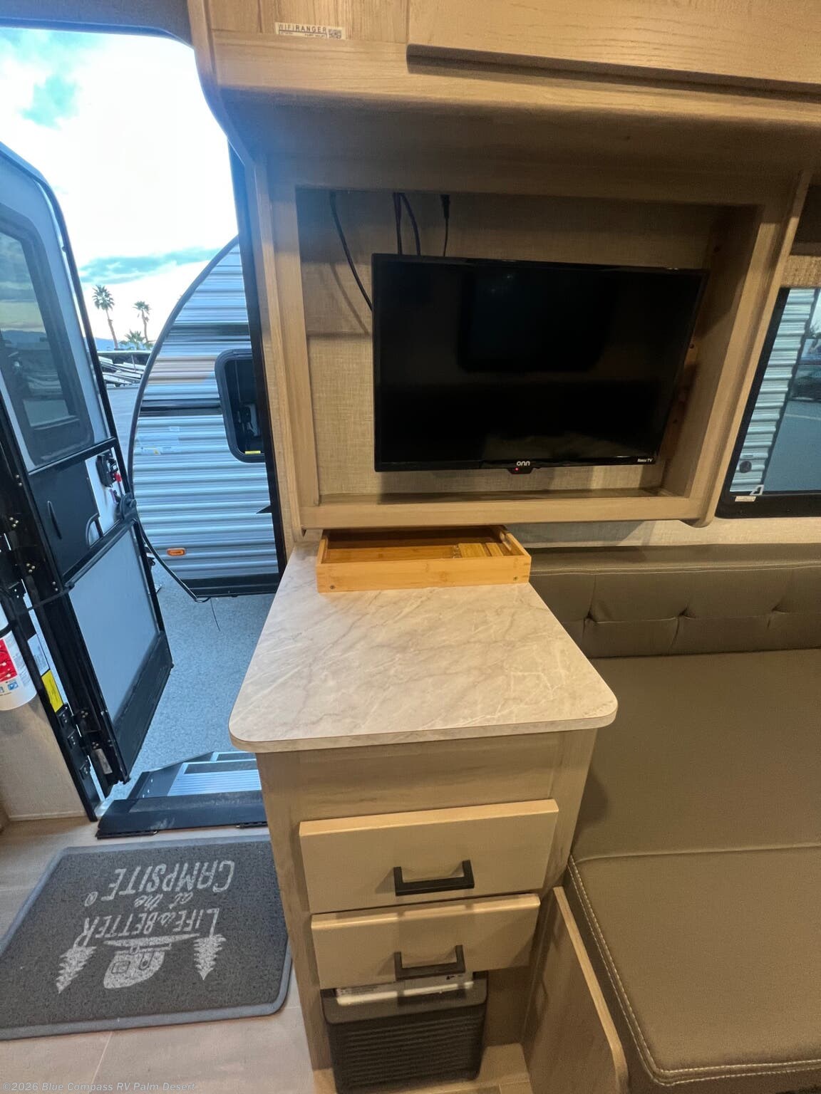It's time to hit the road in this small, yet walkable travel trailer that is versatile to your needs and offers everything you will want to stay comfortable at a campground or off-grid. You can make meals using the cooktop and microwave up front and store your cold items in the 12V refrigerator. Take turns getting cleaned up in the wet bath so you can skip the public facilities, and store your clothing in the overhead cabinets. You can watch the 32" TV while dining or sleeping on the twin beds that offer a table top to help you convert this area into a king bed. And the 10' power awning will give you a place to hang out while you use the outdoor griddle.