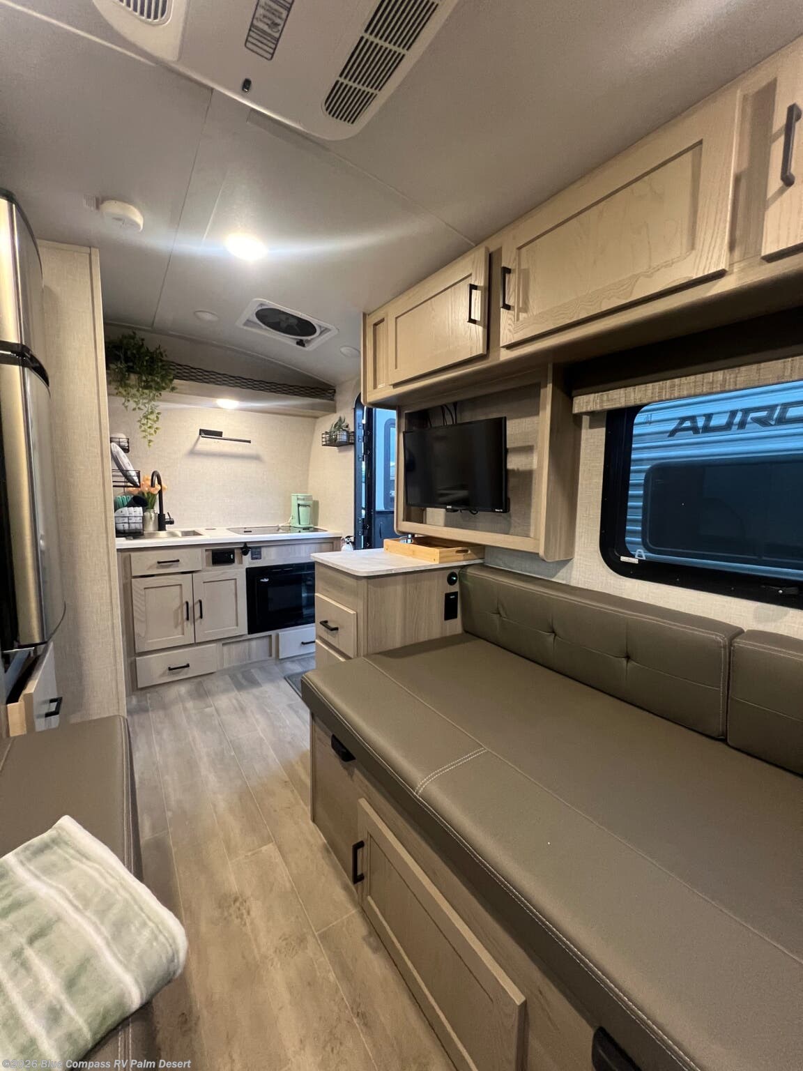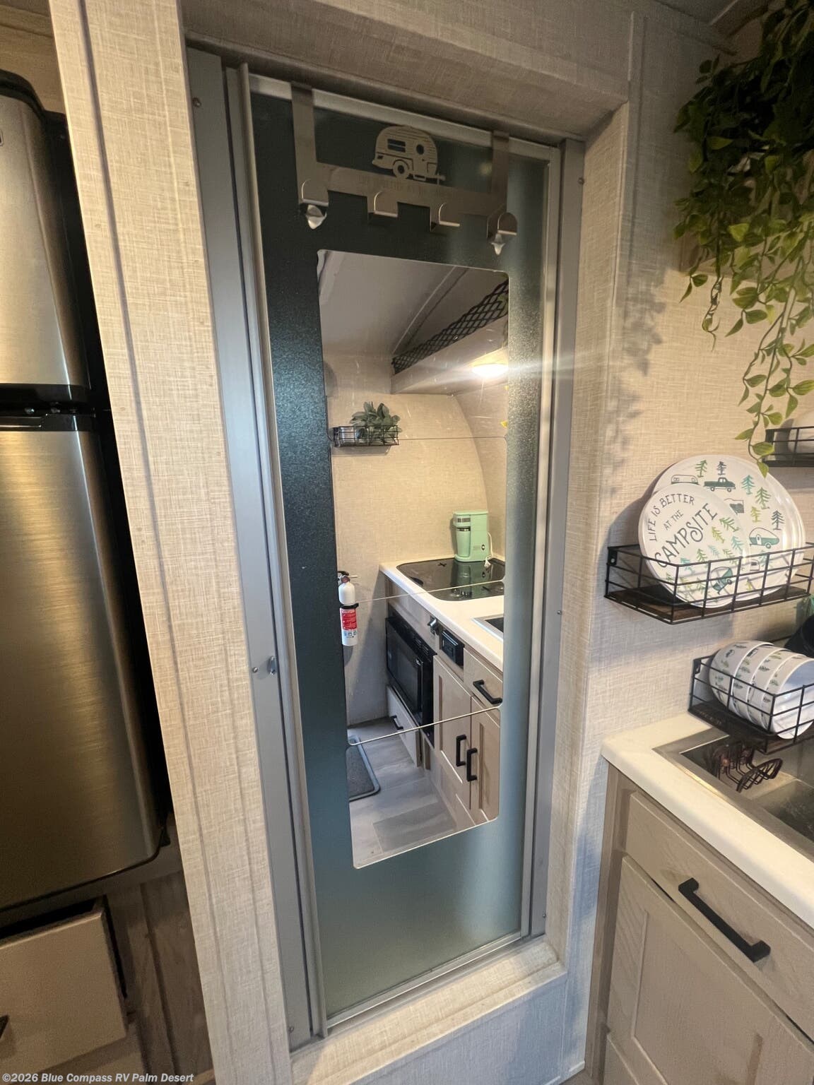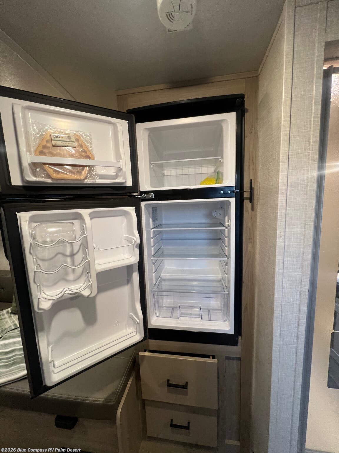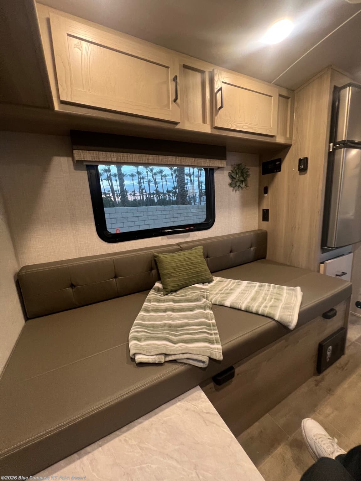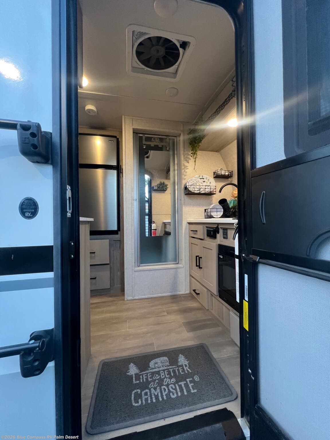 It's time to hit the road in this small, yet walkable travel trailer that is versatile to your needs and offers everything you will want to stay comfortable at a campground or off-grid. You can make meals using the cooktop and microwave up front and store your cold items in the 12V refrigerator. Take turns getting cleaned up in the wet bath so you can skip the public facilities, and store your clothing in the overhead cabinets. You can watch the 32" TV while dining or sleeping on the twin beds that offer a table top to help you convert this area into a king bed. And the 10' power awning will give you a place to hang out while you use the outdoor griddle.