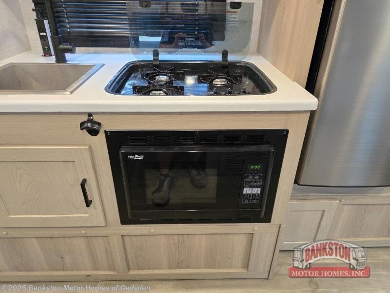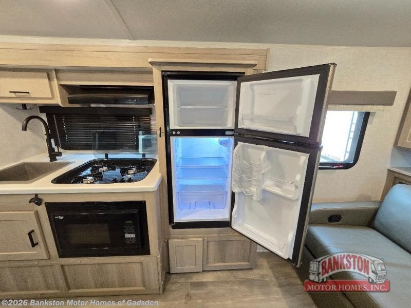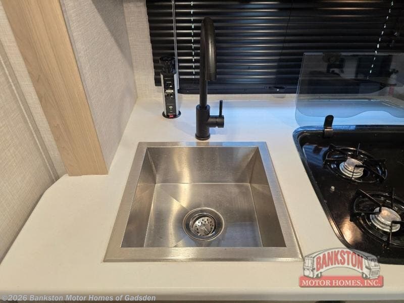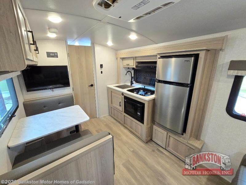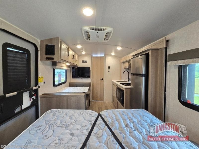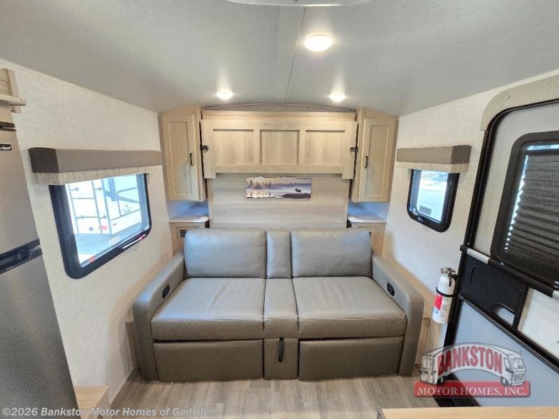 Camp with your favorite person in this trailer with the versatile Murphy bed/sofa combo up front giving you both a living area and a bedroom when you so choose. If you need sleeping space for one more, the dinette will provide that once easily setup. The large window gives you great views while dining or playing games, and the front windshield gives you more views. There is extra floor space in this trailer with the kitchen slide out that offers full amenities plus a sink to keep everything clean. And the full-length rear bathroom offers a spacious area to change your clothes in privacy and get cleaned up in the large shower.