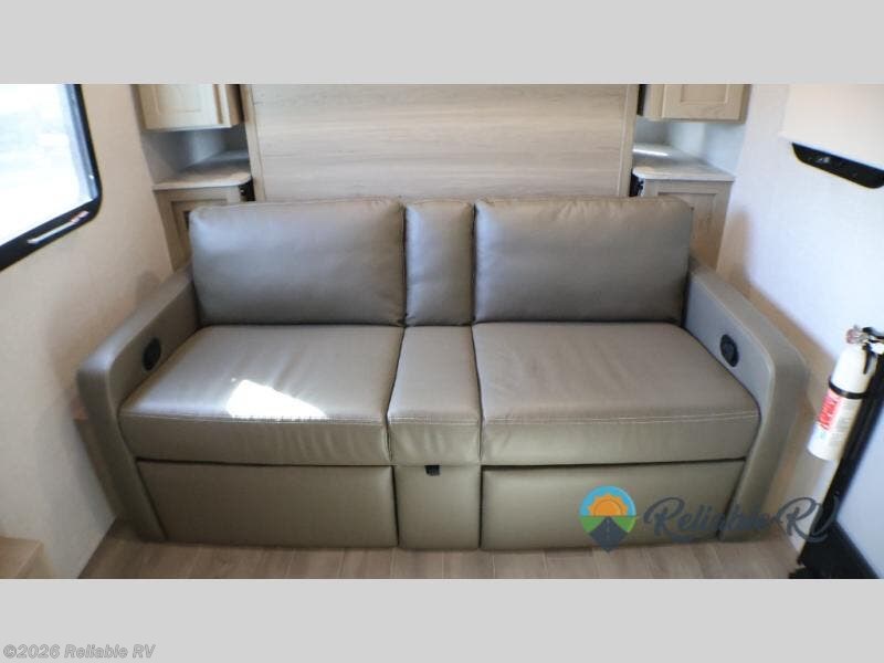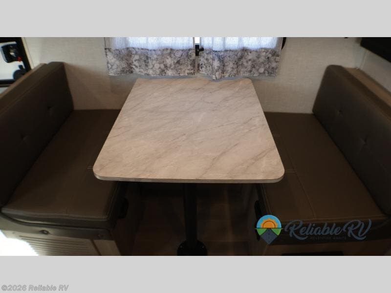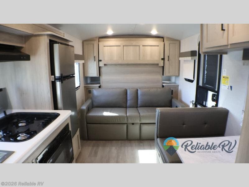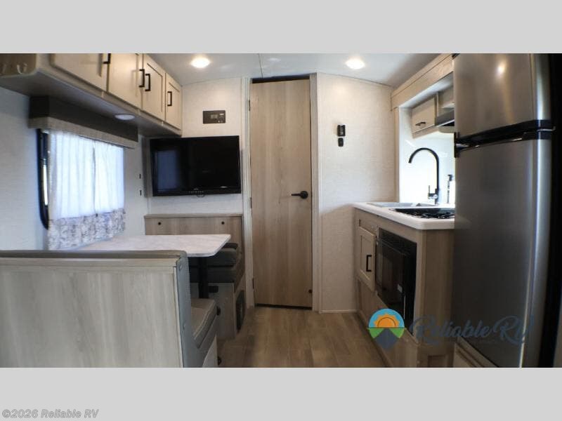 Camp with your favorite person in this trailer with the versatile Murphy bed/sofa combo up front giving you both a living area and a bedroom when you so choose. If you need sleeping space for one more, the dinette will provide that once easily setup. The large window gives you great views while dining or playing games, and the front windshield gives you more views. There is extra floor space in this trailer with the kitchen slide out that offers full amenities plus a sink to keep everything clean. And the full-length rear bathroom offers a spacious area to change your clothes in privacy and get cleaned up in the large shower.