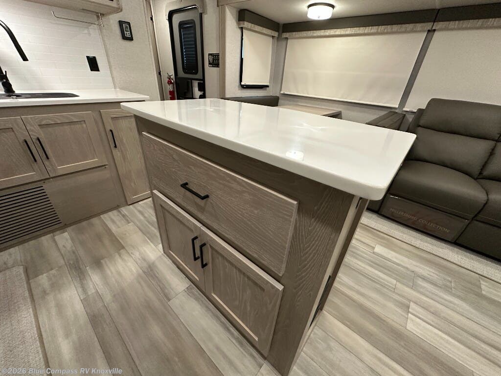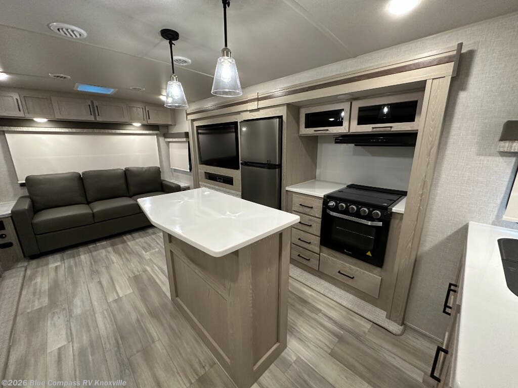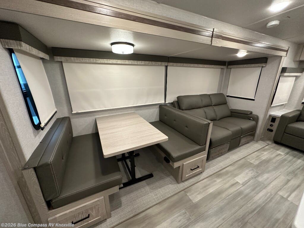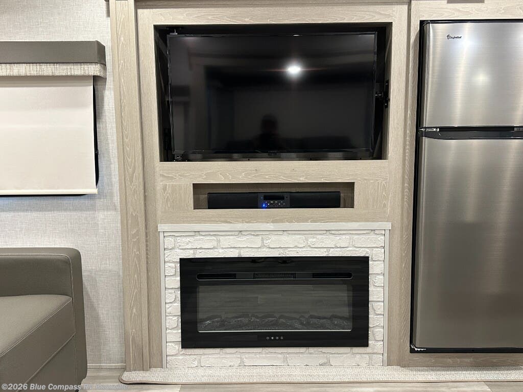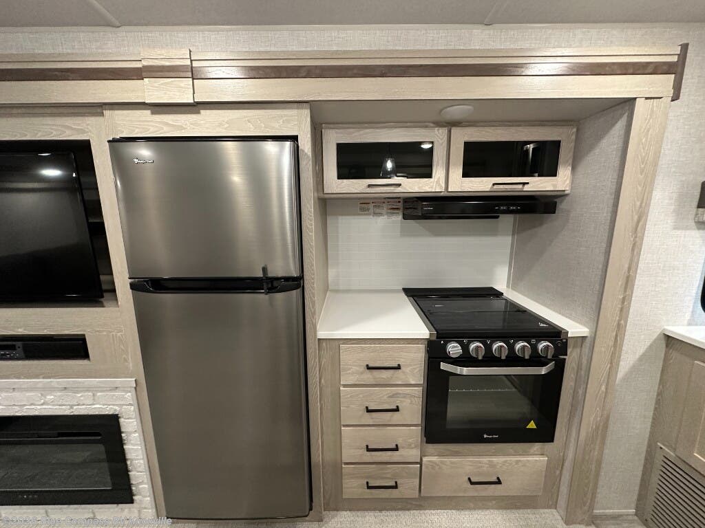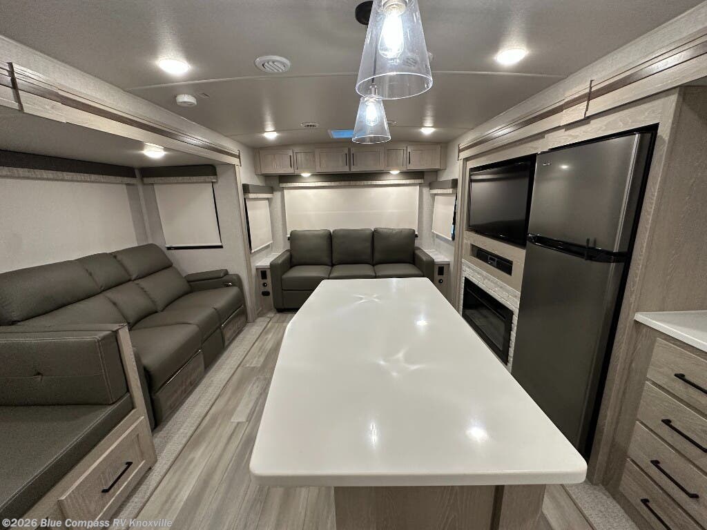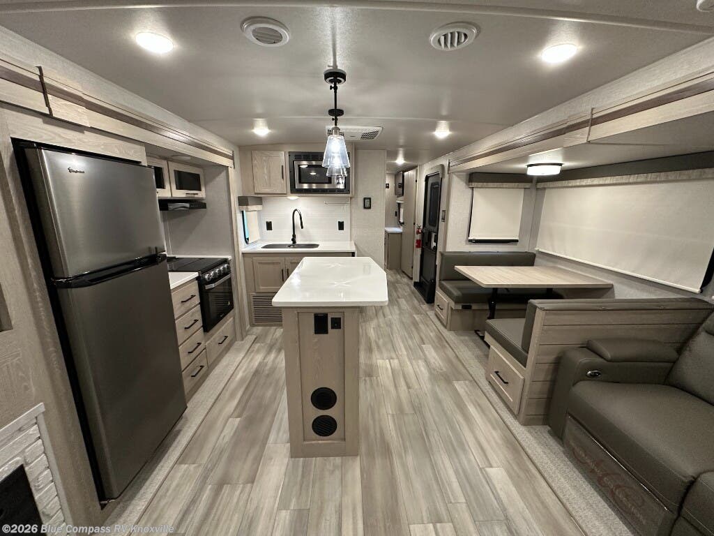 If you enjoy entertaining friends while camping, this trailer offers seating for nine in the combined living and kitchen area on the hide-a-bed sofa, the theater seats and the booth dinette. Everyone can visit, watch the LED TV and enjoy the fireplace all while the cook is preparing snacks in the kitchen with full amenities. The snacks and drinks can be served from the center island, and everyone can enjoy all the views out of the windows along the rear and door side wall. The full bathroom has two entries for convenience, and the front bedroom offers a queen bed slide for more floor space or choose a king option, plus plenty of storage. And the two 11' awnings offer an outdoor living area after you add your camping chairs.