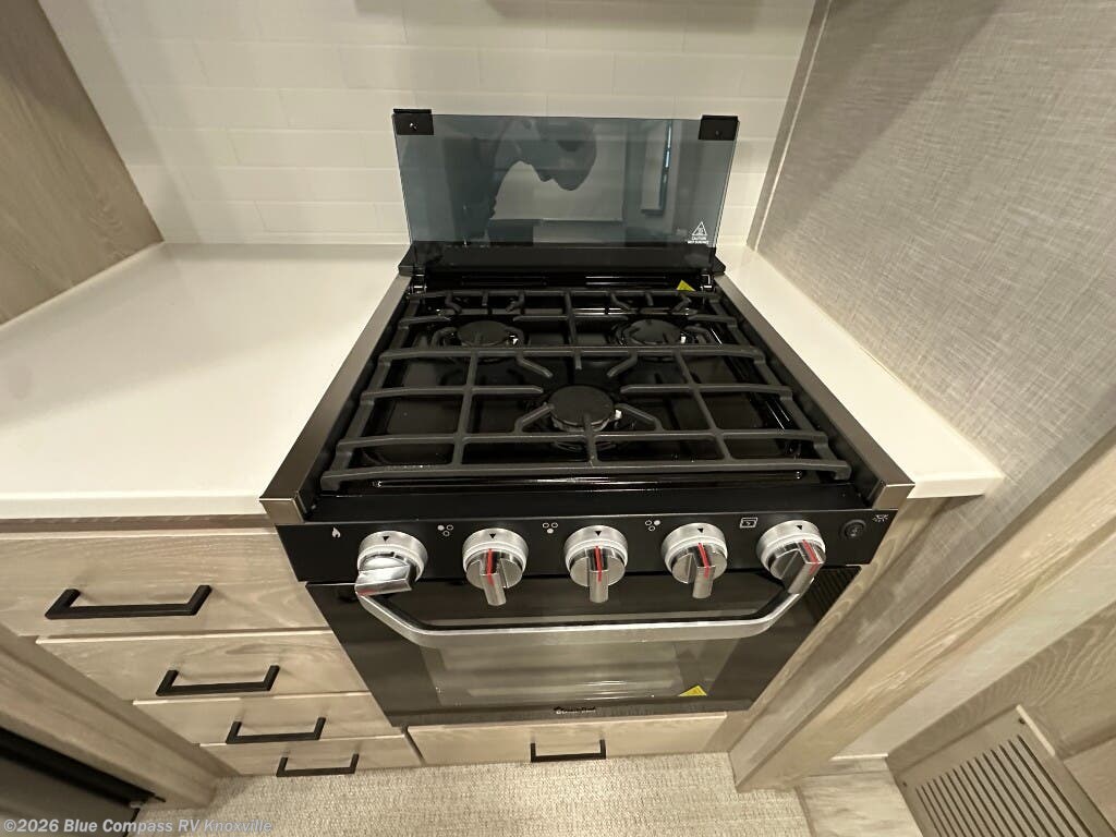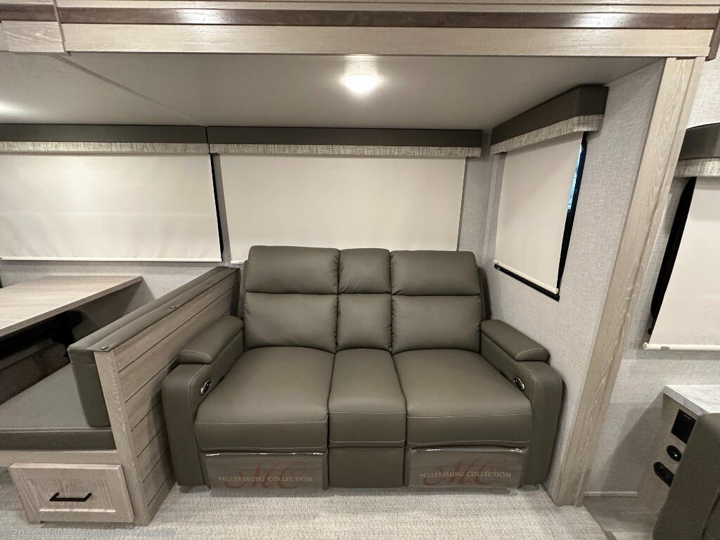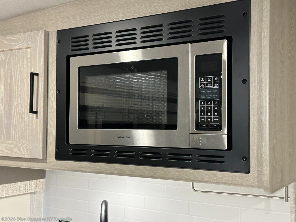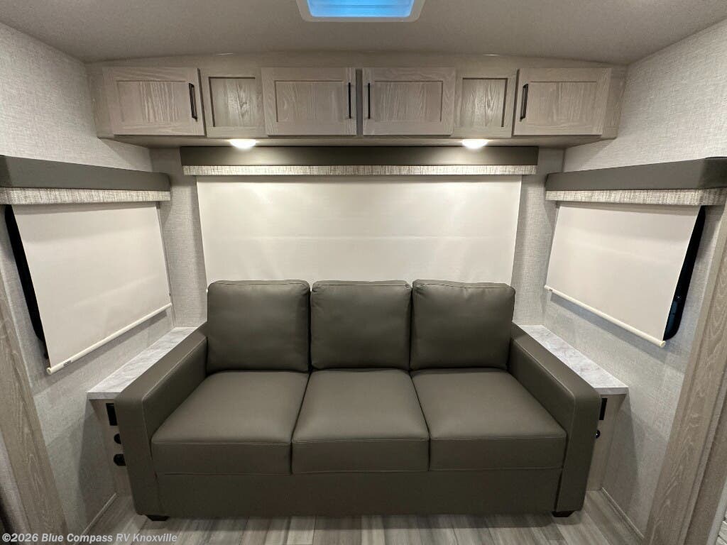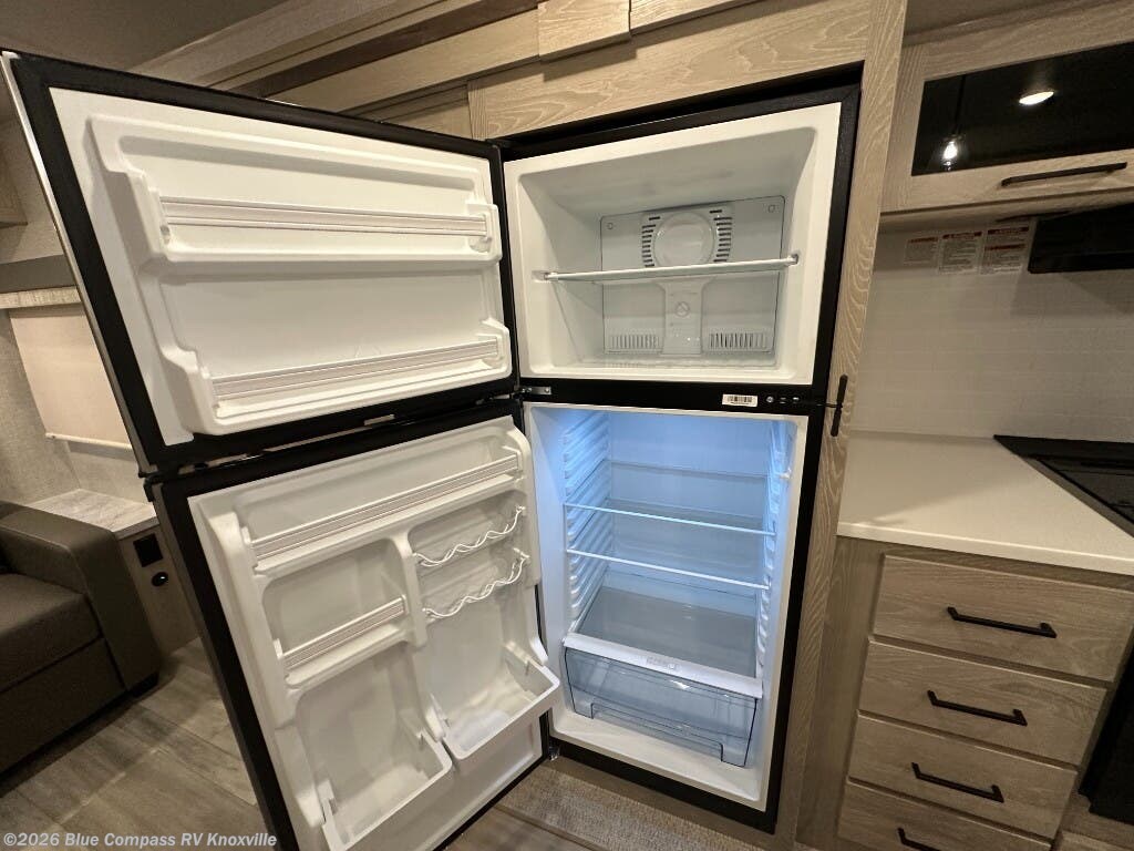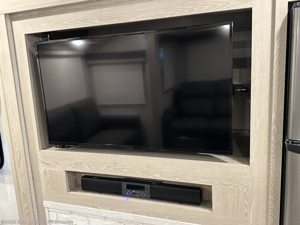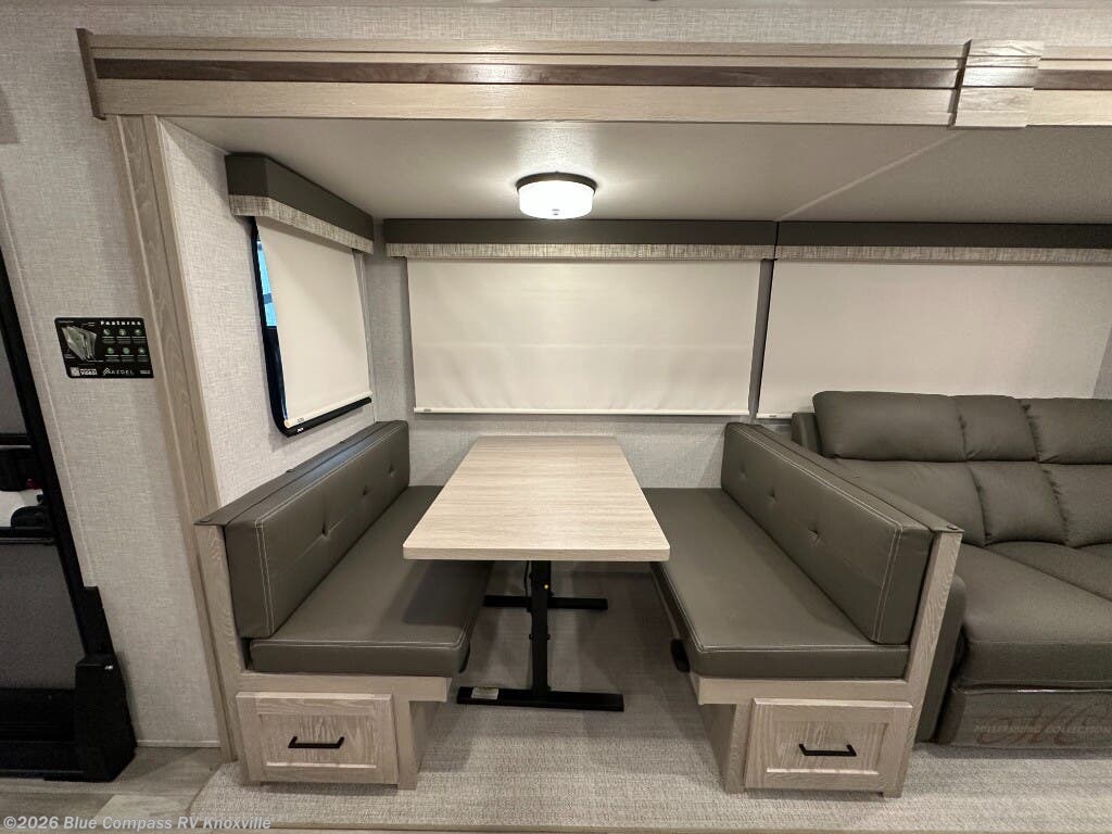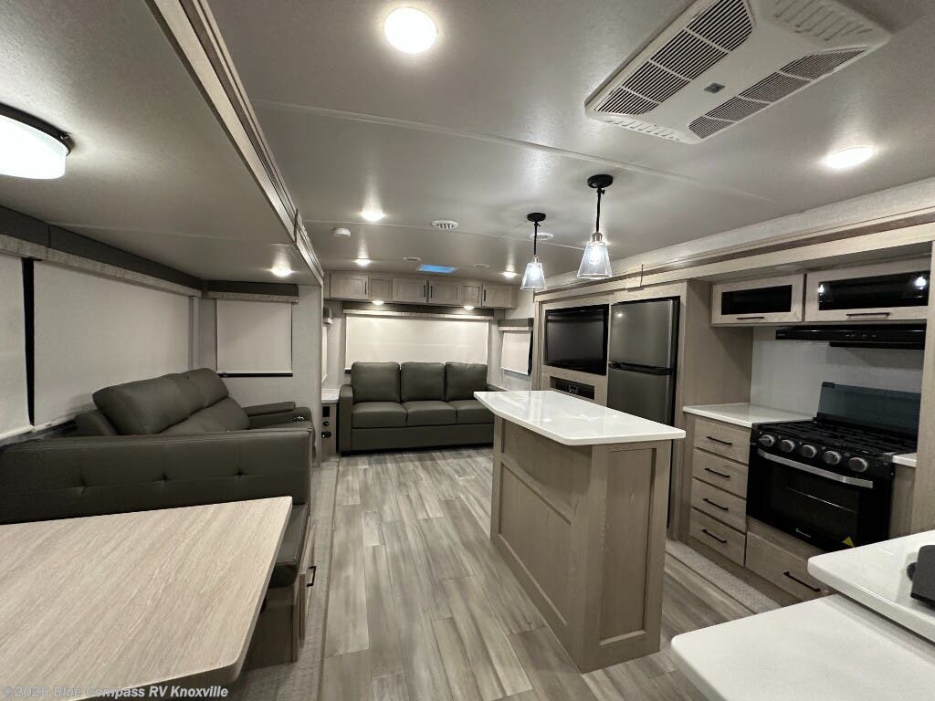 If you enjoy entertaining friends while camping, this trailer offers seating for nine in the combined living and kitchen area on the hide-a-bed sofa, the theater seats and the booth dinette. Everyone can visit, watch the LED TV and enjoy the fireplace all while the cook is preparing snacks in the kitchen with full amenities. The snacks and drinks can be served from the center island, and everyone can enjoy all the views out of the windows along the rear and door side wall. The full bathroom has two entries for convenience, and the front bedroom offers a queen bed slide for more floor space or choose a king option, plus plenty of storage. And the two 11' awnings offer an outdoor living area after you add your camping chairs.