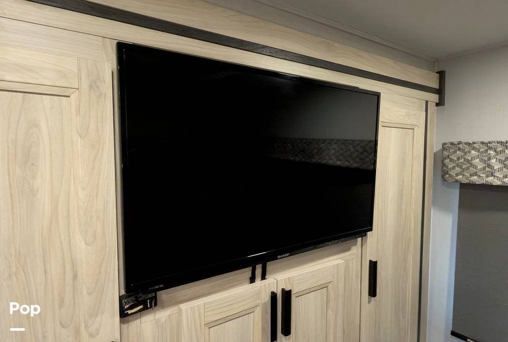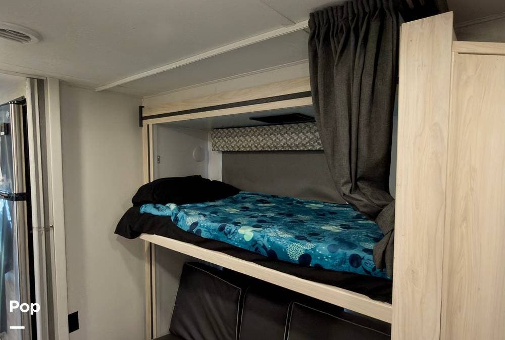 It's a two-slide bunkhouse model with space to sleep up to 10, including a full-size cabover bunk, sleeper sofa, convertible dinette, two bunks with their own TVs, and a private rear bedroom with an RV queen bed.