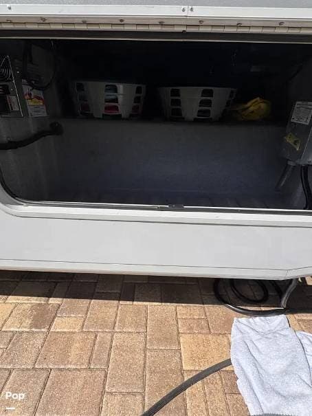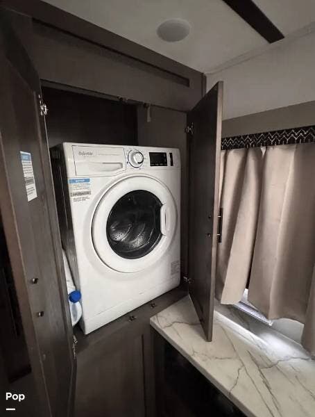 The floorplan includes a private master bedroom, a power overhead full-size bunk, a full bathroom, and a well-appointed kitchen. A combo washer/dryer means laundry day stays easy--no campground laundromats required.