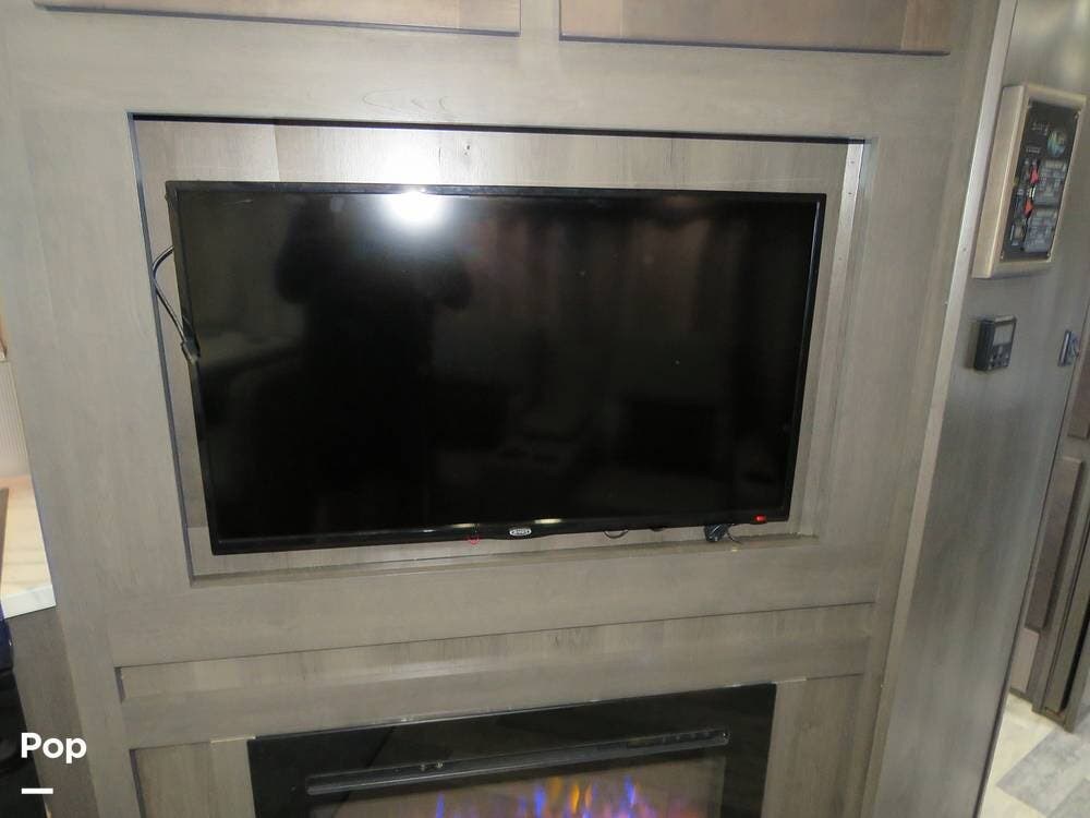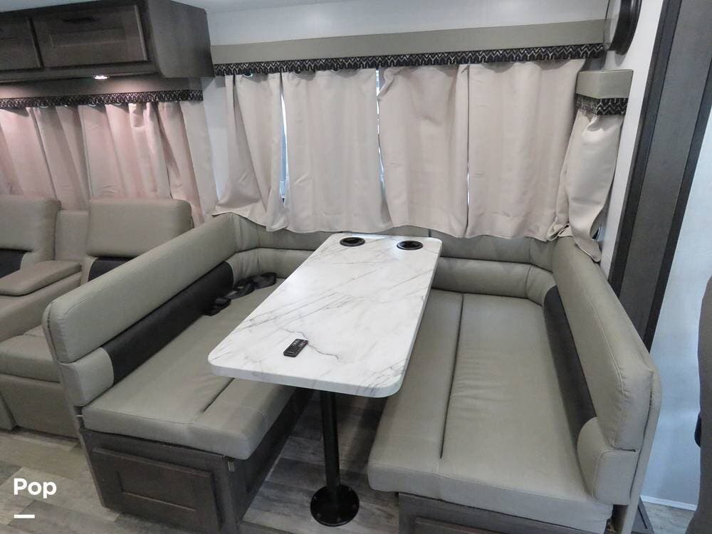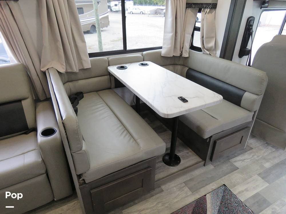 The living area is set up for relaxing or entertaining, with comfortable seating, a dinette, and a 40" flat-screen TV paired with a new Roku soundbar--perfect for movie nights or winding down after a day of exploring.