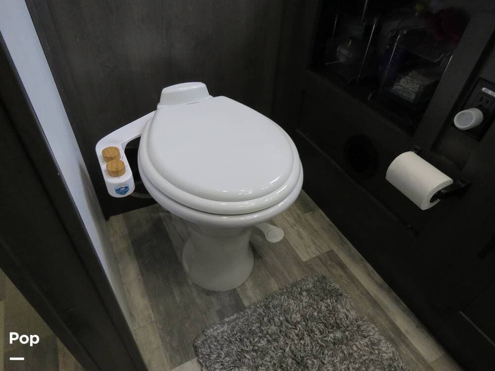 The floor plan includes a private master bedroom, a power-overhead full-size bunk, a full bathroom, and a well-appointed kitchen. A combo washer/dryer means laundry day stays easy--no campground laundromats required.