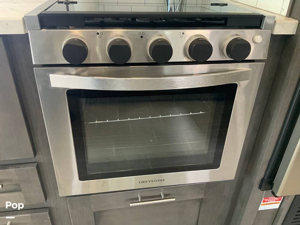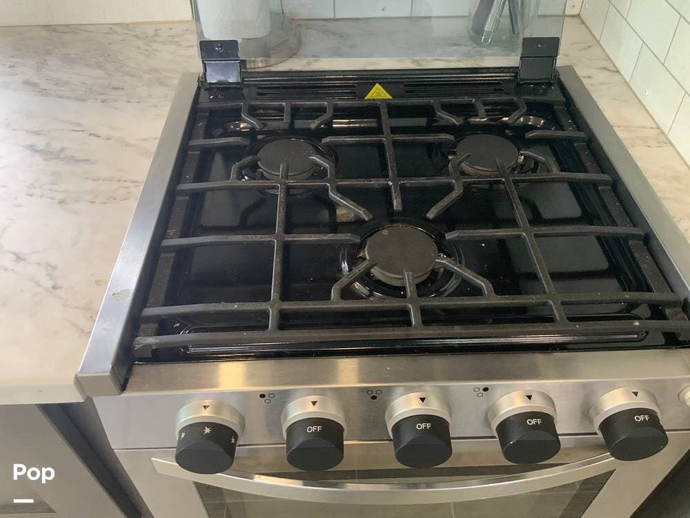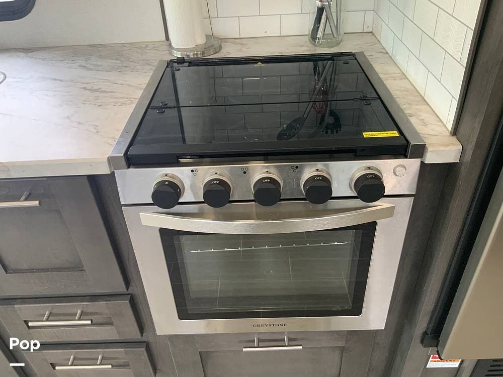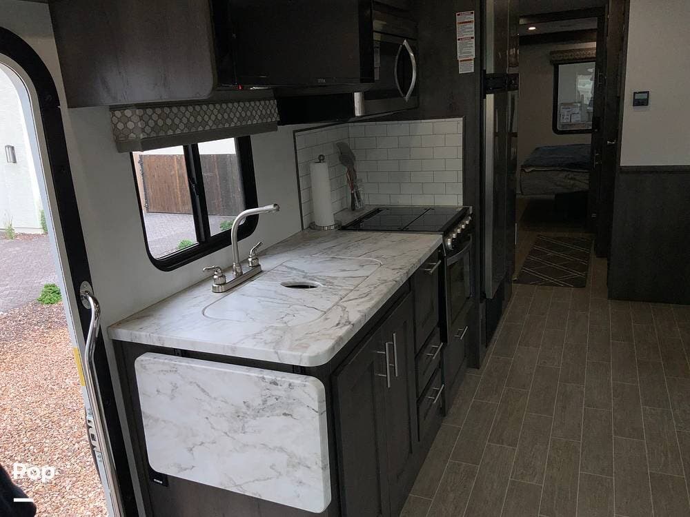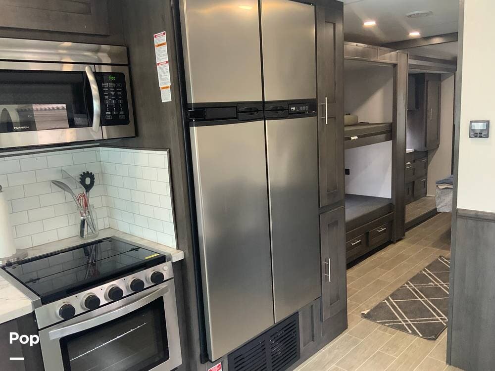 The kitchen features solid-surface countertops, a residential-style refrigerator, a three-burner stove with oven, a microwave, and ample pantry space, making it ideal for both short trips and extended stays.