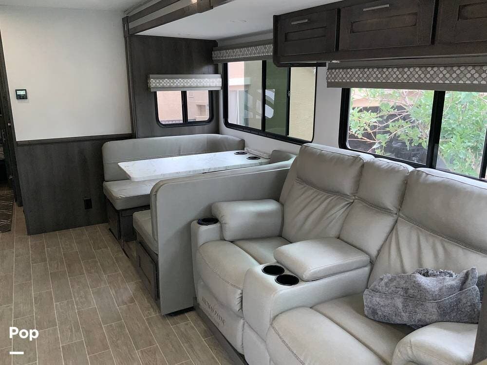 One of the top features of this coach is its exceptionally spacious and functional floor plan. With dual slide-outs expanding the living and kitchen area, the interior feels more like a residential space than an RV. The layout offers plenty of seating options, including a power theater sofa, convertible dinette, and swiveling captain's chairs.
