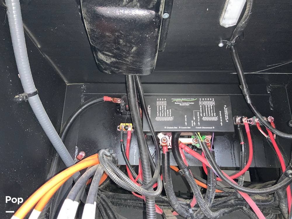 Multiple high-definition TVs, a Bluetooth-enabled sound system, and pre-wiring for satellite and solar provide entertainment. USB charging ports are conveniently placed throughout the coach, and the 50-amp electrical service with a powerful onboard generator ensures reliable power whether parked at a campsite or traveling off-grid.