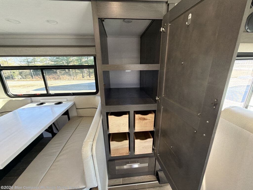 You won't believe all that the rear private bedroom has to offer in this motorhome! It features a 72" x 80" king bed slide with overhead cabinets, a dresser with a 32" TV and overhead cabinets, wardrobes on either side of the dresser, and a desk with wardrobes on either. And one of the wardrobes features an optional stacked washer and dryer for convenience! The separated bathroom makes it easy for one person to freshen up in the shower with a seat while another uses the private toilet and sink. After a long day of traveling, you can relax on either the Thomas Payne theater seating with heat and massage across from the 5,000 BTU fireplace with a 40" LED TV above it or play a game and eat a meal at the Dream Dinette. There is also a 42" x 80" P2K Euro loft power bunk over cab for more sleeping space!