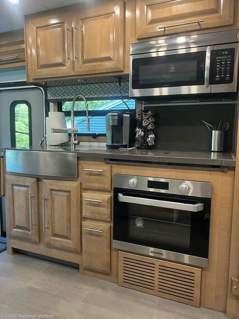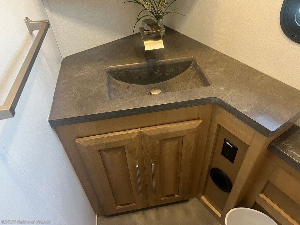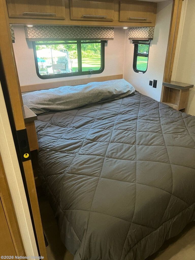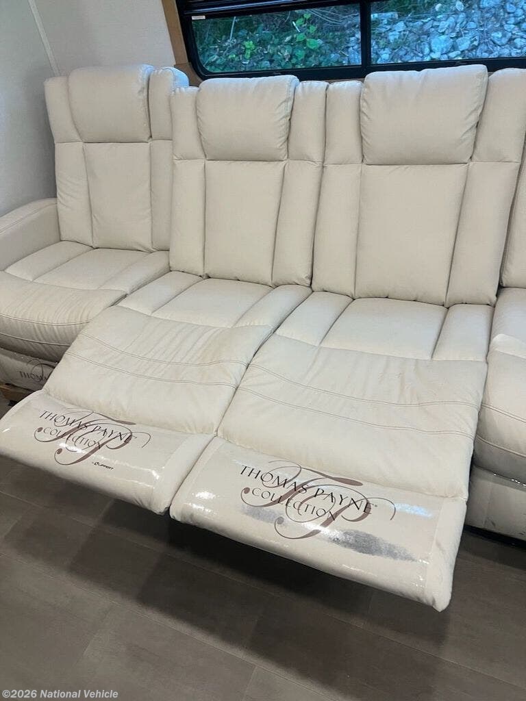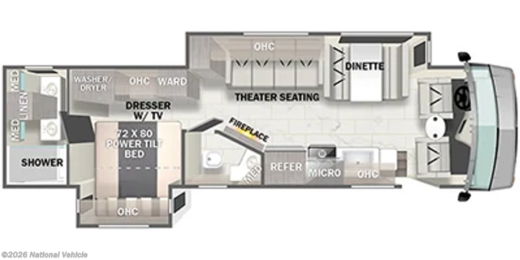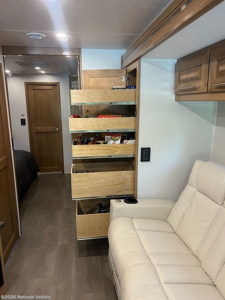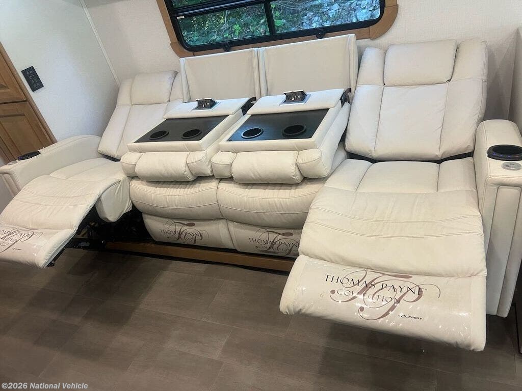 Comfort and convenience is found all throughout this motorhome! Starting with the full rear master bath that has a 42" x 30" shower with a seat and a dual sink vanity, plus it leads into the private bedroom. Inside the bedroom is a 72" x 80" king bed slide with overhead cabinets across from a dresser with overhead cabinets and a 32" LED TV, a wardrobe, and another wardrobe that is prepped to add an optional stackable washer and dryer. The half bathroom is conveniently near the fully equipped kitchen so you can get back to creating your best home cooked meals fast. Relax in true comfort each night by either playing games at the booth dinette or on the theater seating that comes with power recline, heat, and massage!