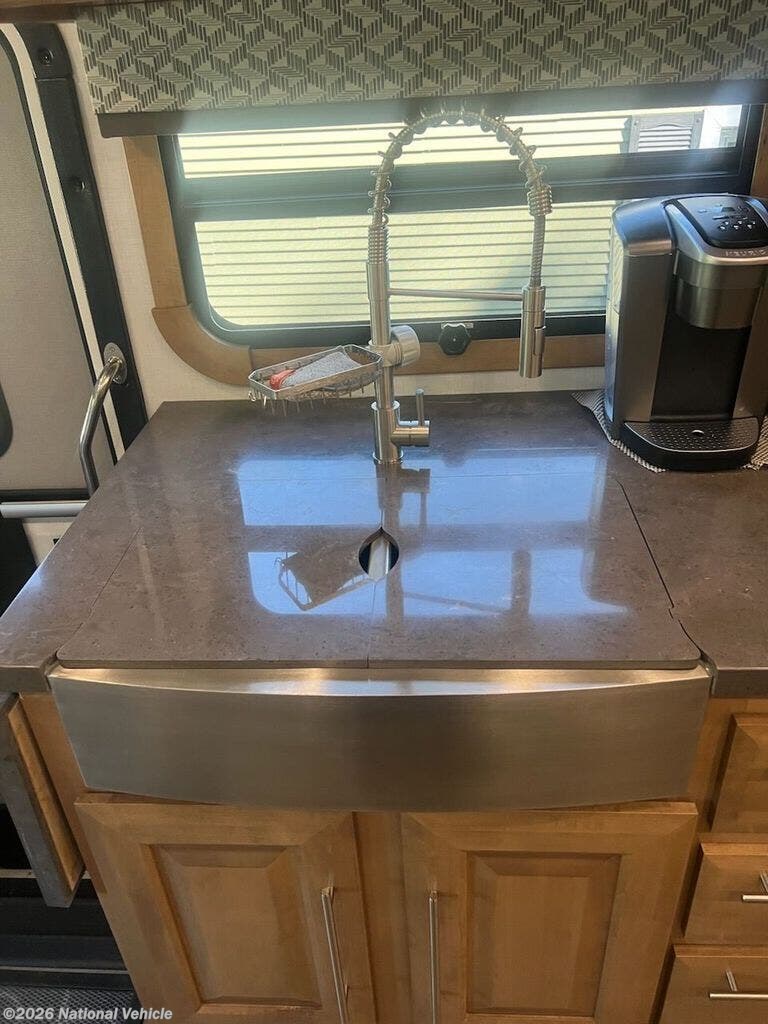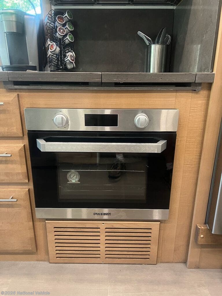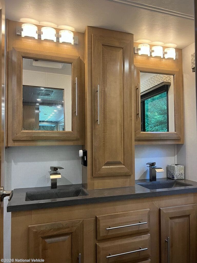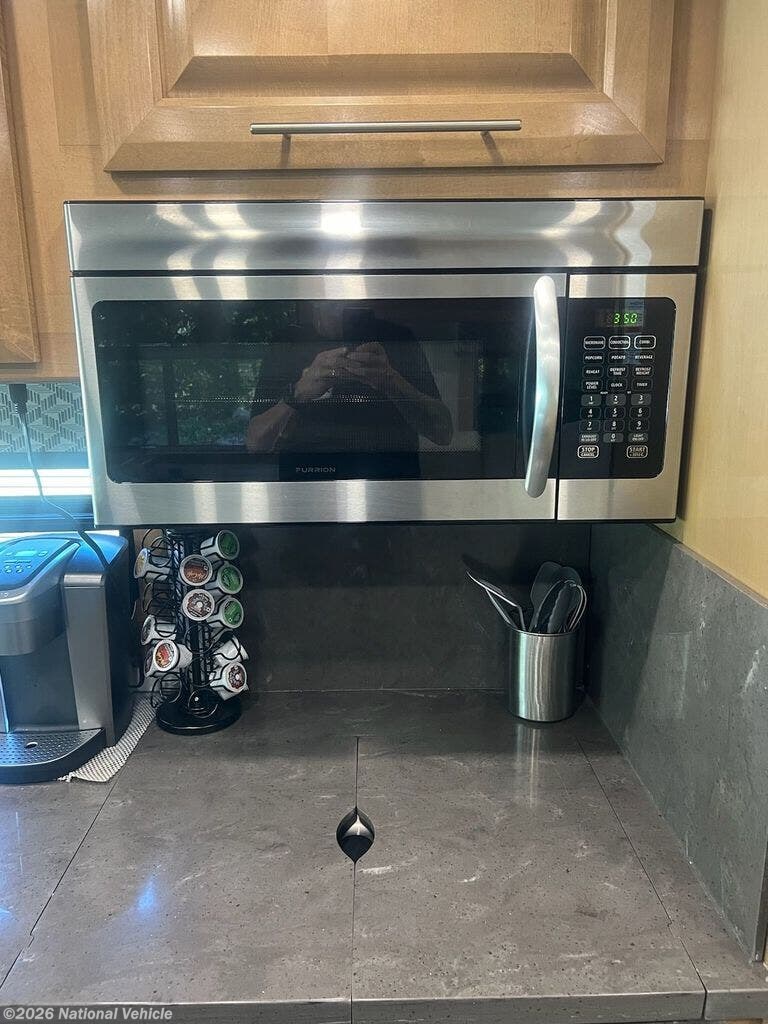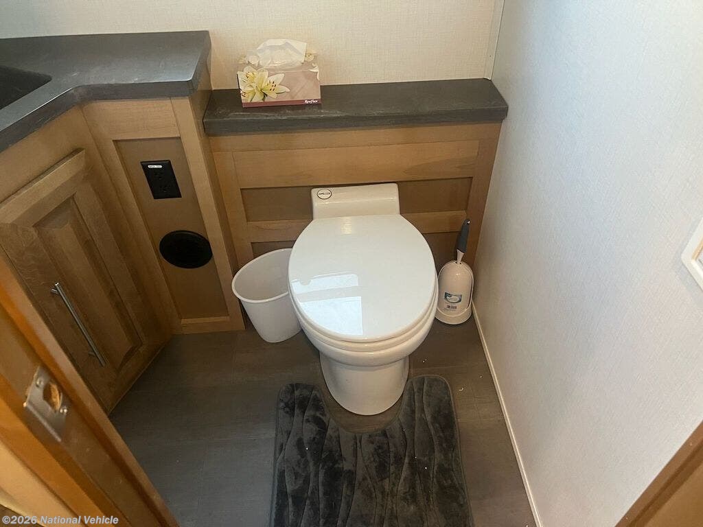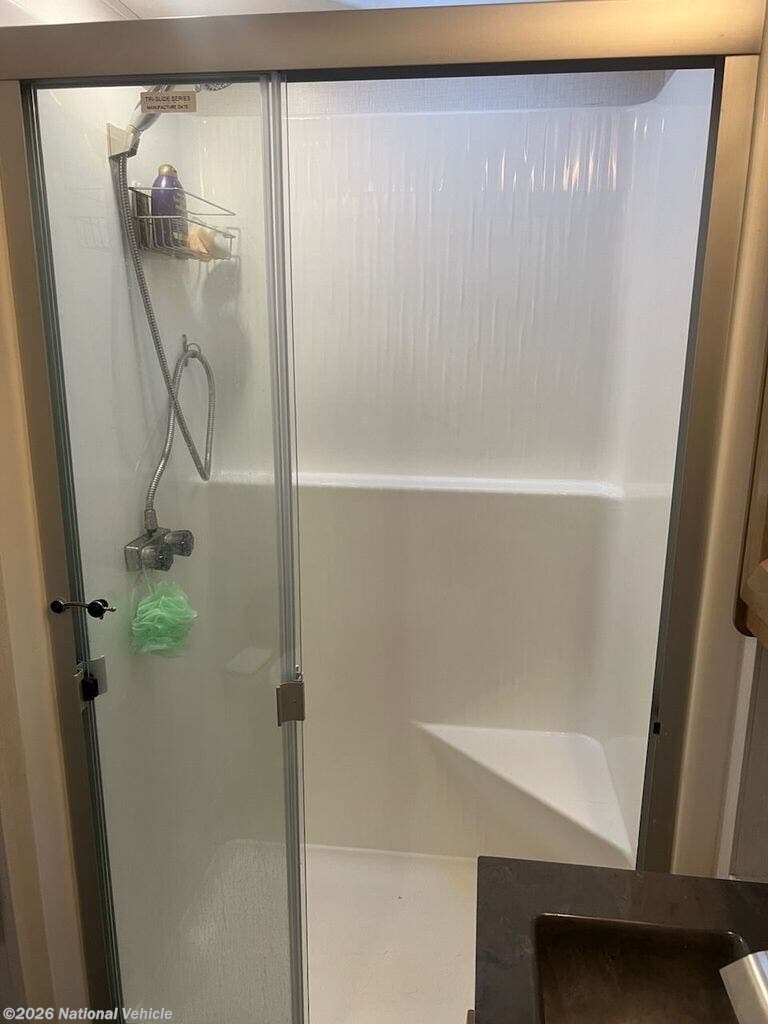 Comfort and convenience is found all throughout this motorhome! Starting with the full rear master bath that has a 42" x 30" shower with a seat and a dual sink vanity, plus it leads into the private bedroom. Inside the bedroom is a 72" x 80" king bed slide with overhead cabinets across from a dresser with overhead cabinets and a 32" LED TV, a wardrobe, and another wardrobe that is prepped to add an optional stackable washer and dryer. The half bathroom is conveniently near the fully equipped kitchen so you can get back to creating your best home cooked meals fast. Relax in true comfort each night by either playing games at the booth dinette or on the theater seating that comes with power recline, heat, and massage!