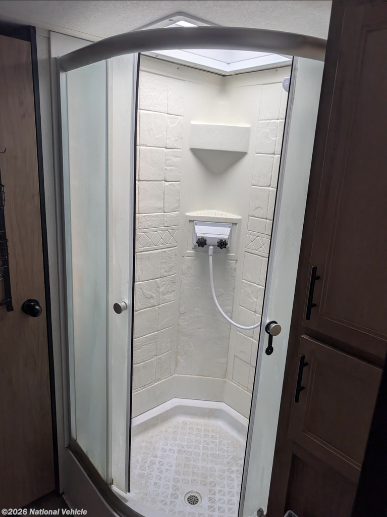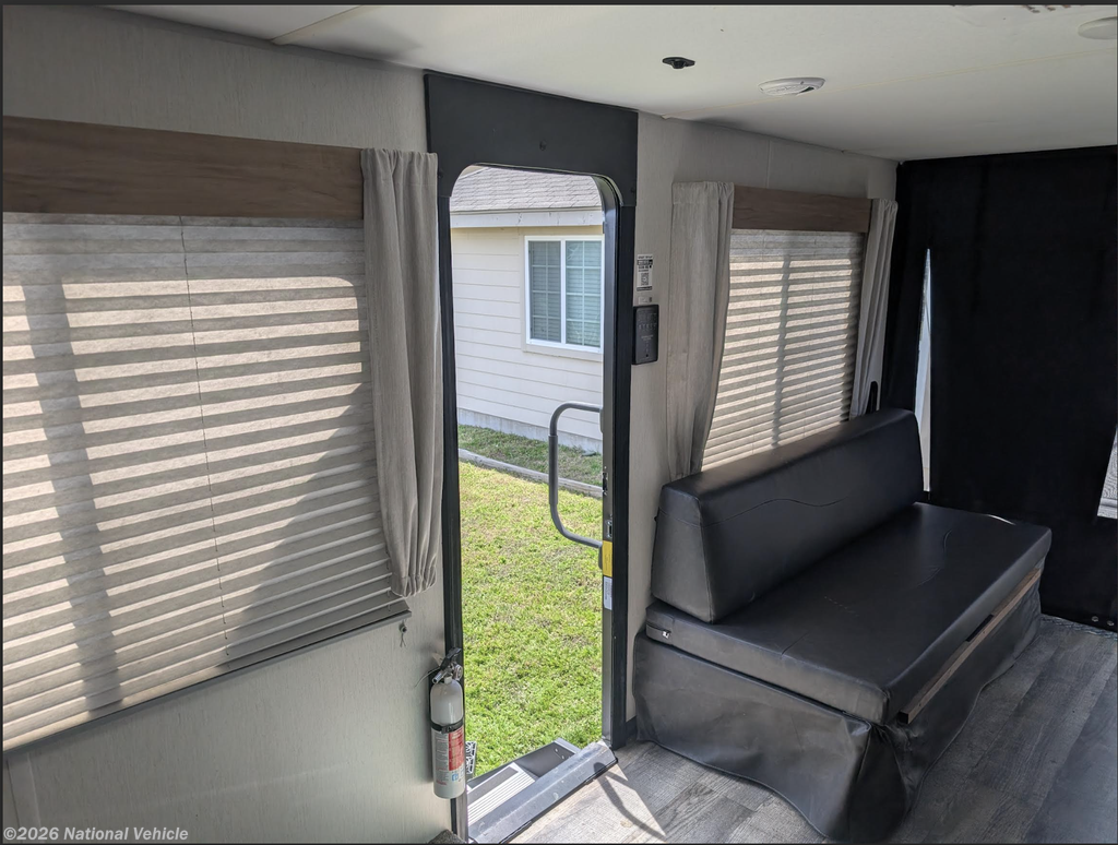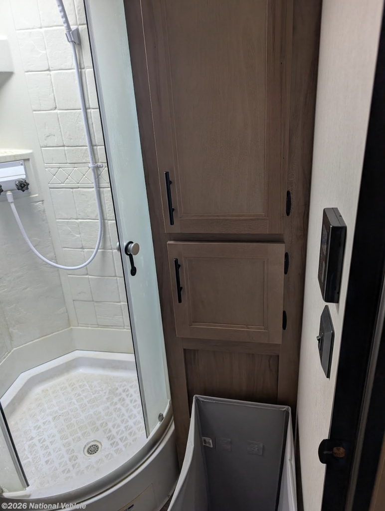 Inside, you'll find a well-appointed kitchen complete with microwave, generous counter space, and everything you need to prepare meals no matter the weather. The walk-through bathroom spans the full width of the coach, offering residential-style space and convenience rarely found in this class.