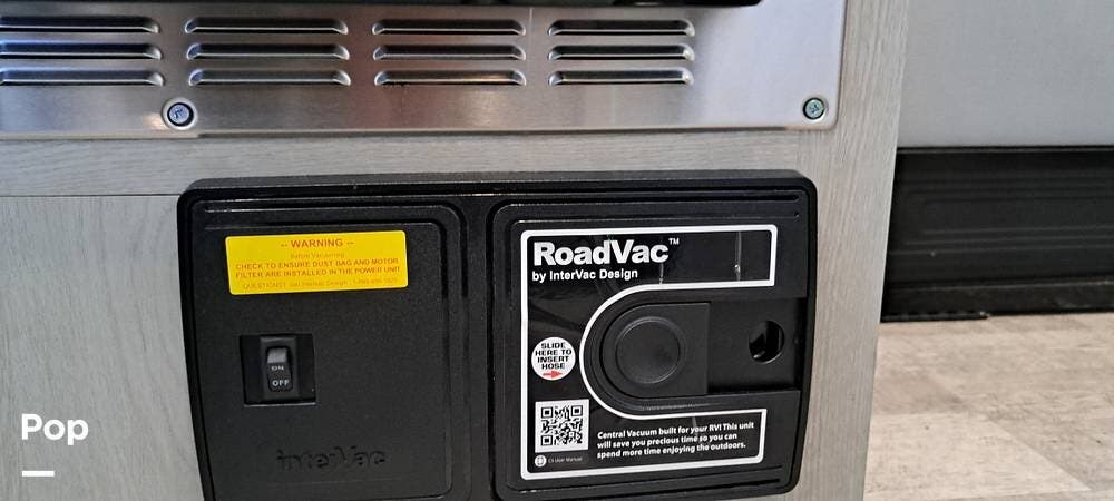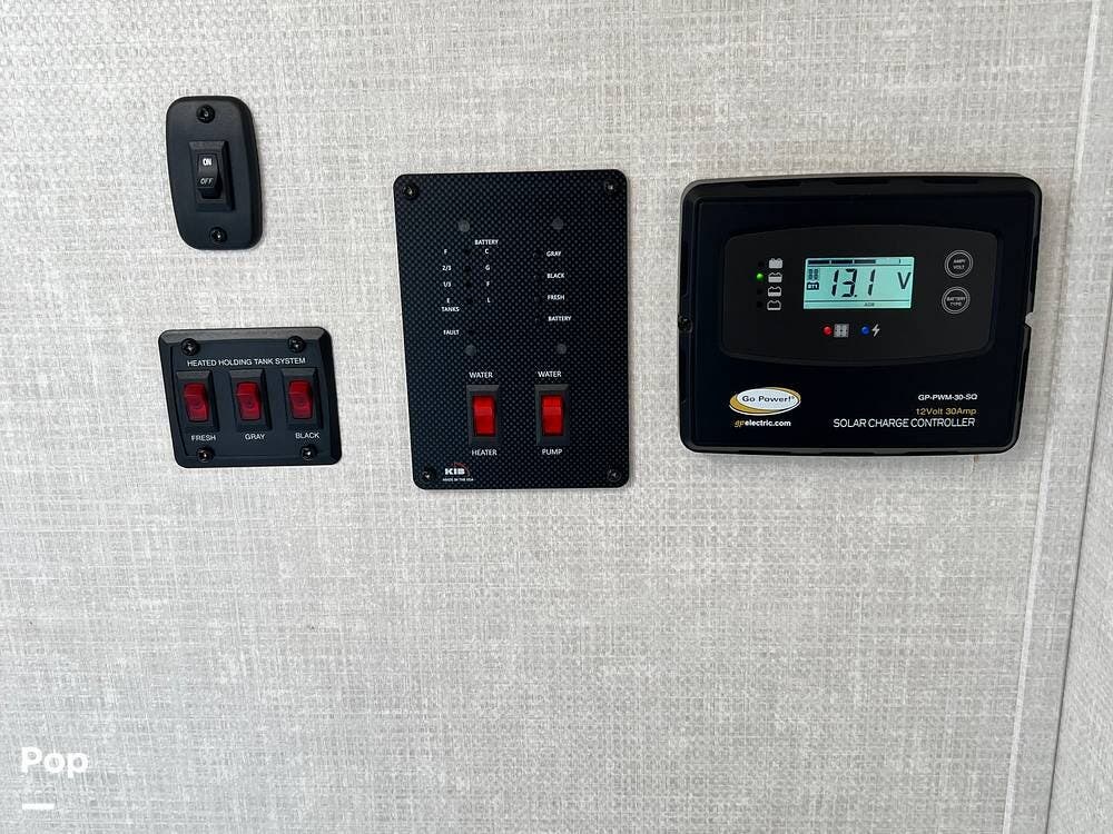 Other interior features include a central vacuum system, additional storage, blackout window screens, several USB charging areas, a control center with solar controls, and the heated tank system controls.