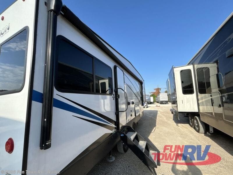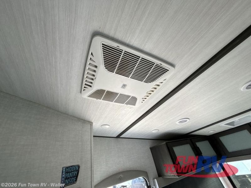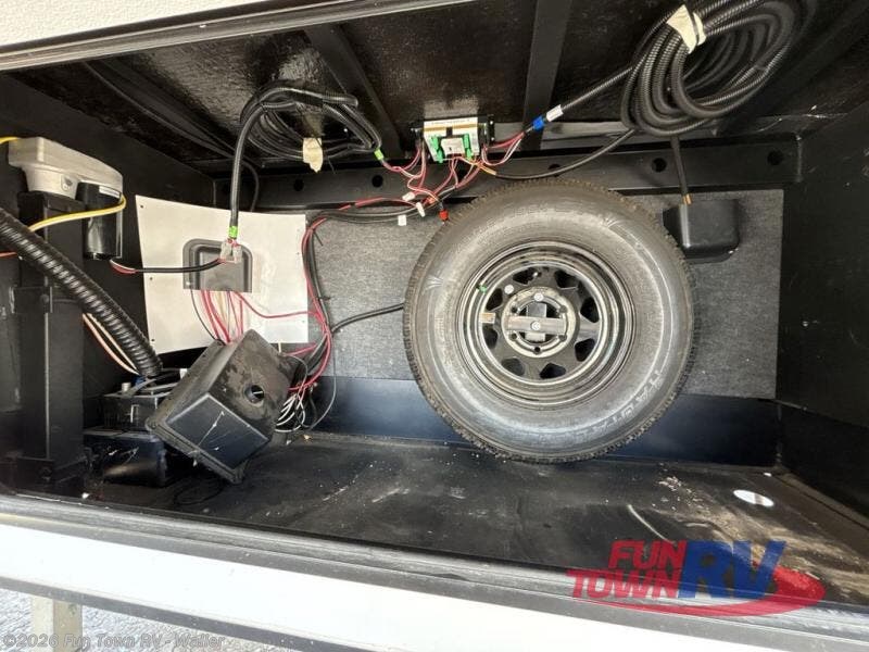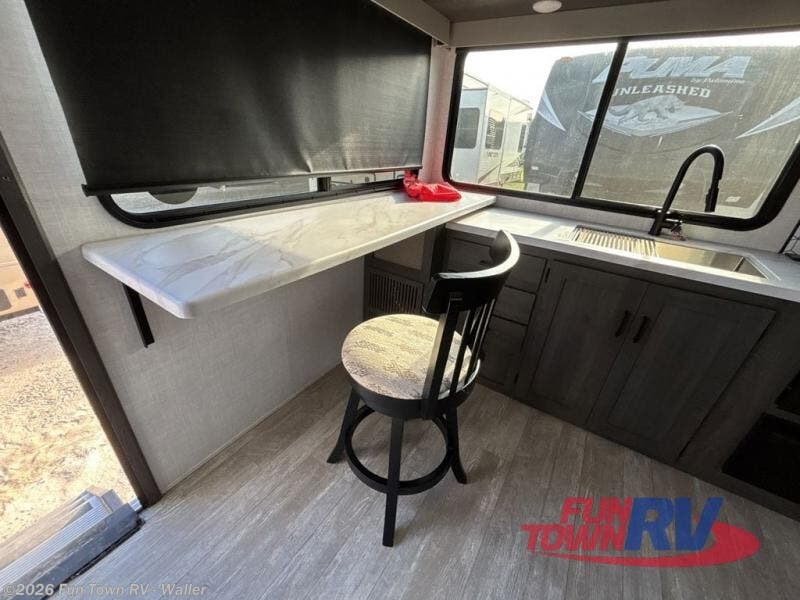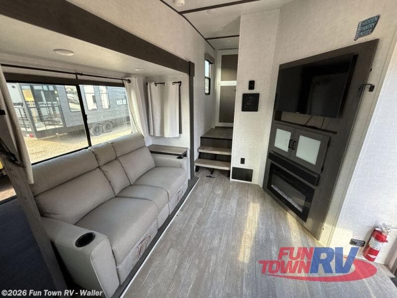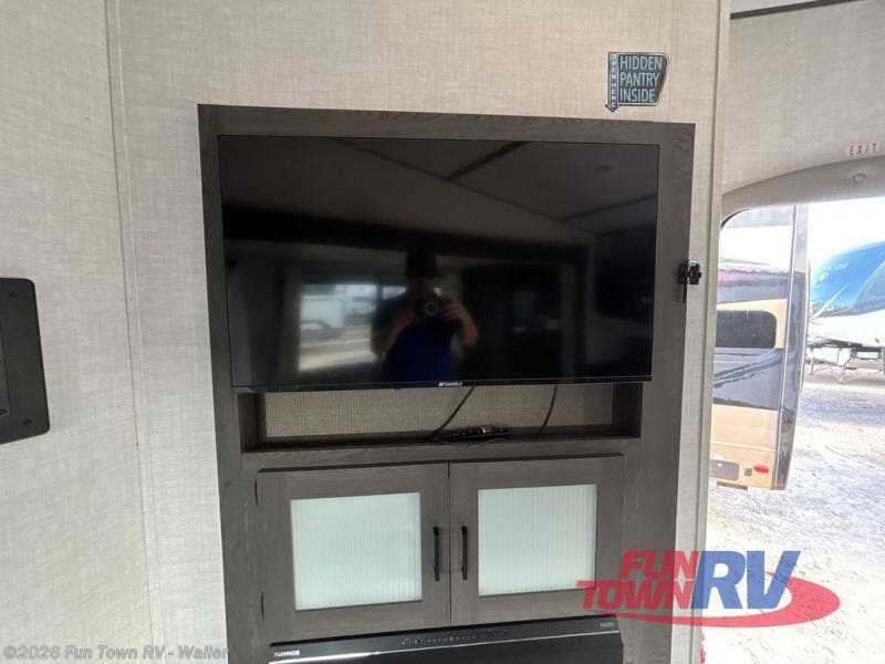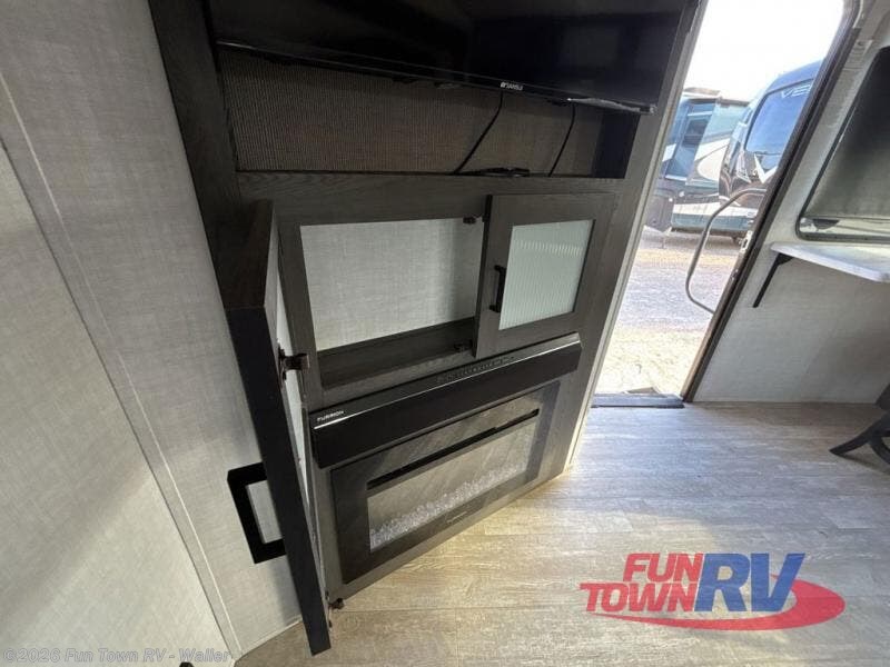 This unit is a perfect couples coach with plenty of space thanks to a large slide opposite the entry door. You will love the rear kitchen which includes large rear facing and camp facing windows to bring your view right inside. You will also find another large window above the theater seat within the slide. Easily enjoy cooking with all the necessary amenities including a 12V refrigerator, microwave oven, range, and sink. Counter space with added bar stools becomes a convenient place to enjoy your meals. A private front bedroom with a queen bed and double wardrobes makes a relaxing retreat when you retire for the evening, and the bathroom features a nice size walk-in shower with skylight for more natural lighting. If you are full-time RVers, you may wish to add the optional washer/dryer that has been prepped for you inside a third wardrobe in the bedroom. You are also sure to love the unobstructed pass-through storage outside for all of your outdoor camping gear and games. There is also some hidden storage to the right of the entry door behind a 40" LED TV and soundbar!