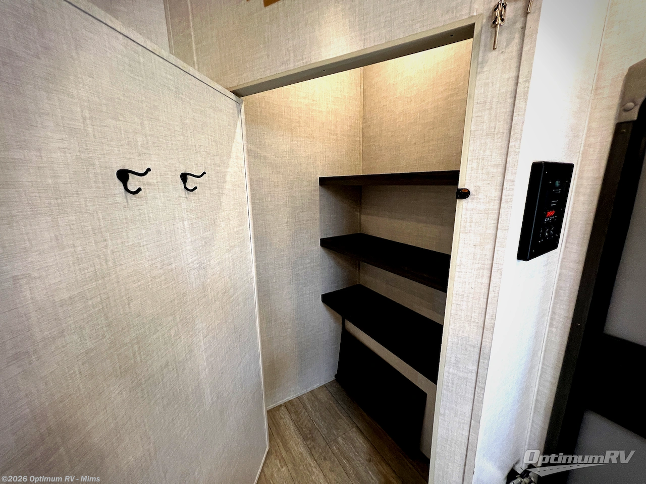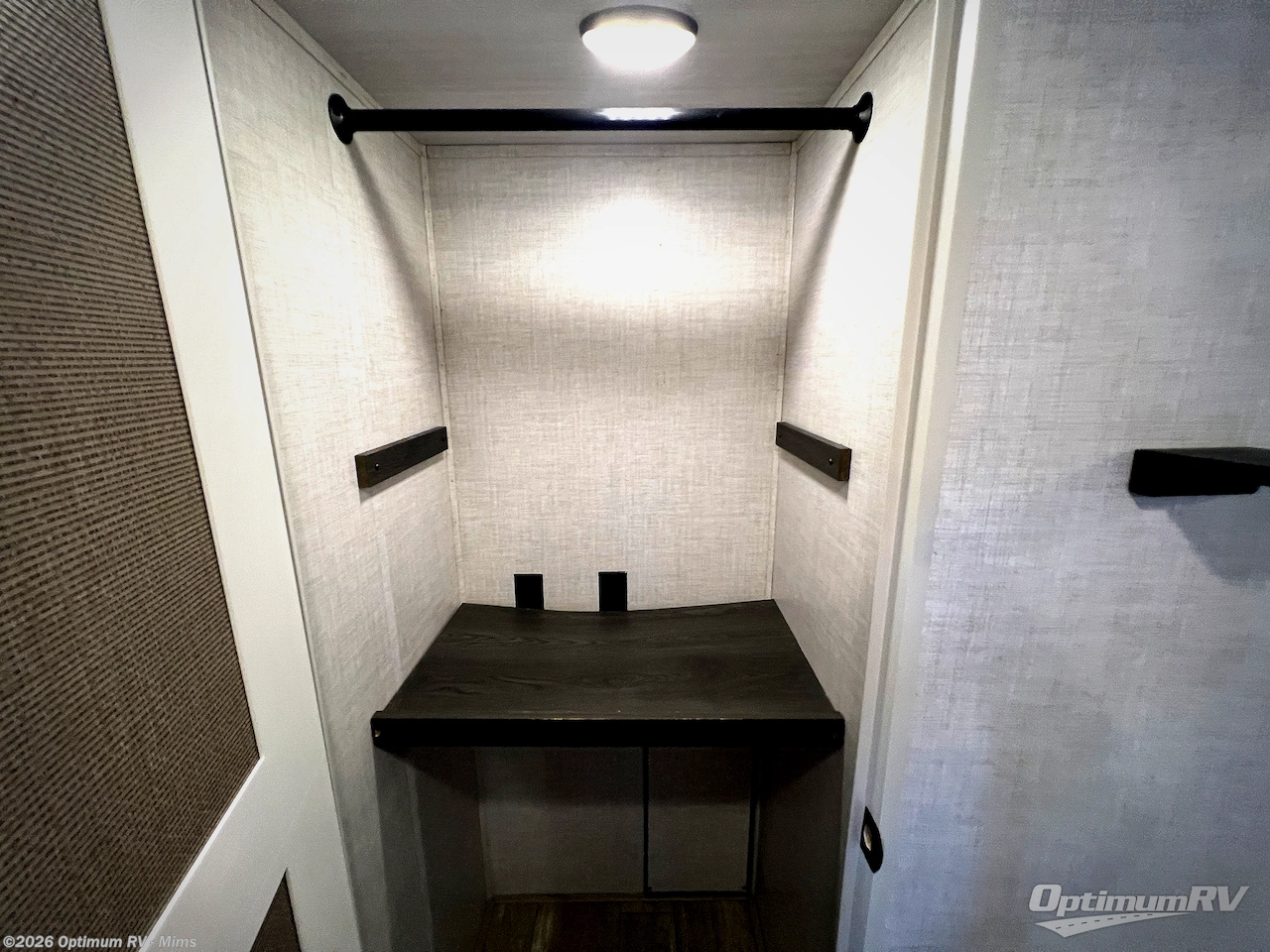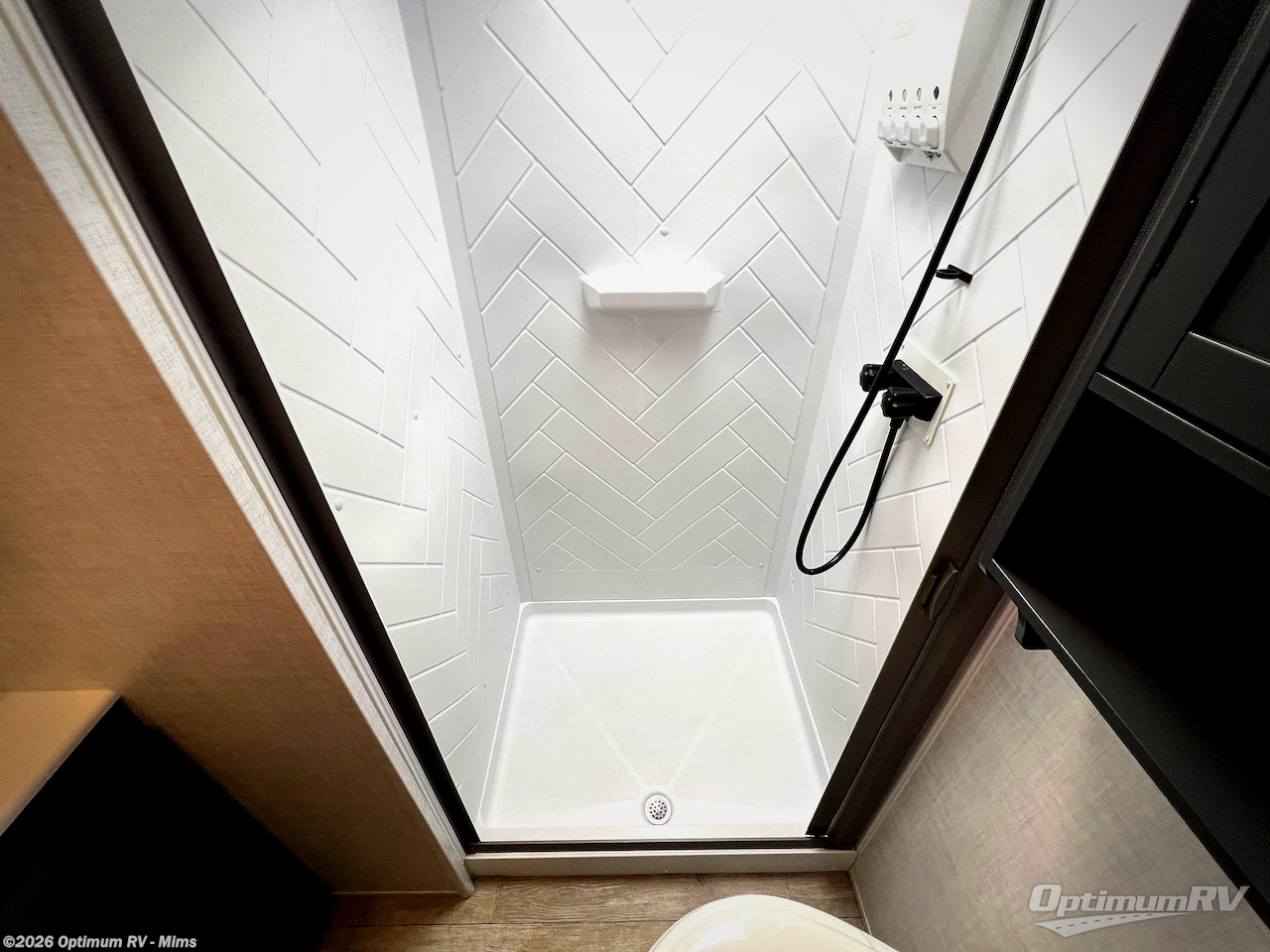 This unit is a perfect couples coach with plenty of space thanks to a large slide opposite the entry door. You will love the rear kitchen which includes large rear facing and camp facing windows to bring your view right inside. You will also find another large window above the theater seat within the slide. Easily enjoy cooking with all the necessary amenities including a 12V refrigerator, microwave oven, range, and sink. Counter space with added bar stools becomes a convenient place to enjoy your meals. A private front bedroom with a queen bed and double wardrobes makes a relaxing retreat when you retire for the evening, and the bathroom features a nice size walk-in shower with skylight for more natural lighting. If you are full-time RVers, you may wish to add the optional washer/dryer that has been prepped for you inside a third wardrobe in the bedroom. You are also sure to love the unobstructed pass-through storage outside for all of your outdoor camping gear and games. There is also some hidden storage to the right of the entry door behind a 40" LED TV and soundbar!