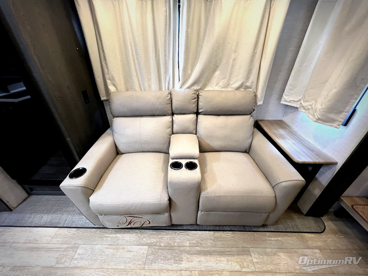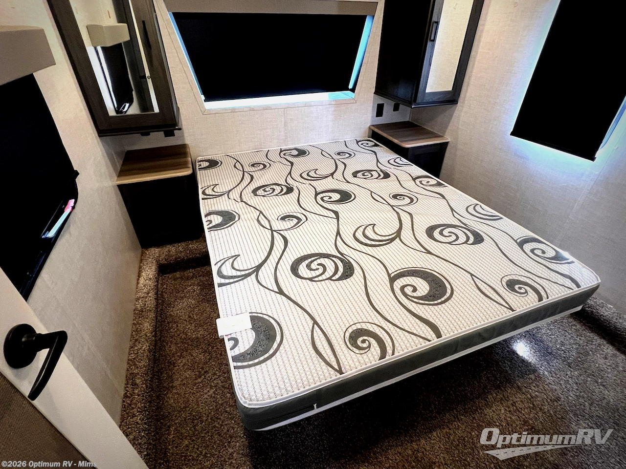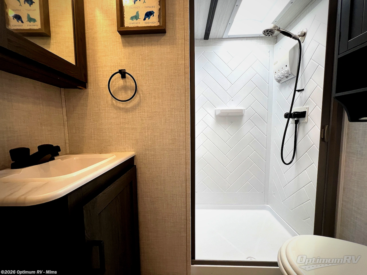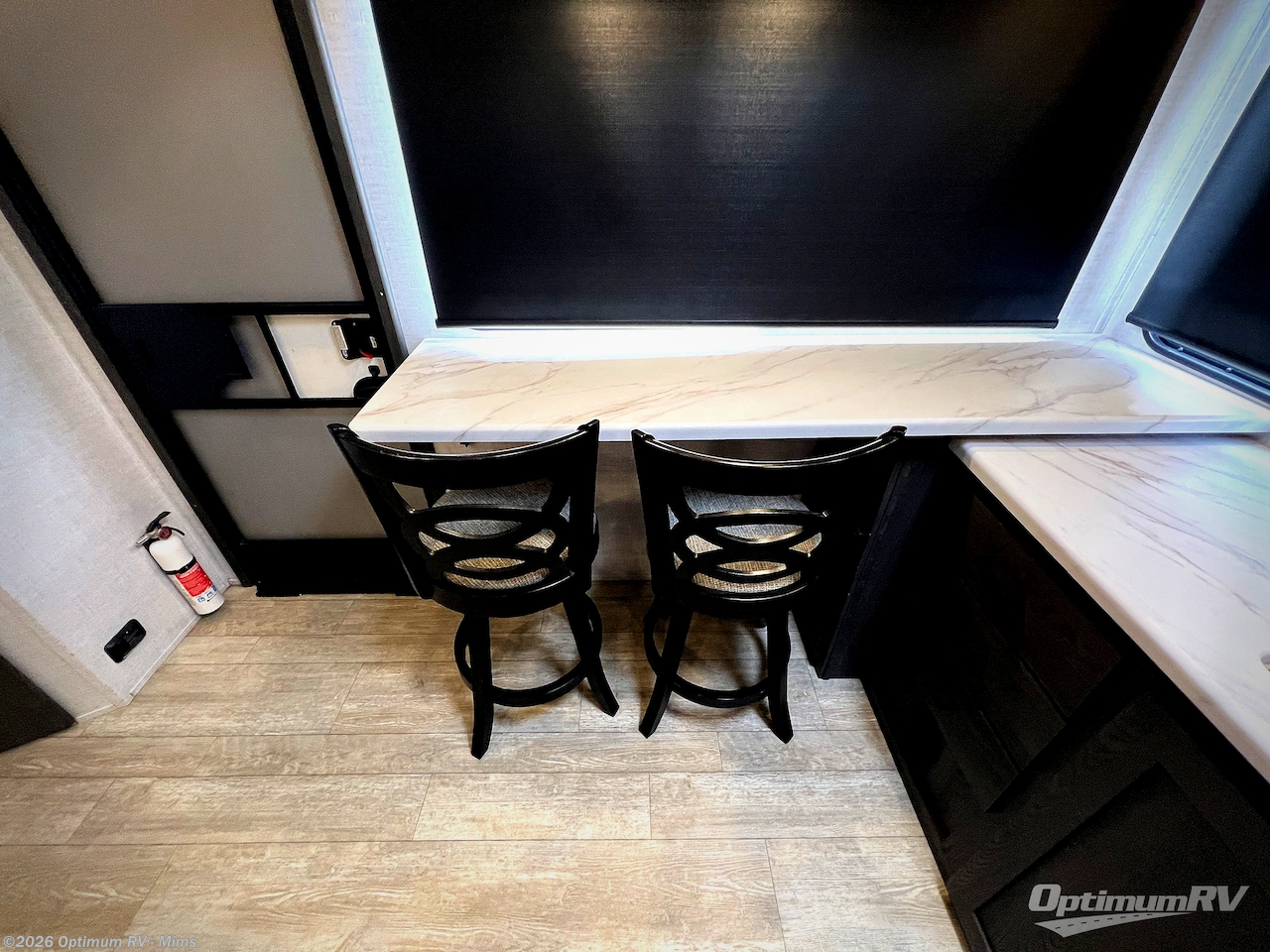 This unit is a perfect couples coach with plenty of space thanks to a large slide opposite the entry door. You will love the rear kitchen which includes large rear facing and camp facing windows to bring your view right inside. You will also find another large window above the theater seat within the slide. Easily enjoy cooking with all the necessary amenities including a 12V refrigerator, microwave oven, range, and sink. Counter space with added bar stools becomes a convenient place to enjoy your meals. A private front bedroom with a queen bed and double wardrobes makes a relaxing retreat when you retire for the evening, and the bathroom features a nice size walk-in shower with skylight for more natural lighting. If you are full-time RVers, you may wish to add the optional washer/dryer that has been prepped for you inside a third wardrobe in the bedroom. You are also sure to love the unobstructed pass-through storage outside for all of your outdoor camping gear and games. There is also some hidden storage to the right of the entry door behind a 40" LED TV and soundbar!