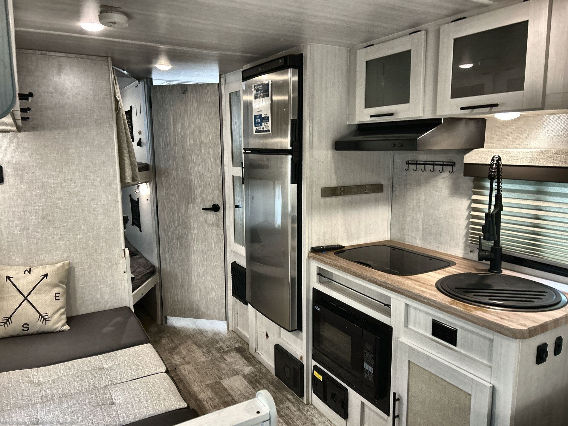 With this No Boundaries travel trailer, you can go to places you've never been before! This rugged trailer offers you lots of storage for your favorite equipment with the J-cradle kayak holder, two vortex bars, and RVT track all from Rhino Rack. The 16' power awning will protect you while you're outside having fun, and once you make your way inside, you can sit down at the 30" x 75" booth dinette for some dinner. The 44" x 74" bunks will give you extra sleeping space without taking up too much room, and the Murphy bed also utilizes space well by folding away during the day to reveal a sofa. Add the optional Un-Plugged package to take your camping experience to a whole new level. Some features included in this package are 600 watts of solar, premium Lithium-ion batteries, a 3,000 watt inverter charger, a high-efficiency A/C, and more.