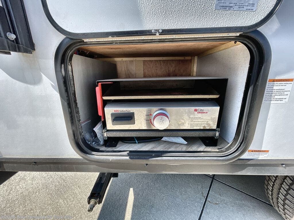 This single axle travel trailer is perfect for four campers since it includes a front queen-size bed/sofa bed with a flip-down bunk above, plus a second flip-down bunk across from the galley. There is a bike sized cargo door outside and a 24" tall removable cargo net inside so your gear stays secure. Meals can be prepared in the microwave or on the two burner cooktop, and there is an 11 cu. ft. dual swinging 12V refrigerator for your perishables. After dinner you can head outdoors to relax under the 10' power awning with adjustable legs.