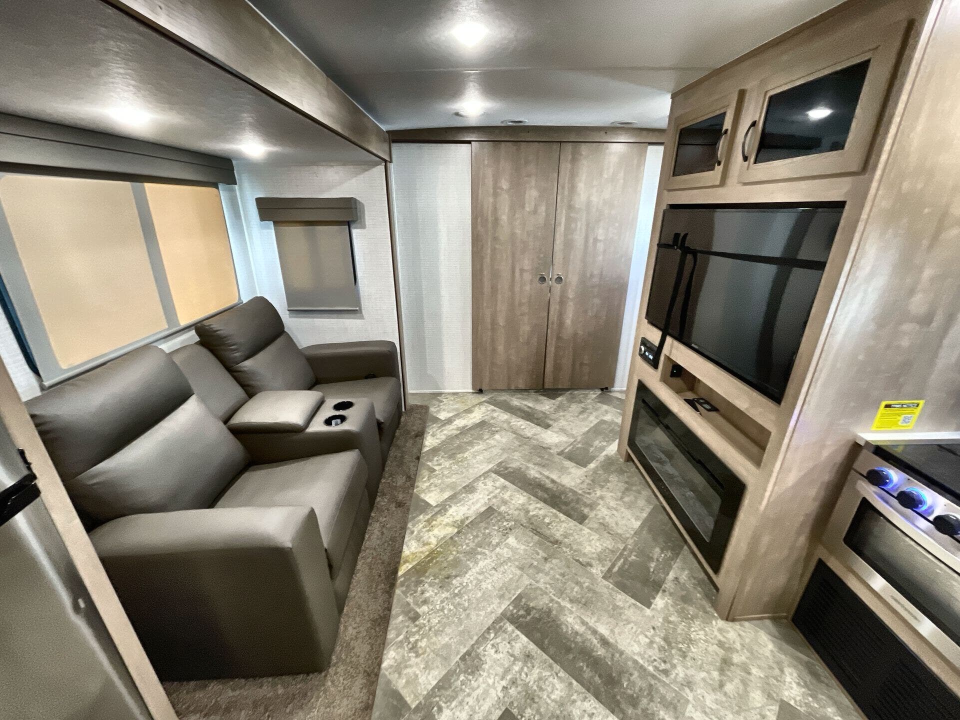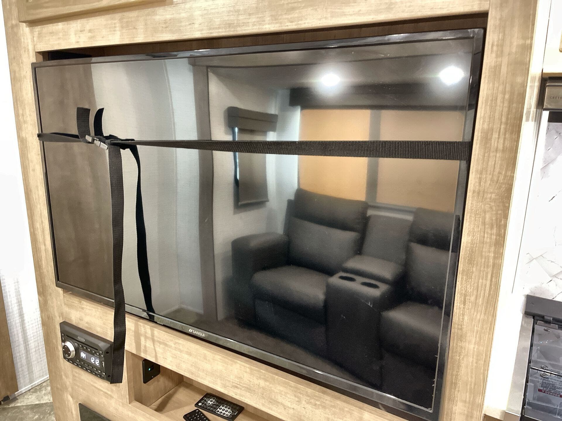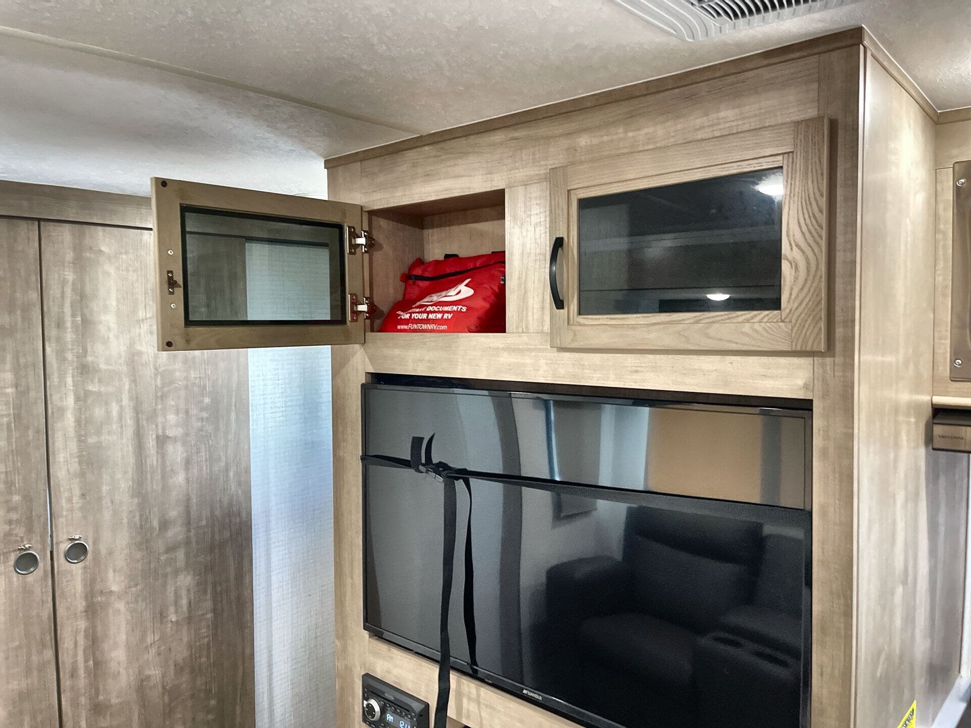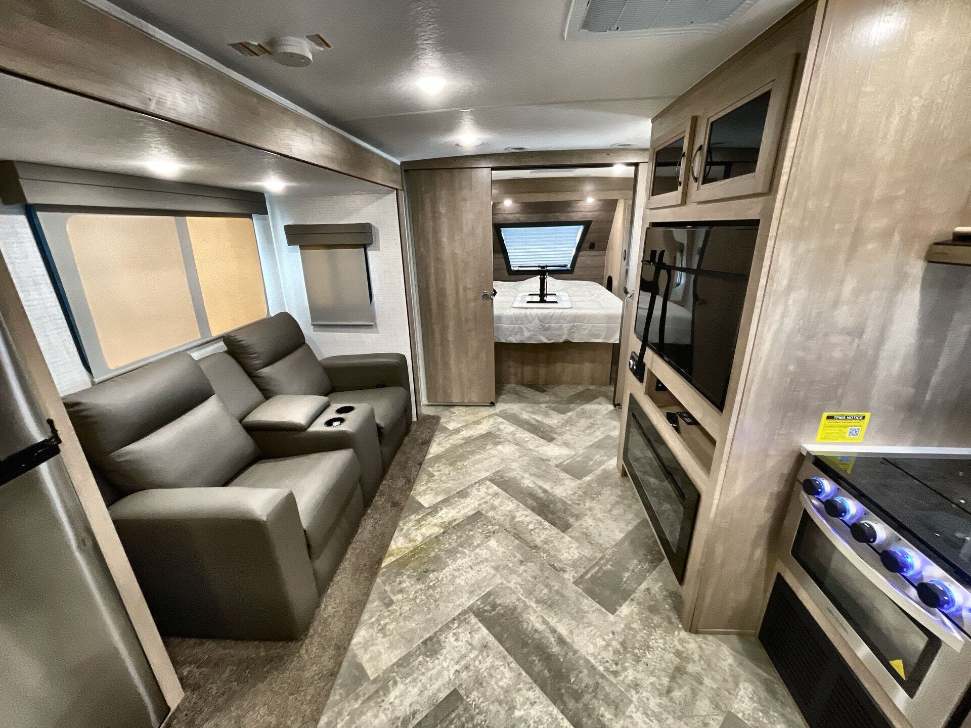 The Palomino 242RBS showcases a well-thought-out floorplan crafted for comfort and convenience. It features a Front Bedroom, Kitchen Island, Mid Living Area, and Rear Bath, all connected by an efficient flow that maximizes usable space. The layout includes a slide-out to expand the living area, creating a brighter, more open feel for dining and relaxing. An inviting kitchen area comes equipped for everyday cooking on the road, while a cozy living space and a TV offer easy entertainment after a day of exploration. This configuration is ideal for families or couples who value separate sleeping quarters and a functional, social living space.
