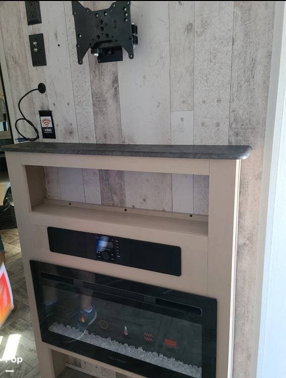 The living area has a sofa and dinette that can convert to a bed, an entertainment center, and an electric fireplace,
