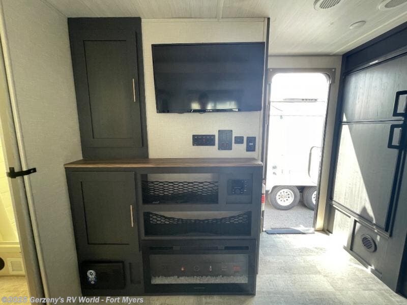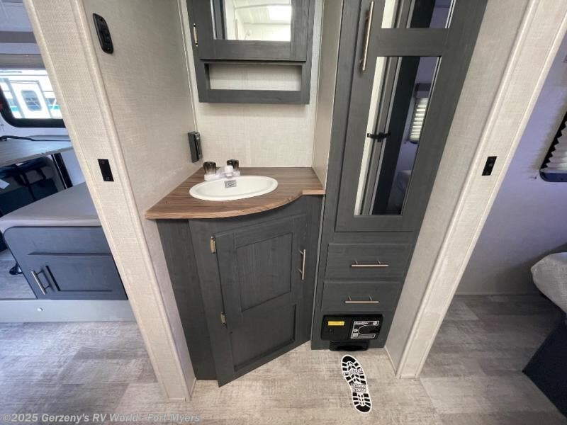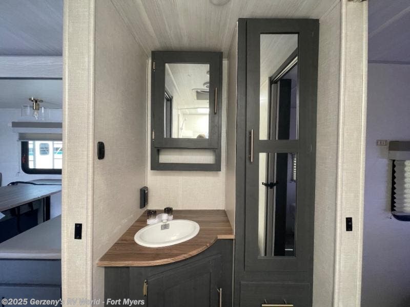 A private bedroom with a walk-around RV queen bed, a walk-through bathroom, and an outside kitchen are a few of the features that you are sure to want in your next RV! You can rest comfortably each night, plus all your clothing can be stored in the dual wardrobes to keep everything tidy. Everyone will stay clean with the full bathroom only steps away, and there is linen storage as well. The main living and kitchen area offers a slide out dinette that can also sleep one more camper. The rear kitchen provides everything you will need, plus the outside kitchen with an outdoor griddle and sink gives you more choices. Step inside to start planning your weekend trip!