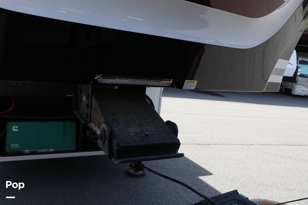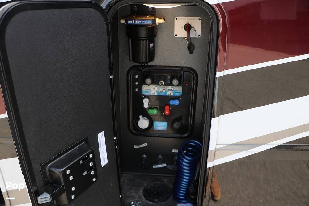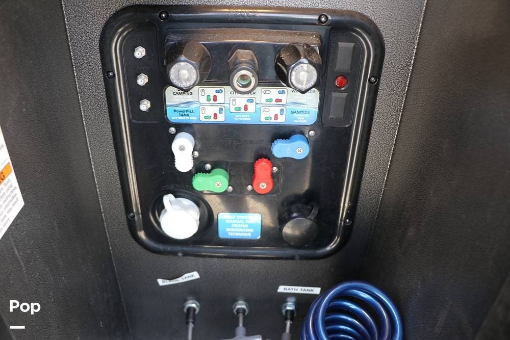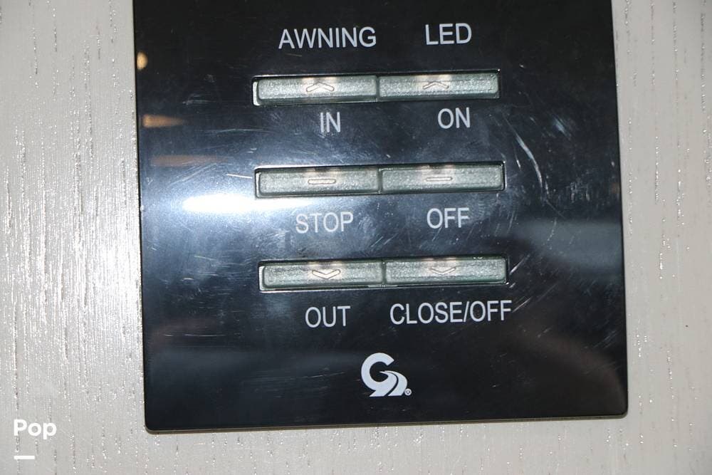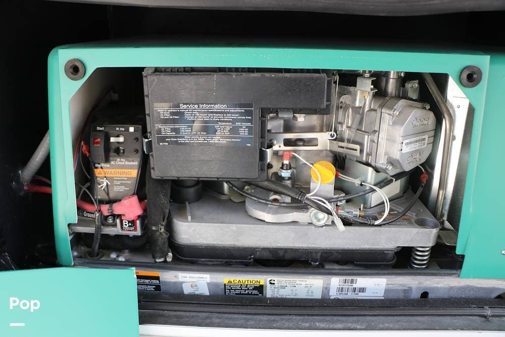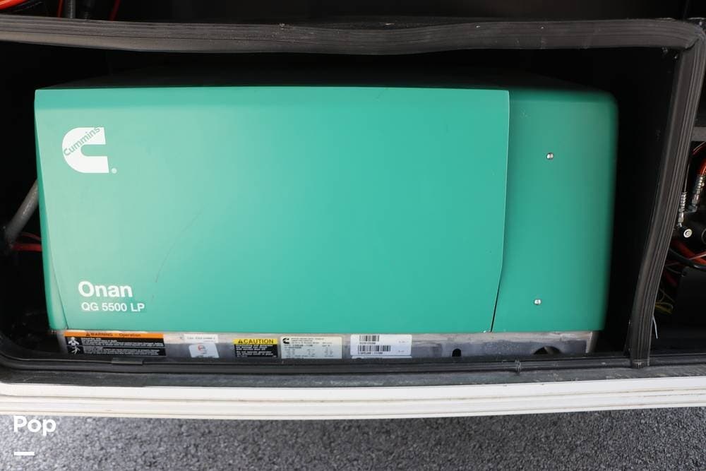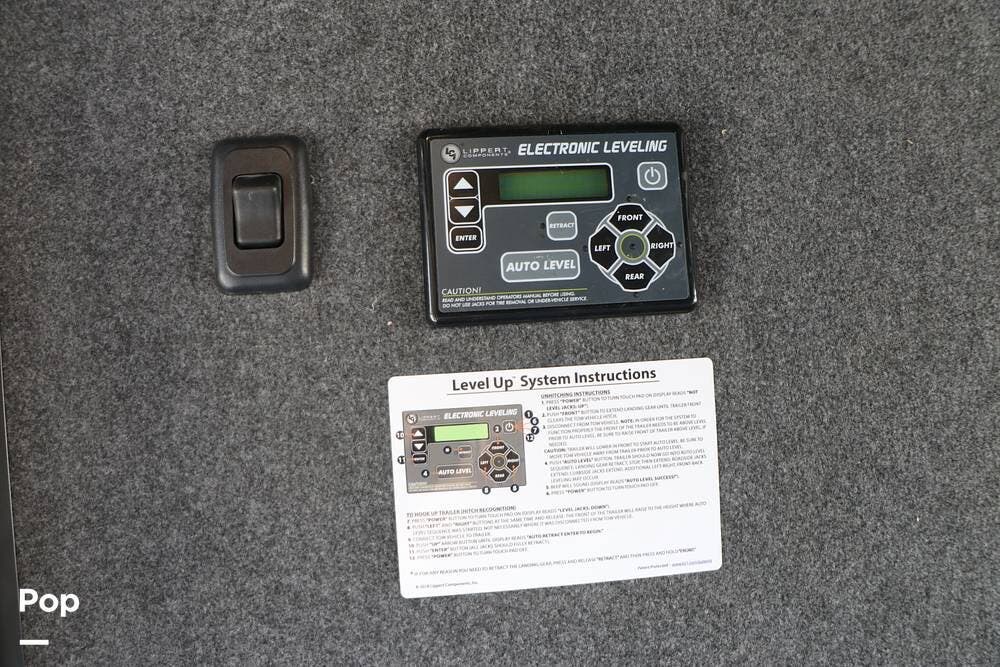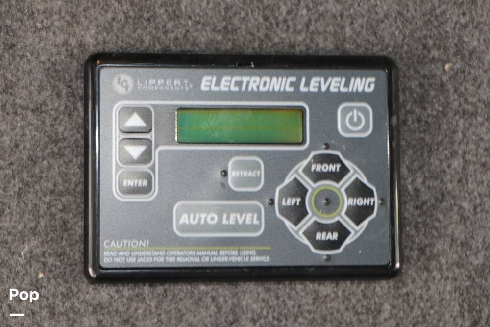 Outside, the Full-Body Paint is gorgeous, and the unit is equipped with a 5,500 Onan LP generator that is like new and fires right up using the propane system. There is a large, full-width storage bay with a slide-out storage tray. The power cord features a power take-up reel, in addition to a six-point auto leveling system, making setup and breakdown quick and easy. All systems are clearly marked and easily accessible throughout the unit.