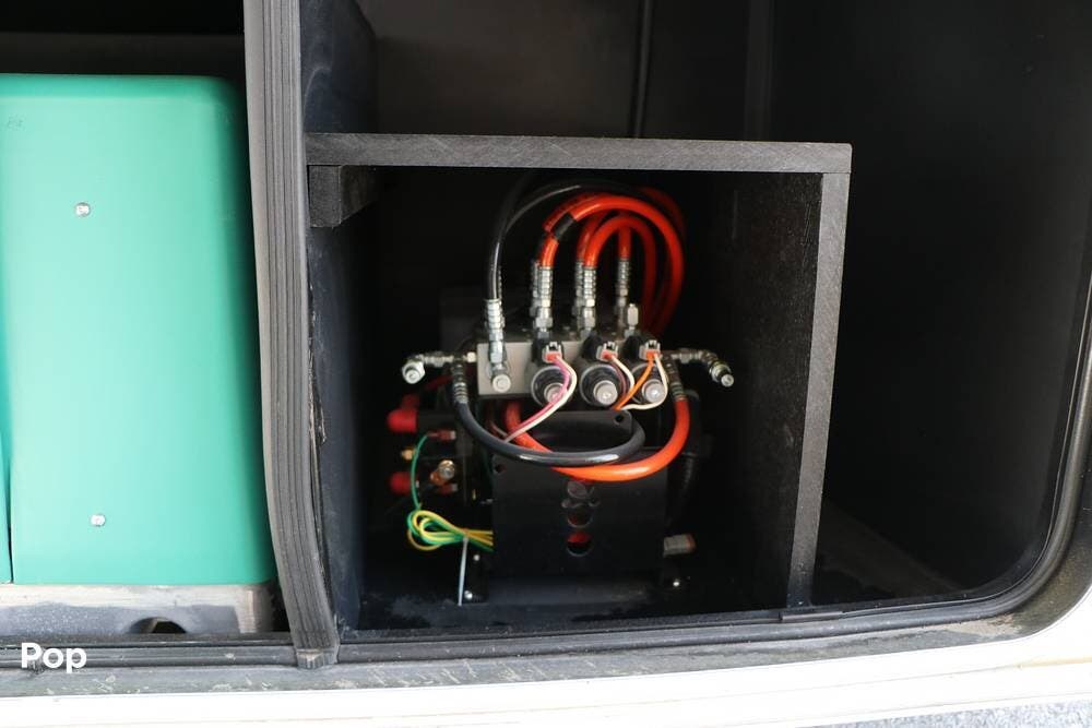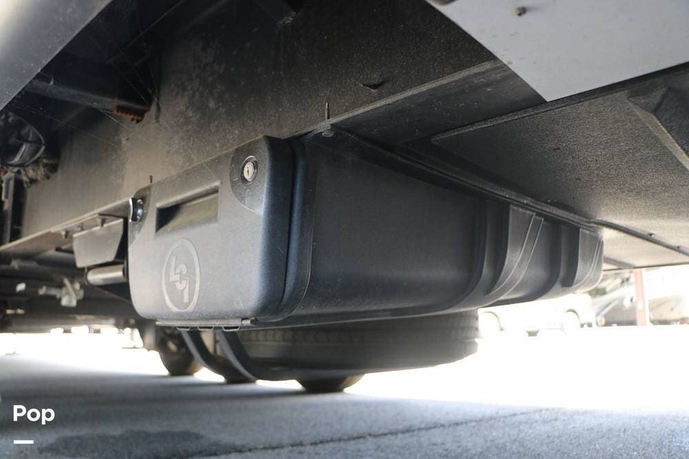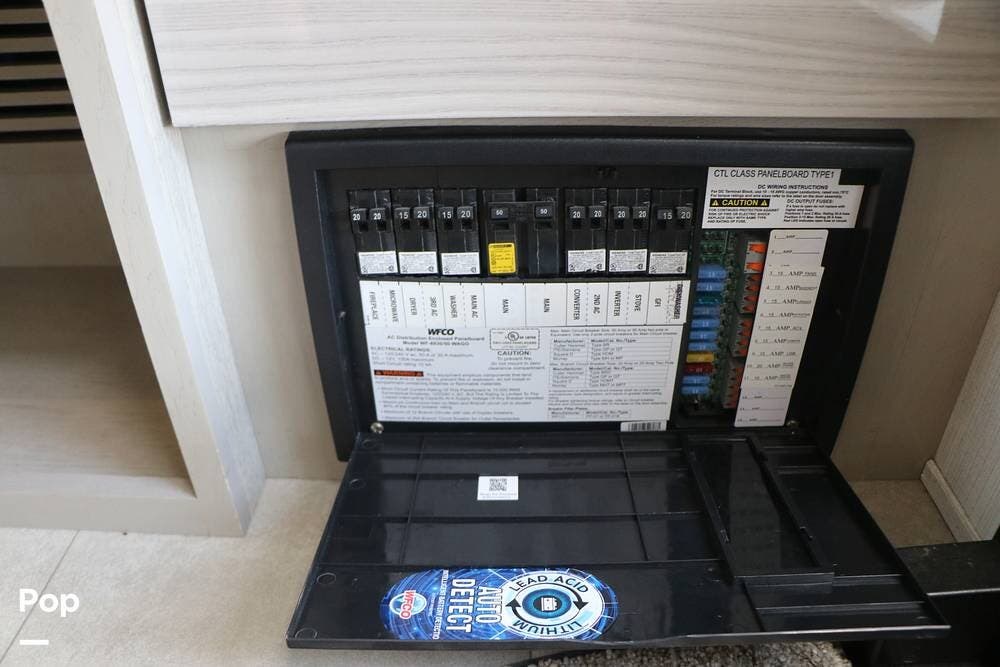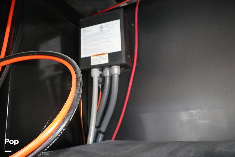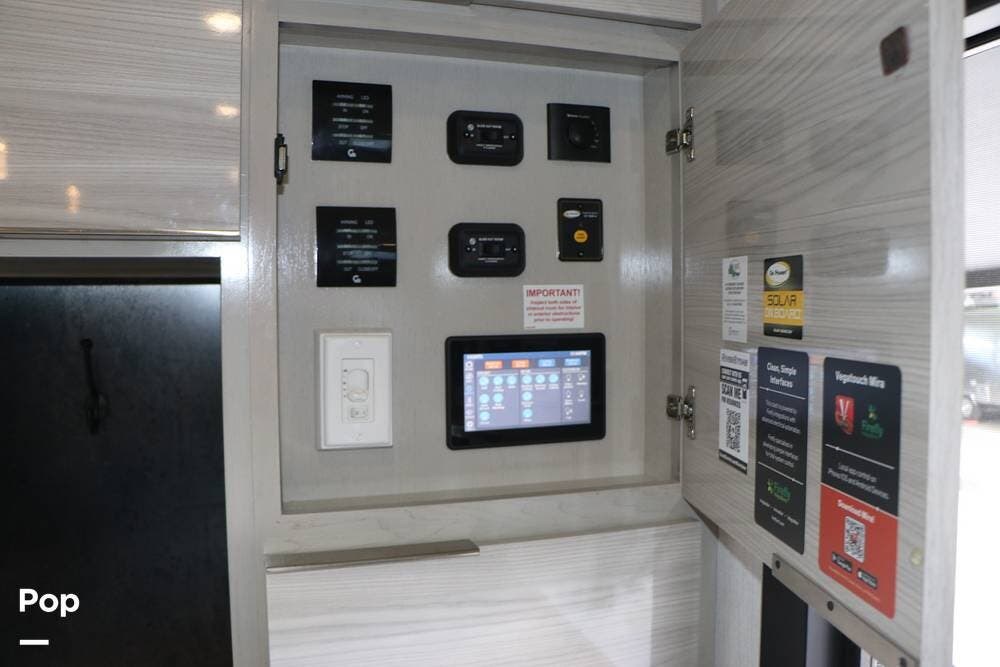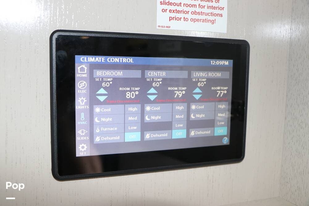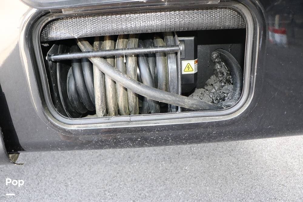 Outside, the Full-Body Paint is gorgeous, and the unit is equipped with a 5,500 Onan LP generator that is like new and fires right up using the propane system. There is a large, full-width storage bay with a slide-out storage tray. The power cord features a power take-up reel, in addition to a six-point auto leveling system, making setup and breakdown quick and easy. All systems are clearly marked and easily accessible throughout the unit.