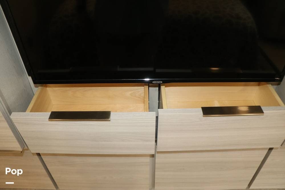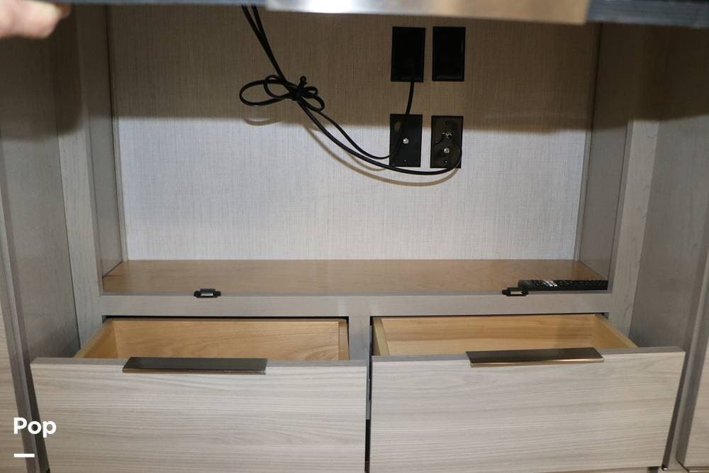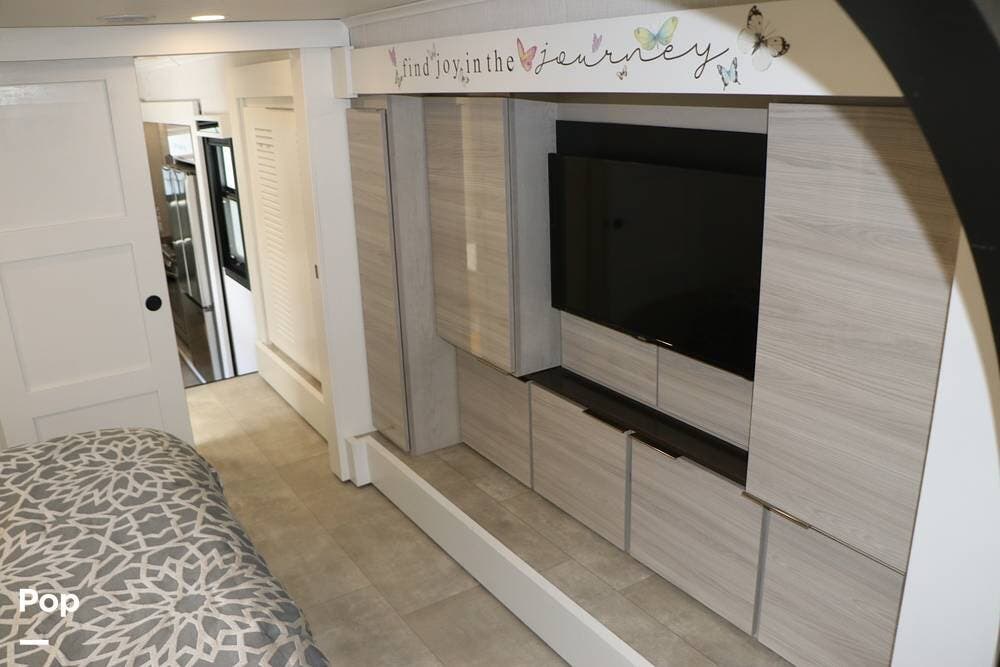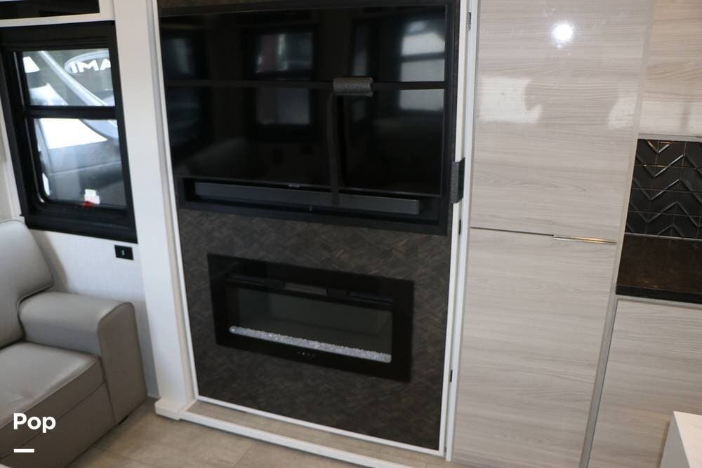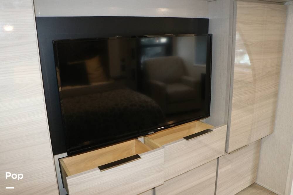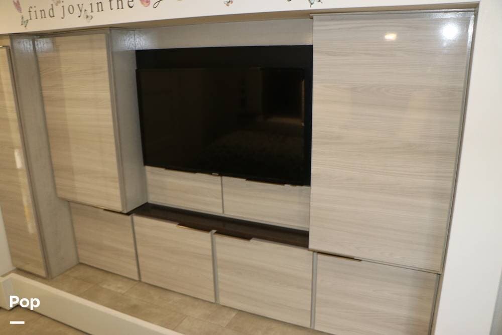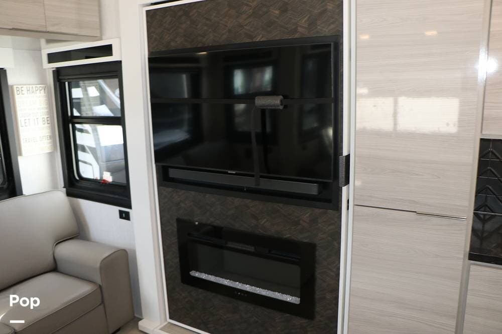 The floor plan features a spacious living area with a galley and a Rear Living area that includes a large entertainment center with full floor-to-ceiling storage space behind it. The entertainment center is complemented by a large flat-screen TV, stereo system, and electric fireplace that can be used for both heating and ambiance. The lovely cabinetry throughout the unit shows the attention to detail that makes a huge difference in the quality of your living and storage areas.