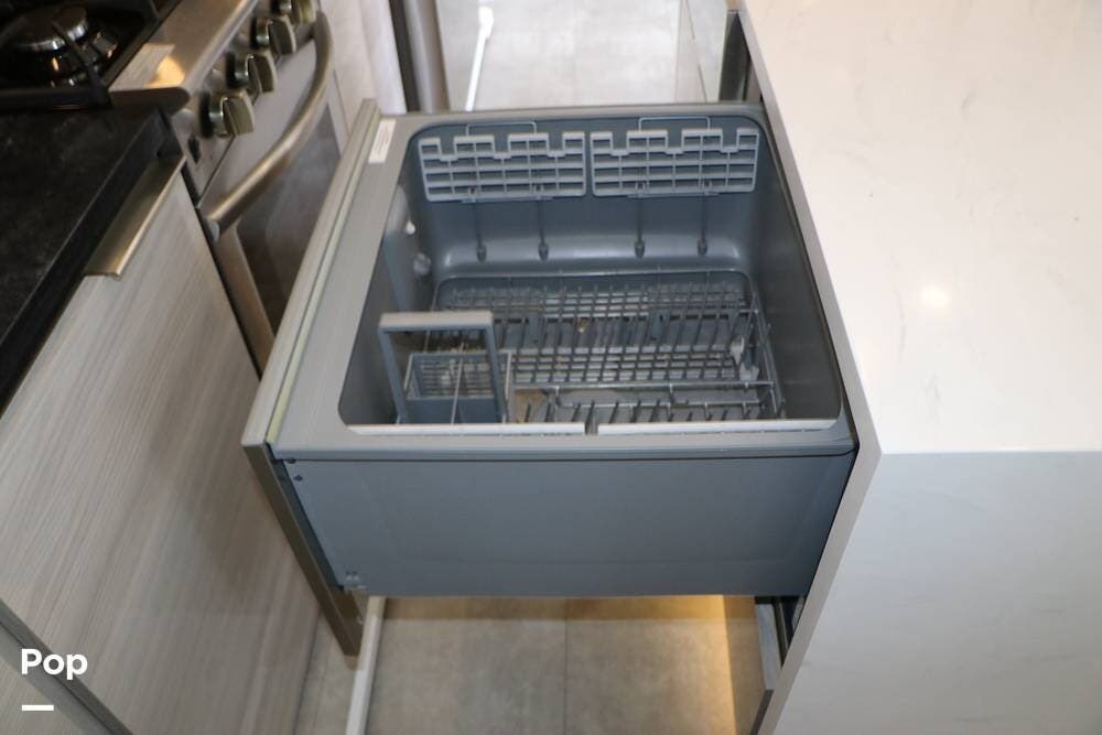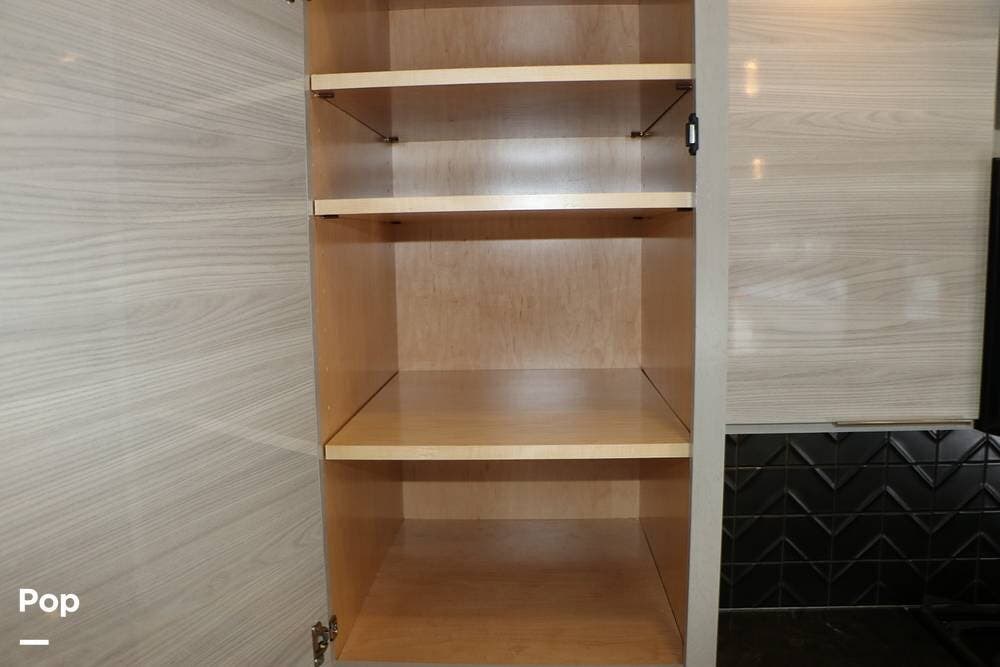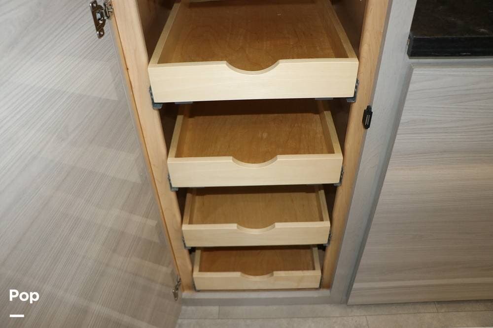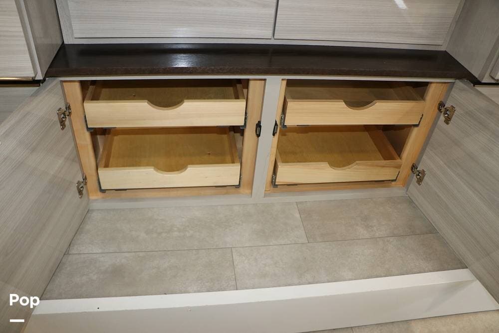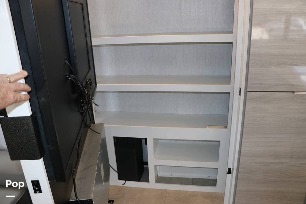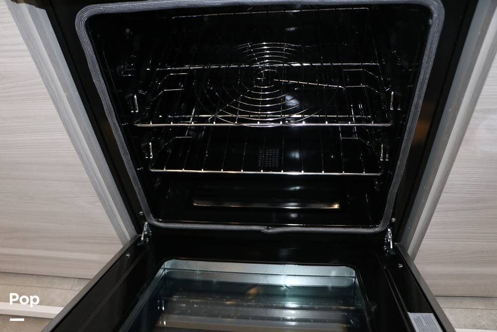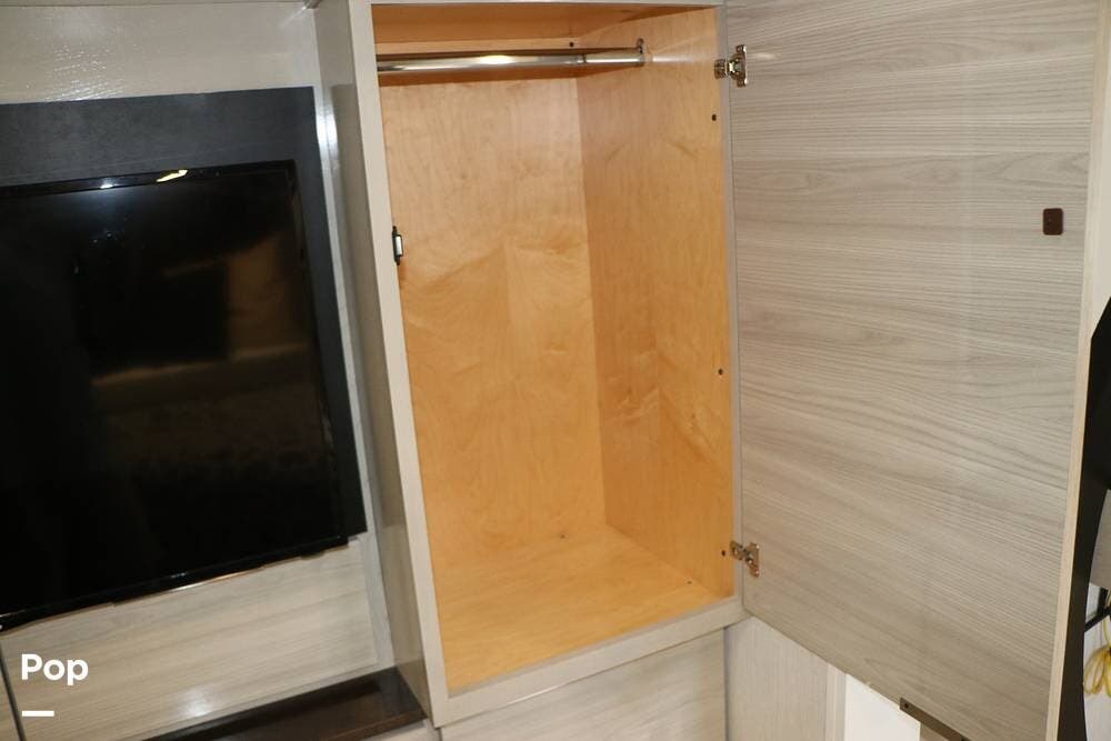 The floor plan features a spacious living area with a galley and a Rear Living area that includes a large entertainment center with full floor-to-ceiling storage space behind it. The entertainment center is complemented by a large flat-screen TV, stereo system, and electric fireplace that can be used for both heating and ambiance. The lovely cabinetry throughout the unit shows the attention to detail that makes a huge difference in the quality of your living and storage areas.